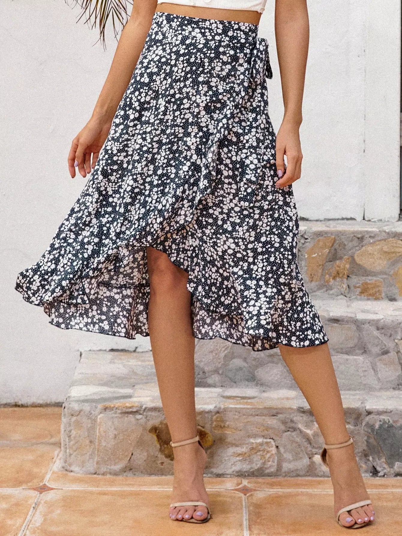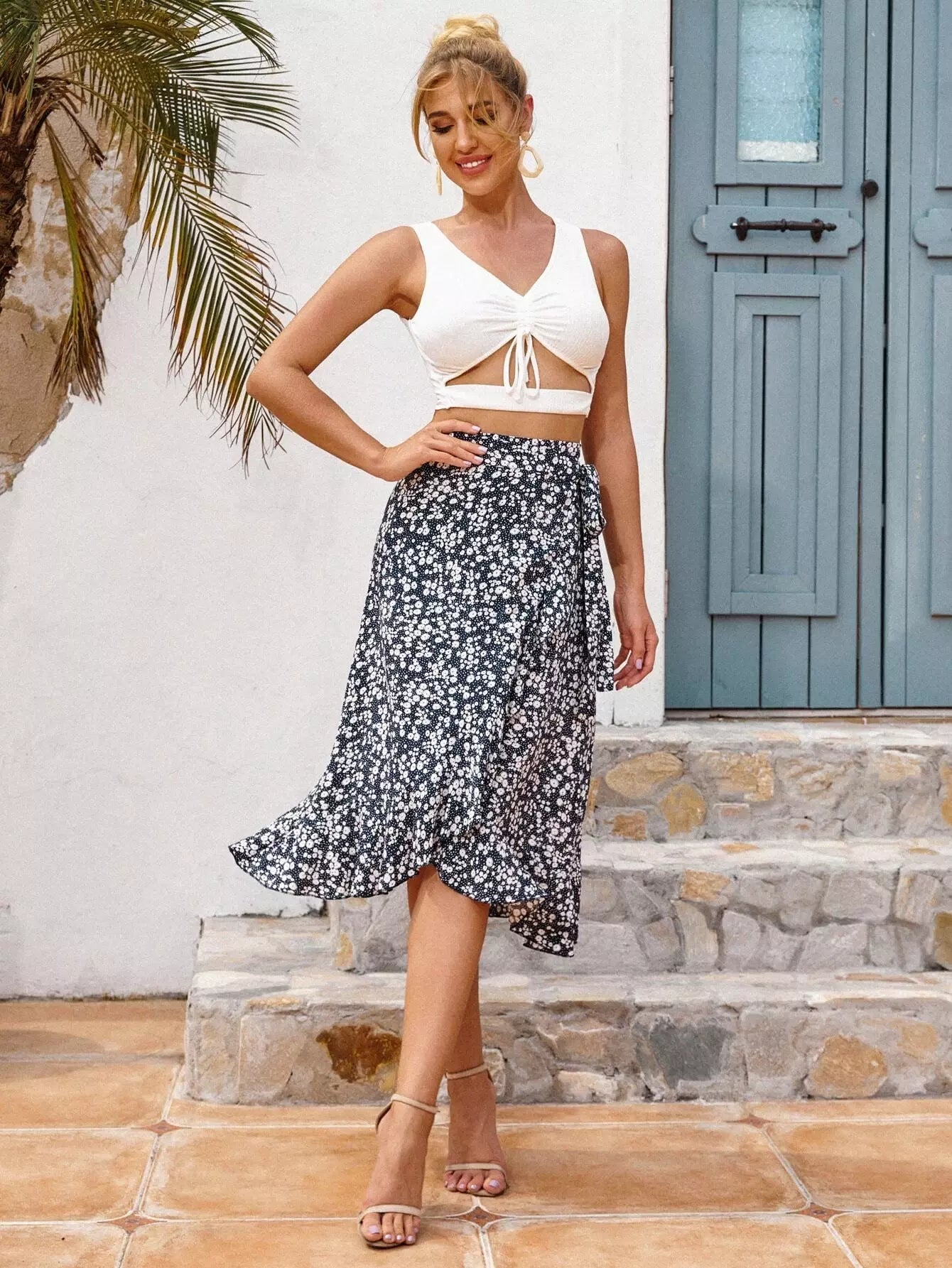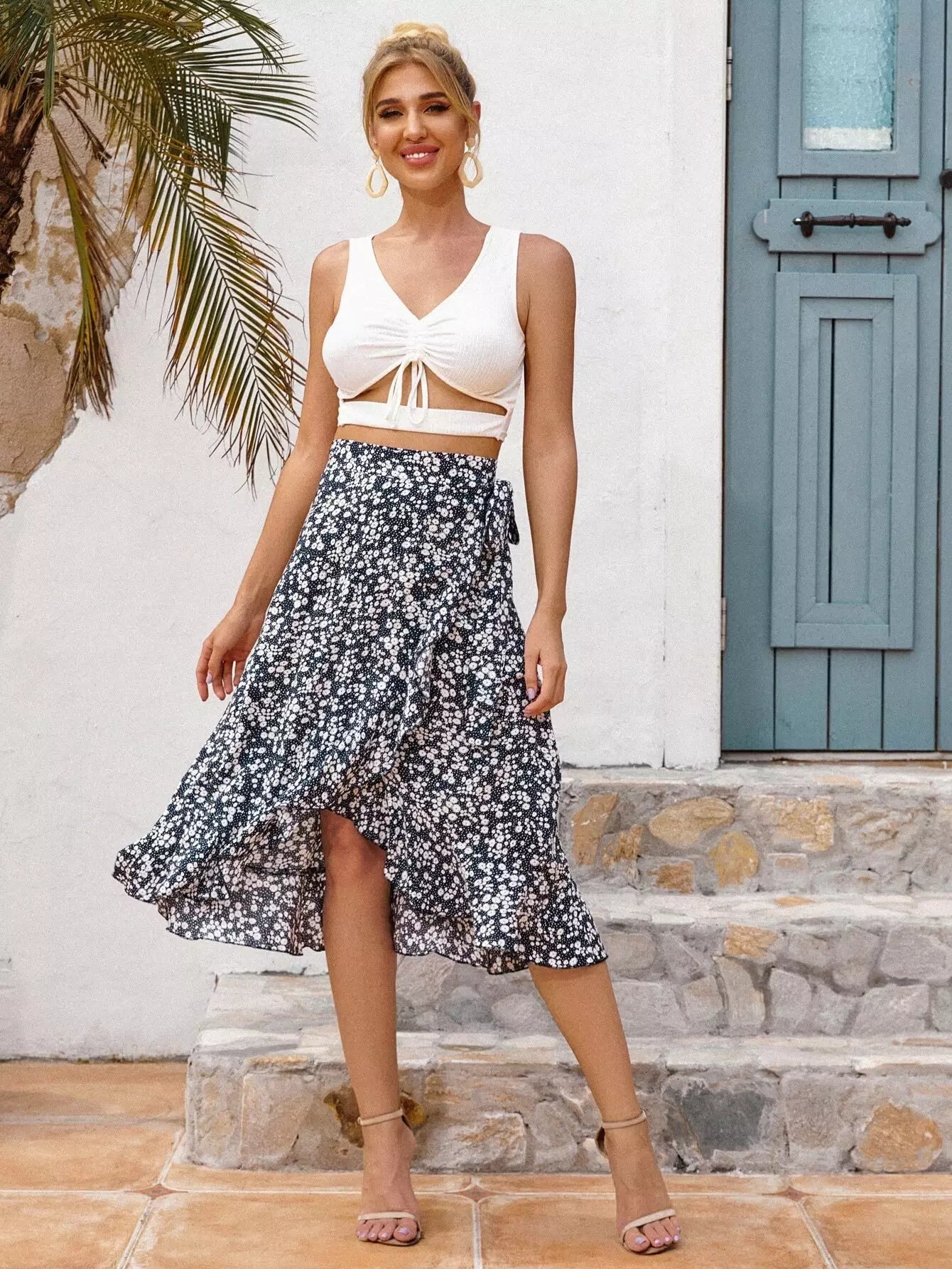 النساء - تنورة ملفوفة بكشكشة جانبية وربطة عنق على شكل زهور من Ditsy