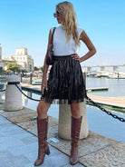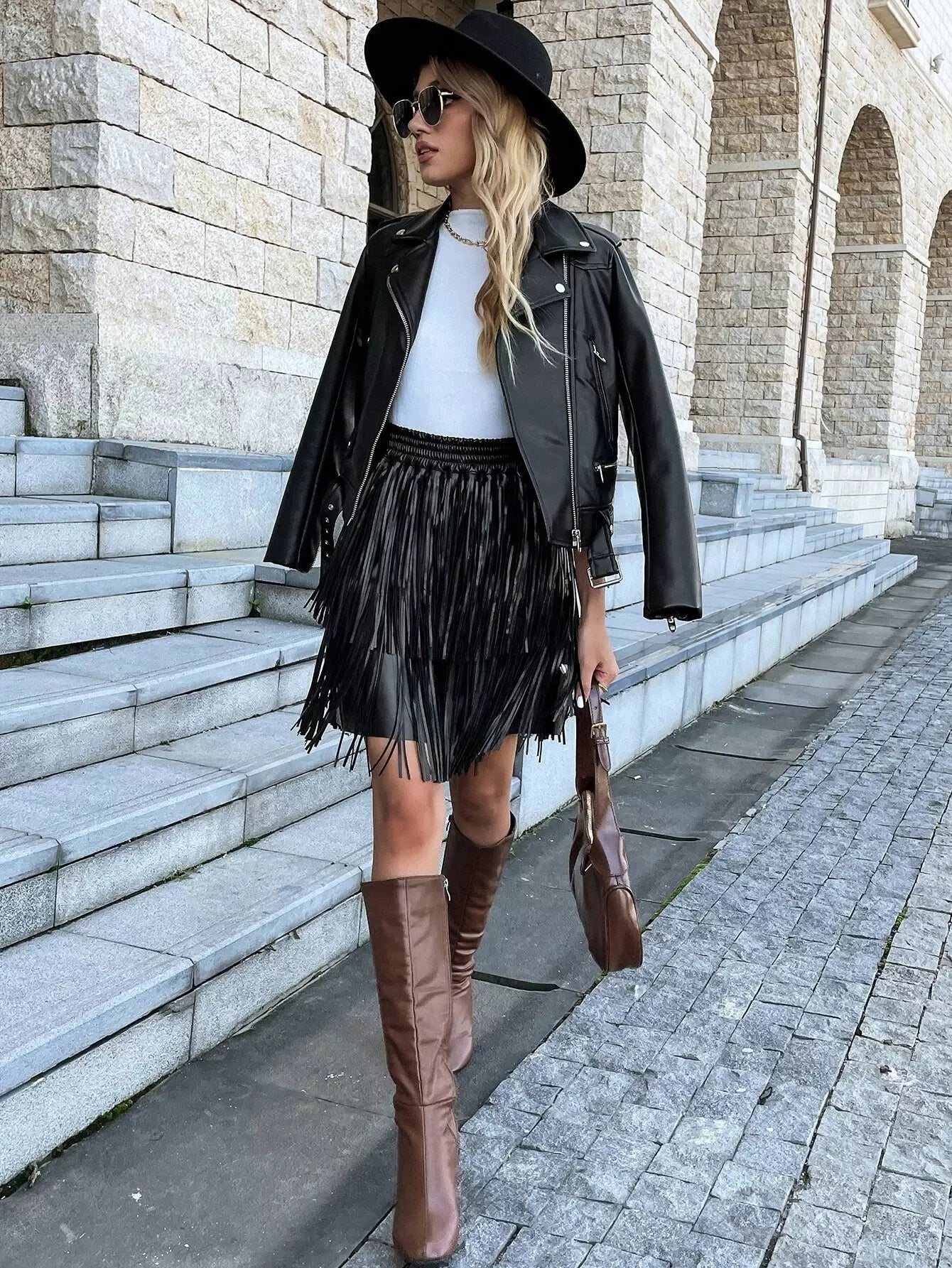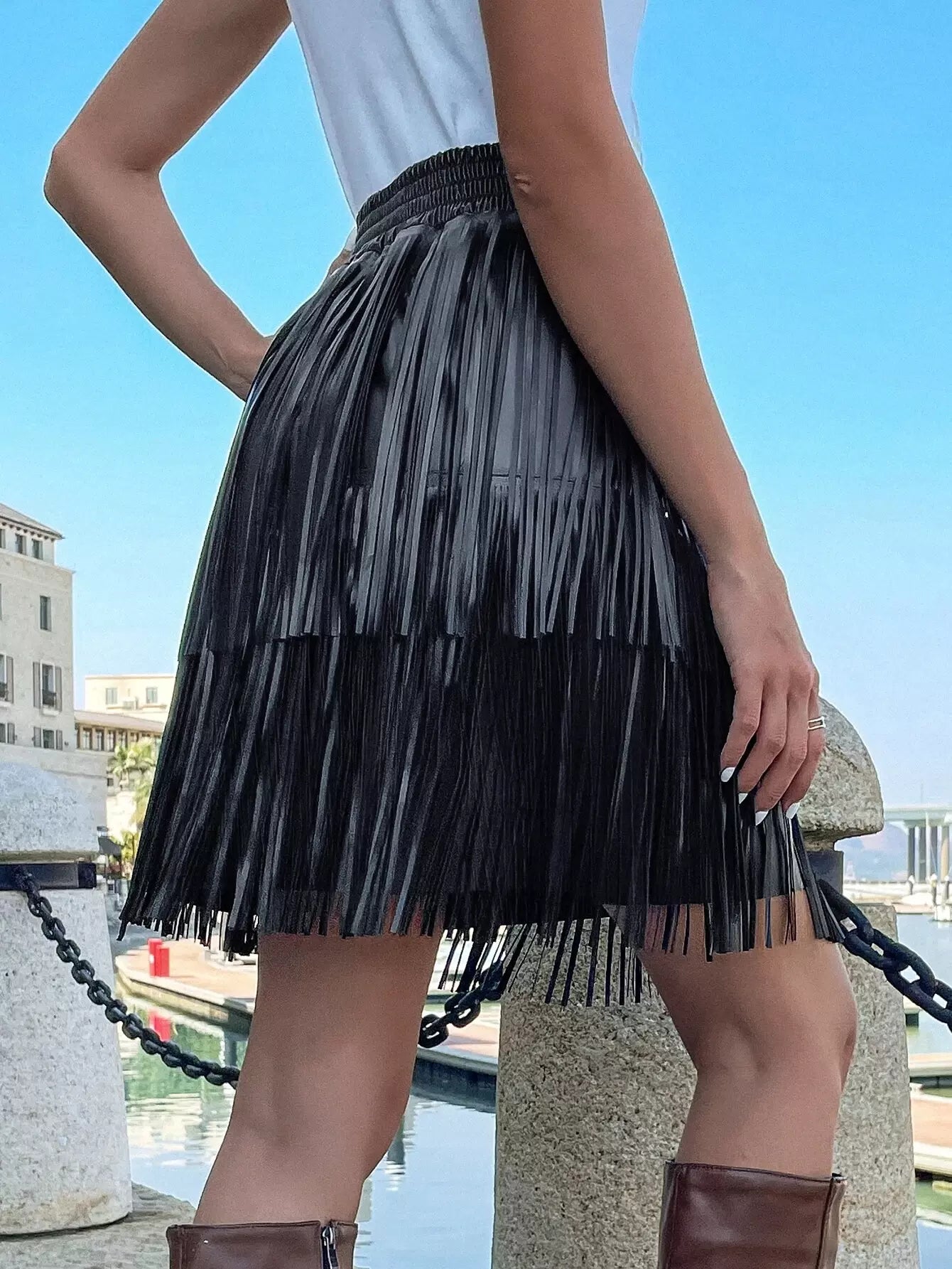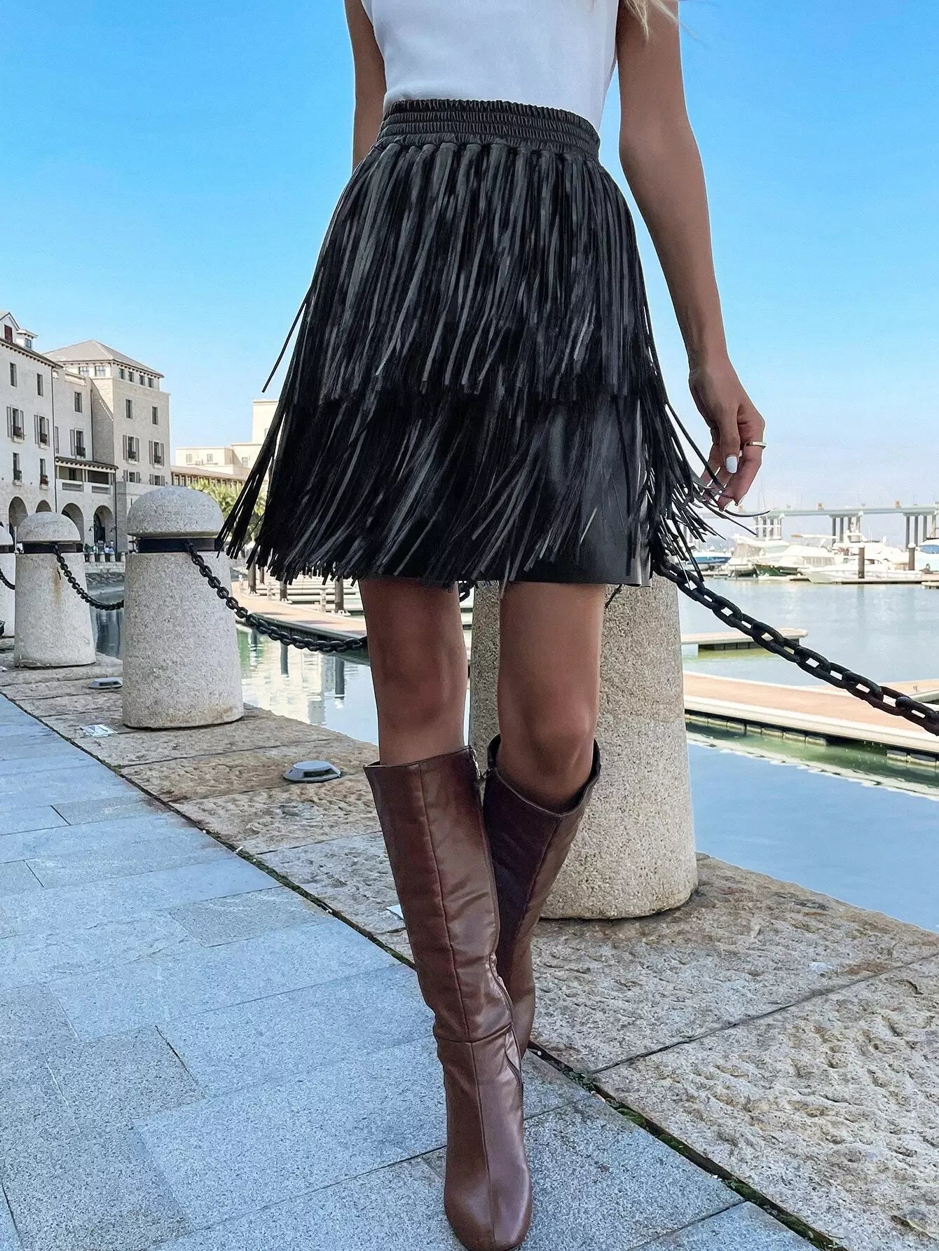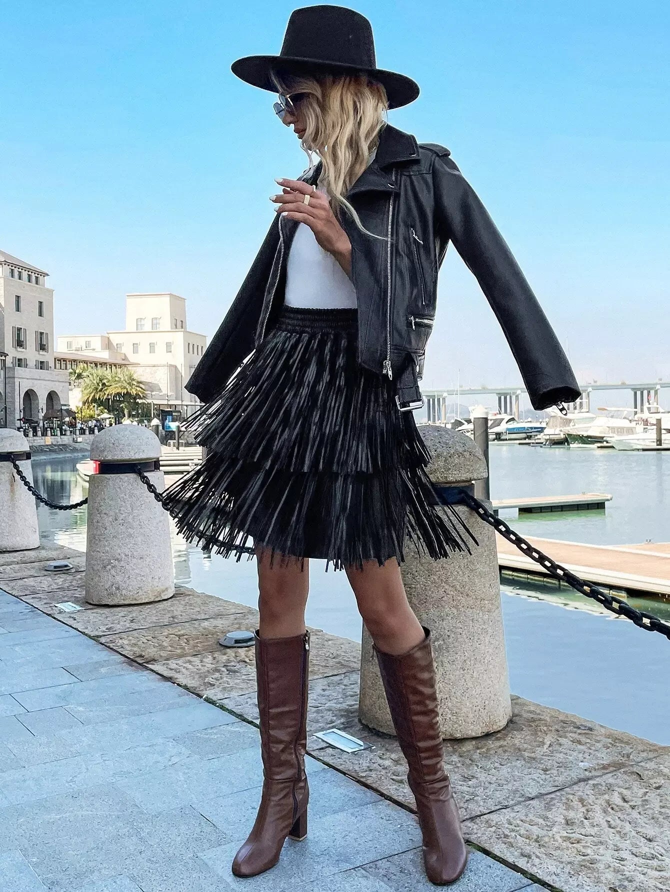 تنورة جلدية من جلد البولي يوريثان مرنة الخصر ذات طبقات من الشراشيب