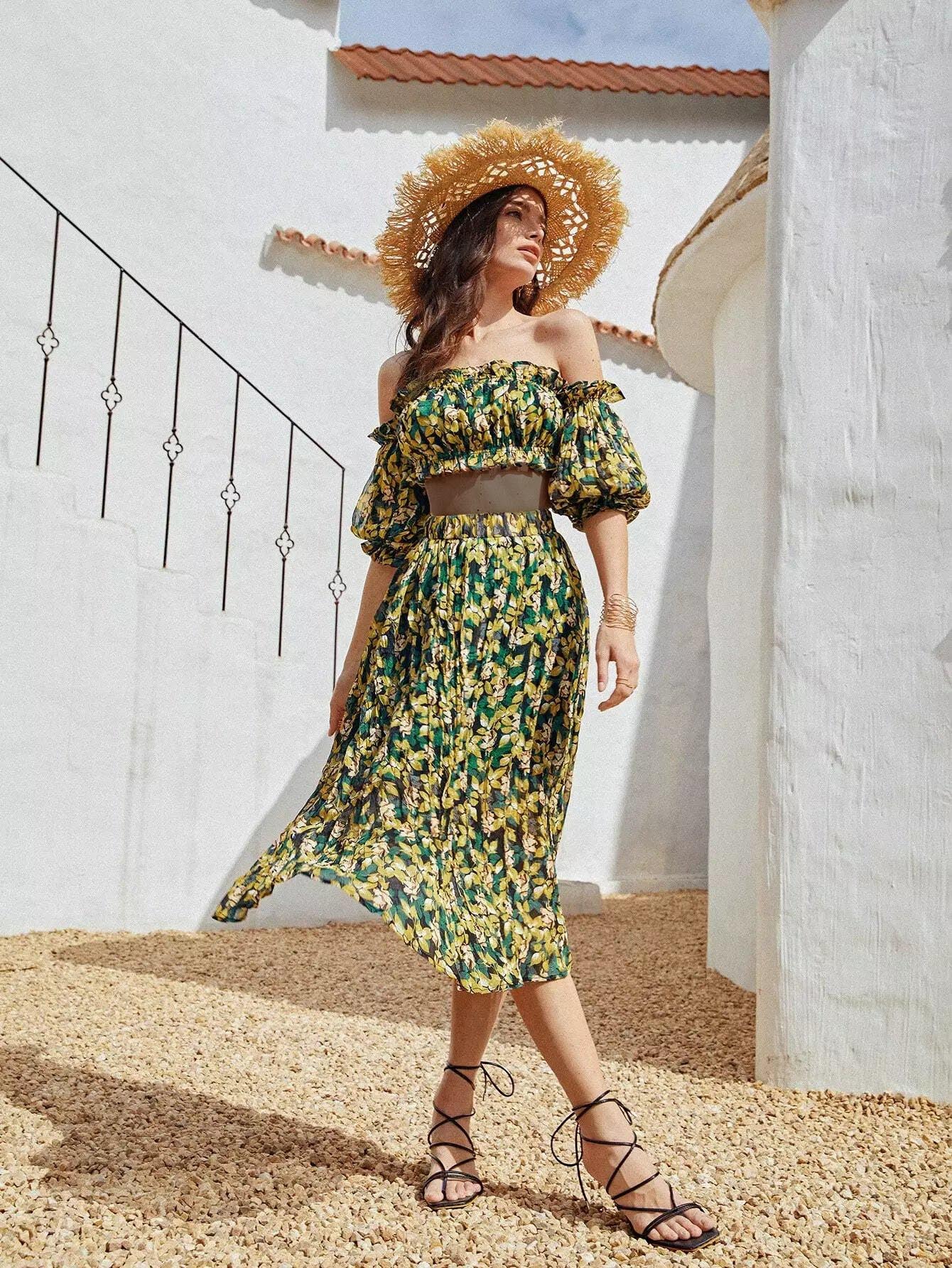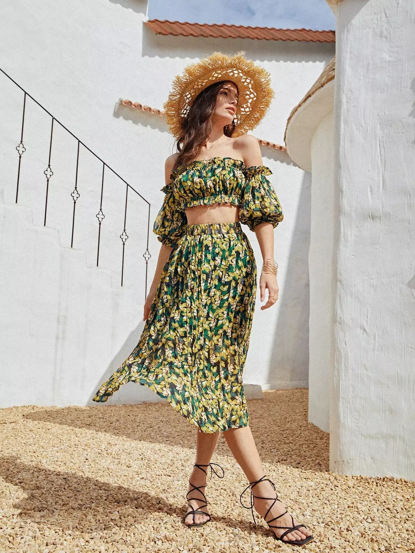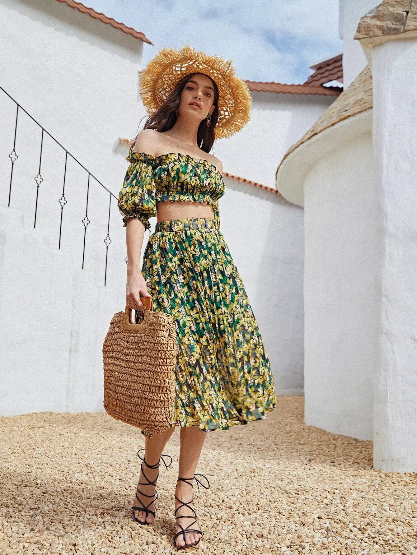 تنورة مطوية بخصر مطاطي مزينة بالزهور