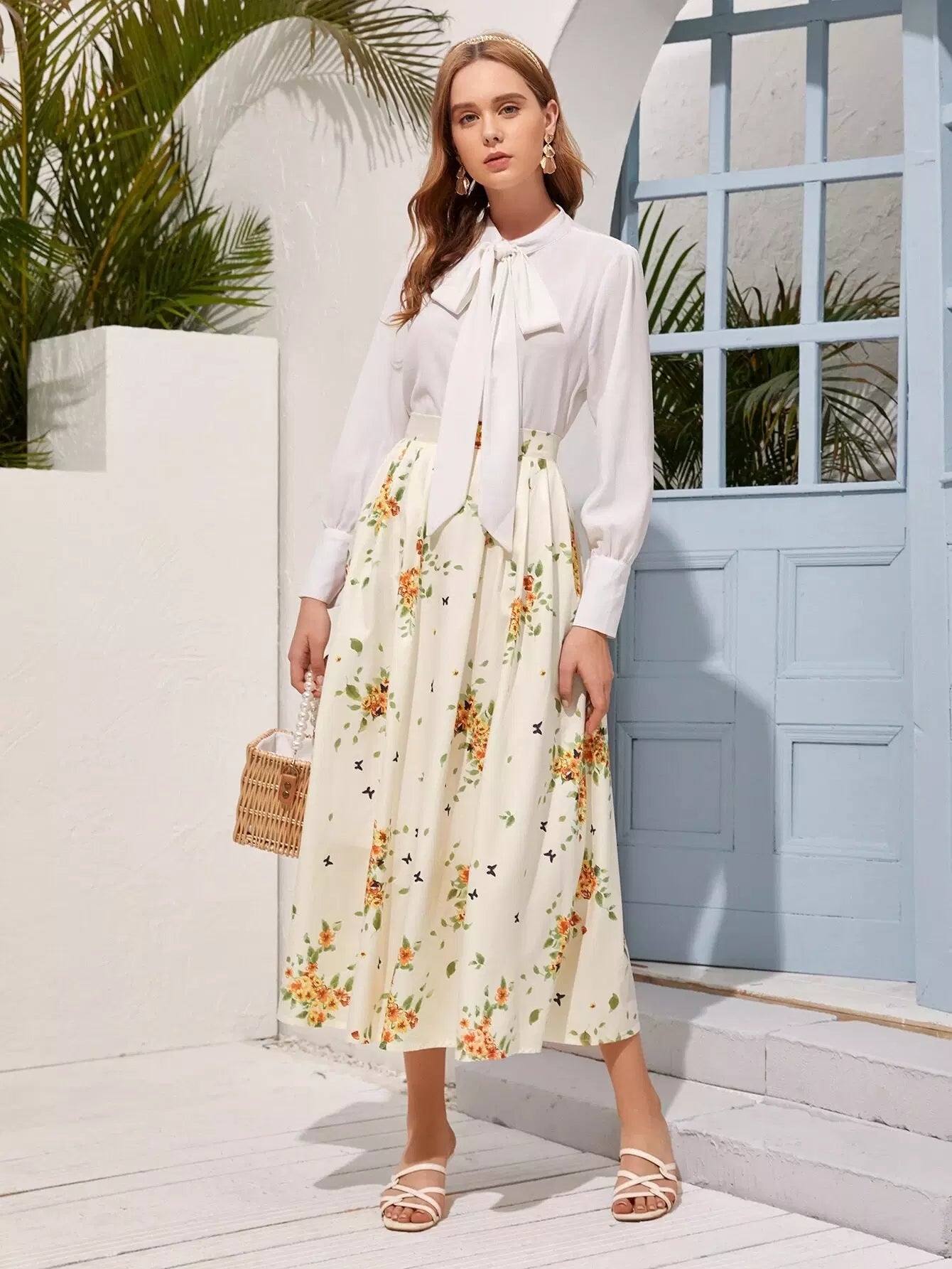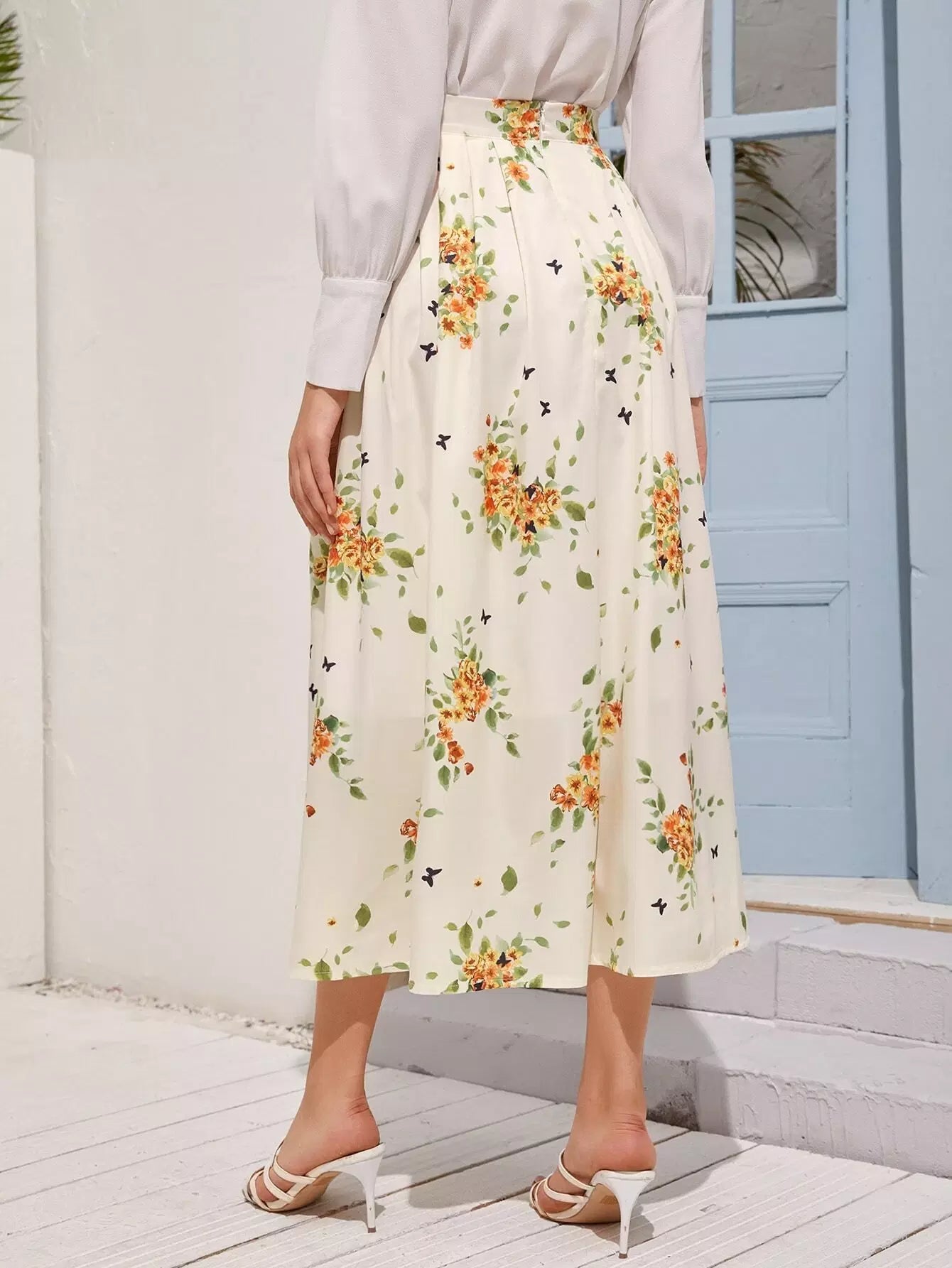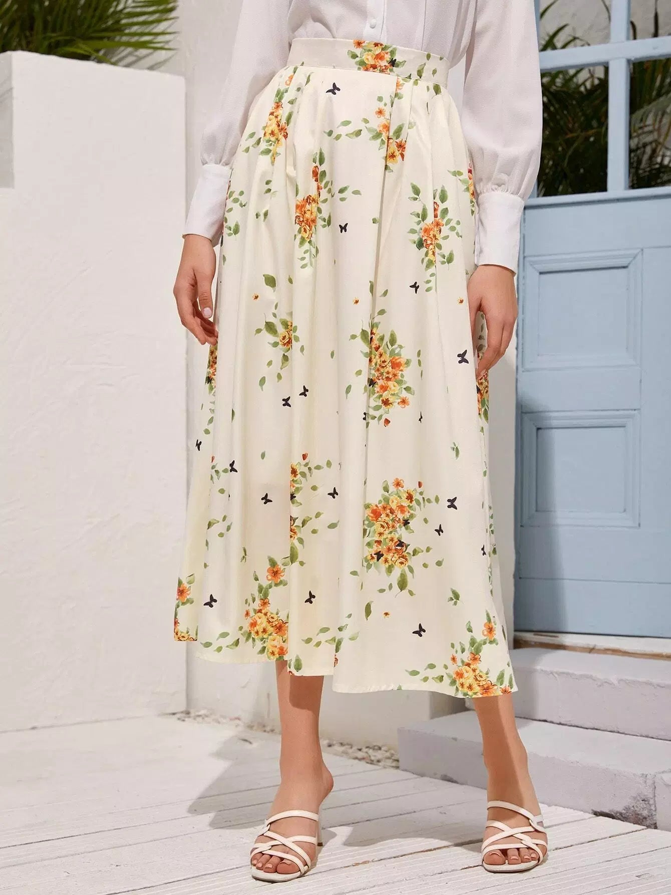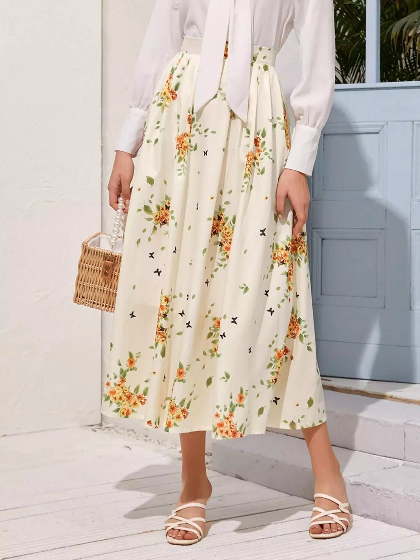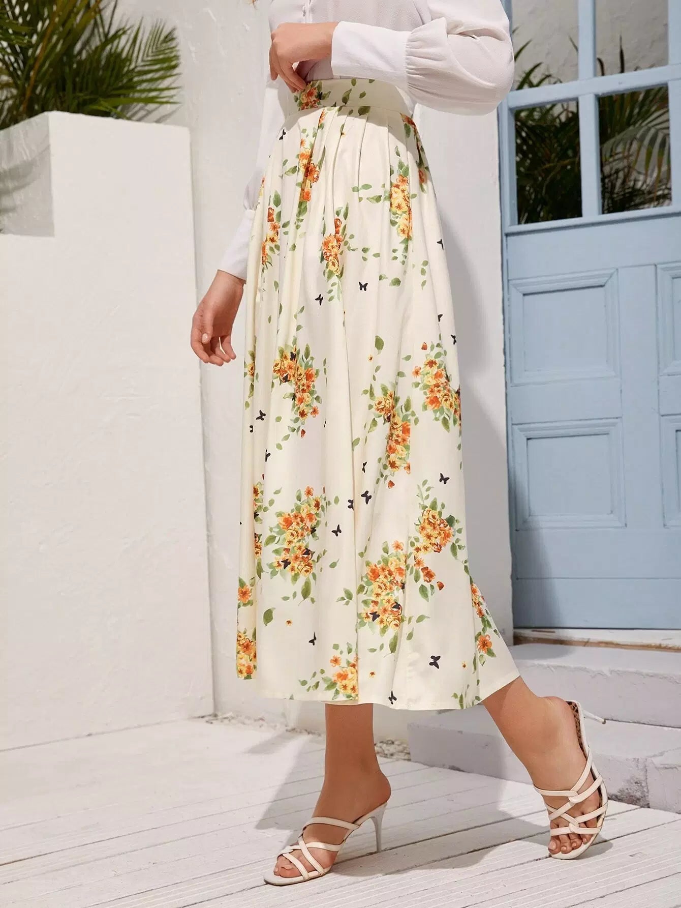تنورة واسعة عالية الخصر مطبوع عليها زهور مطبوع عليها زهور