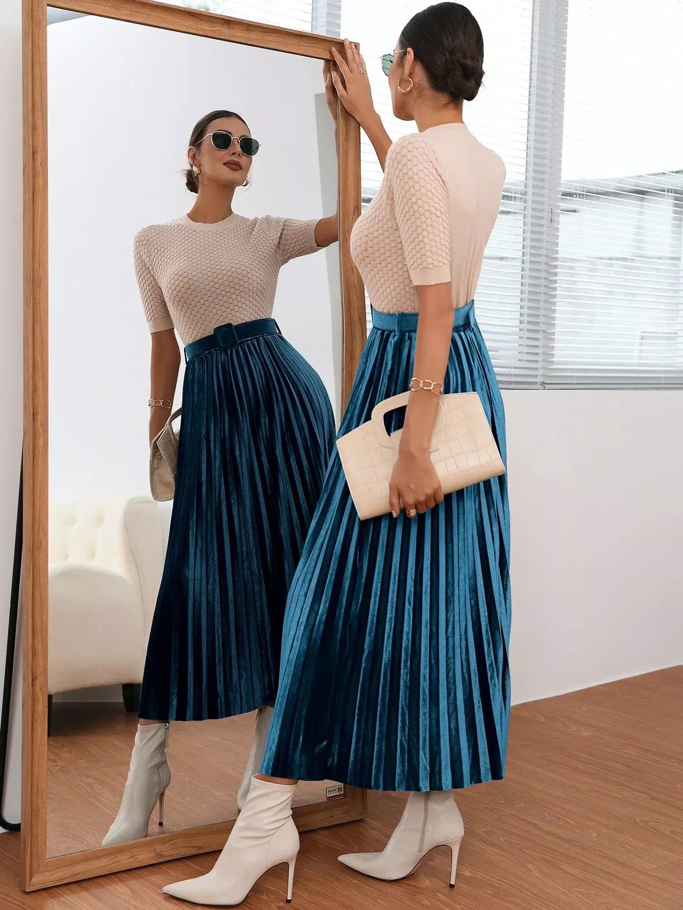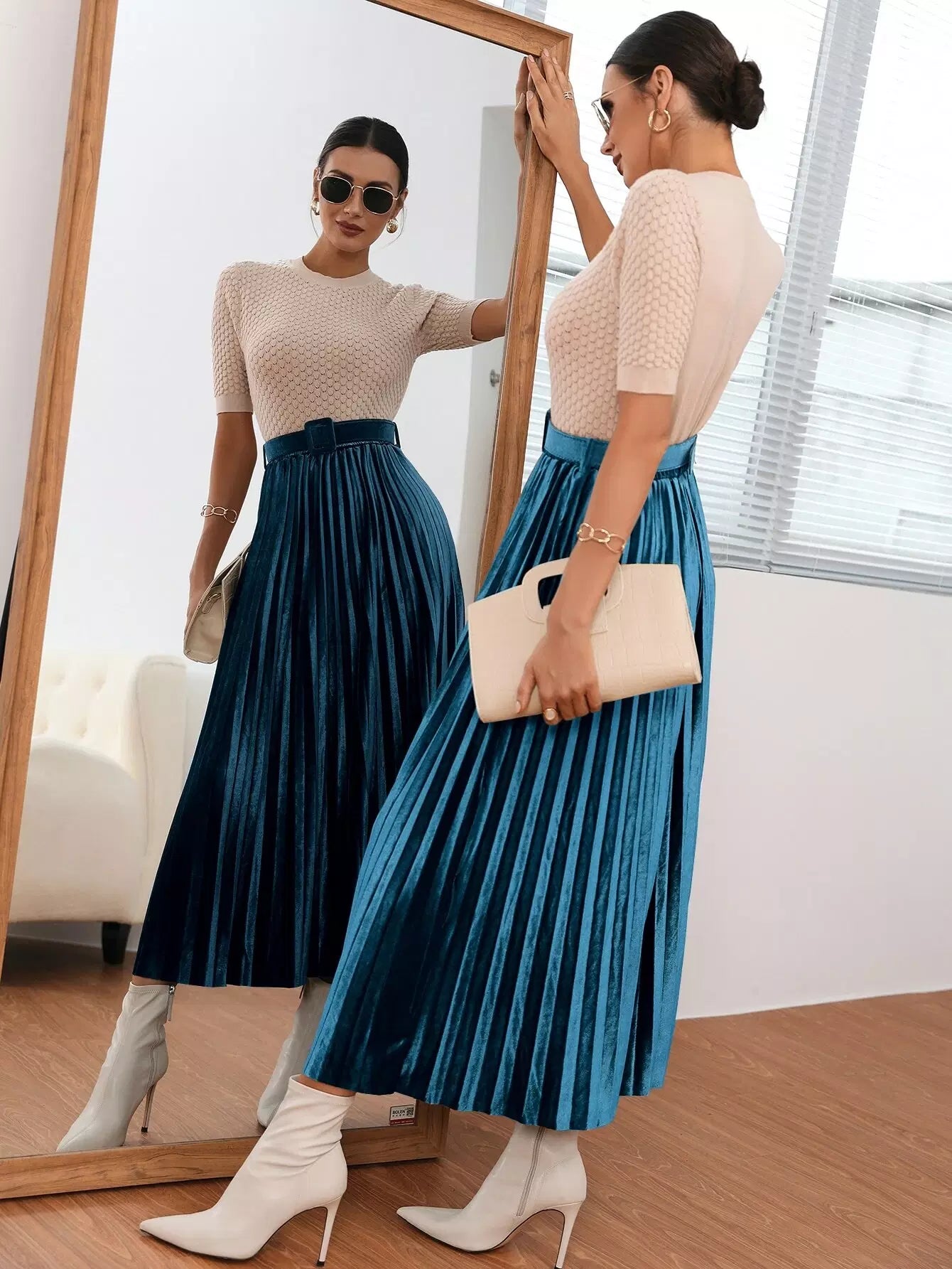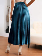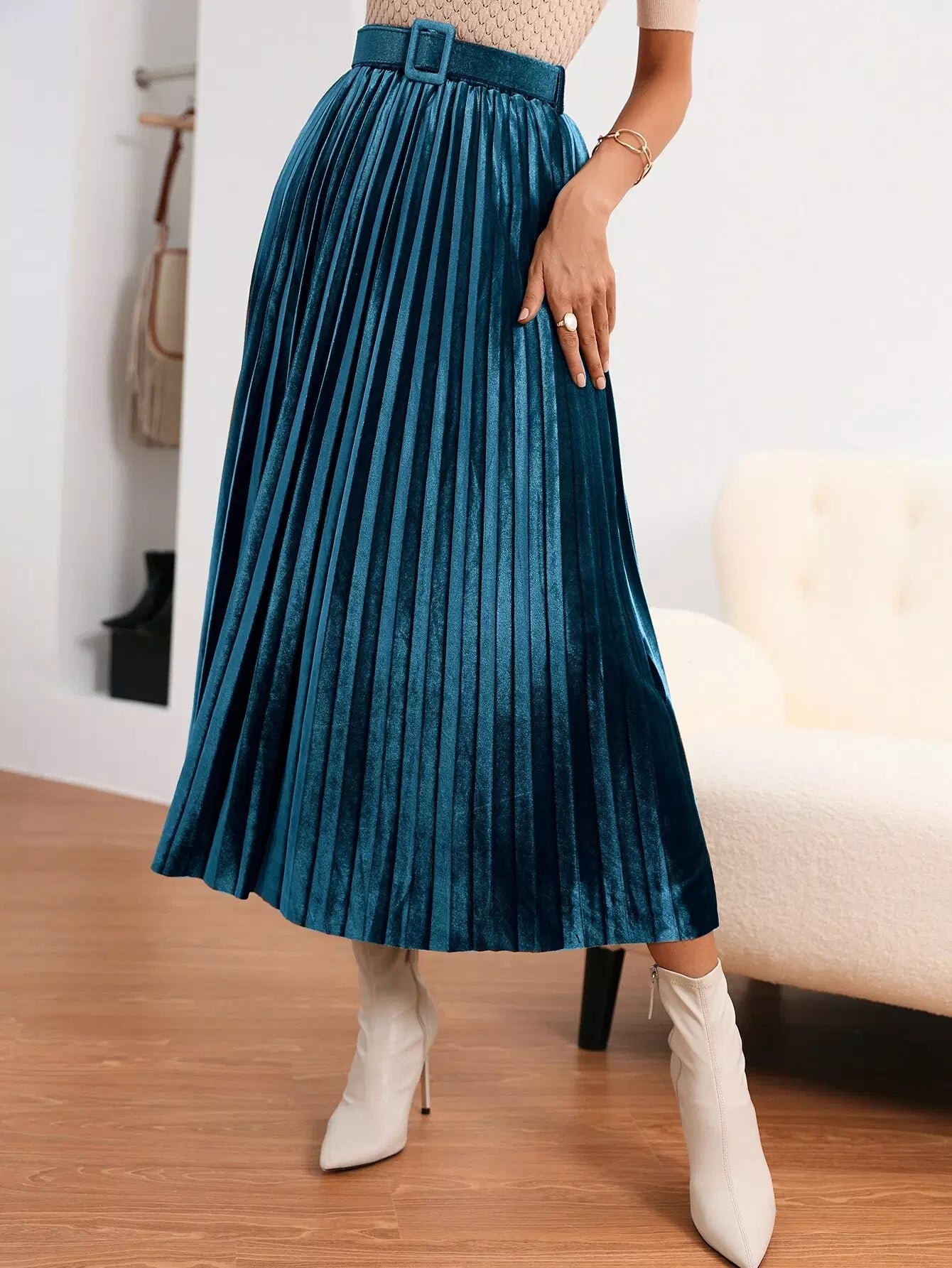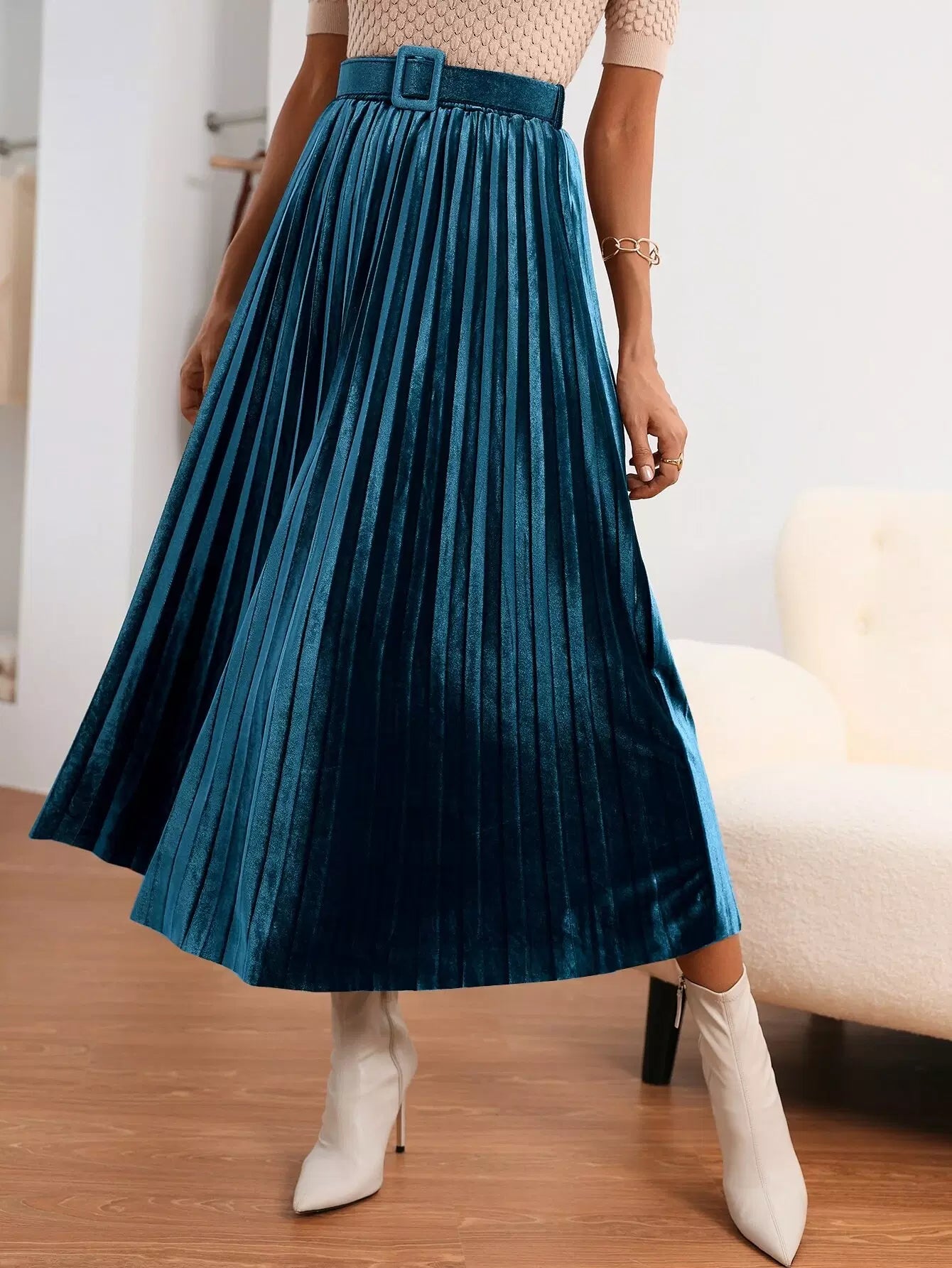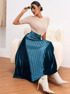تنورة مخملية عالية الخصر بإبزيم ومطويات بدون حزام