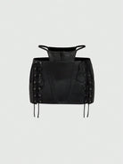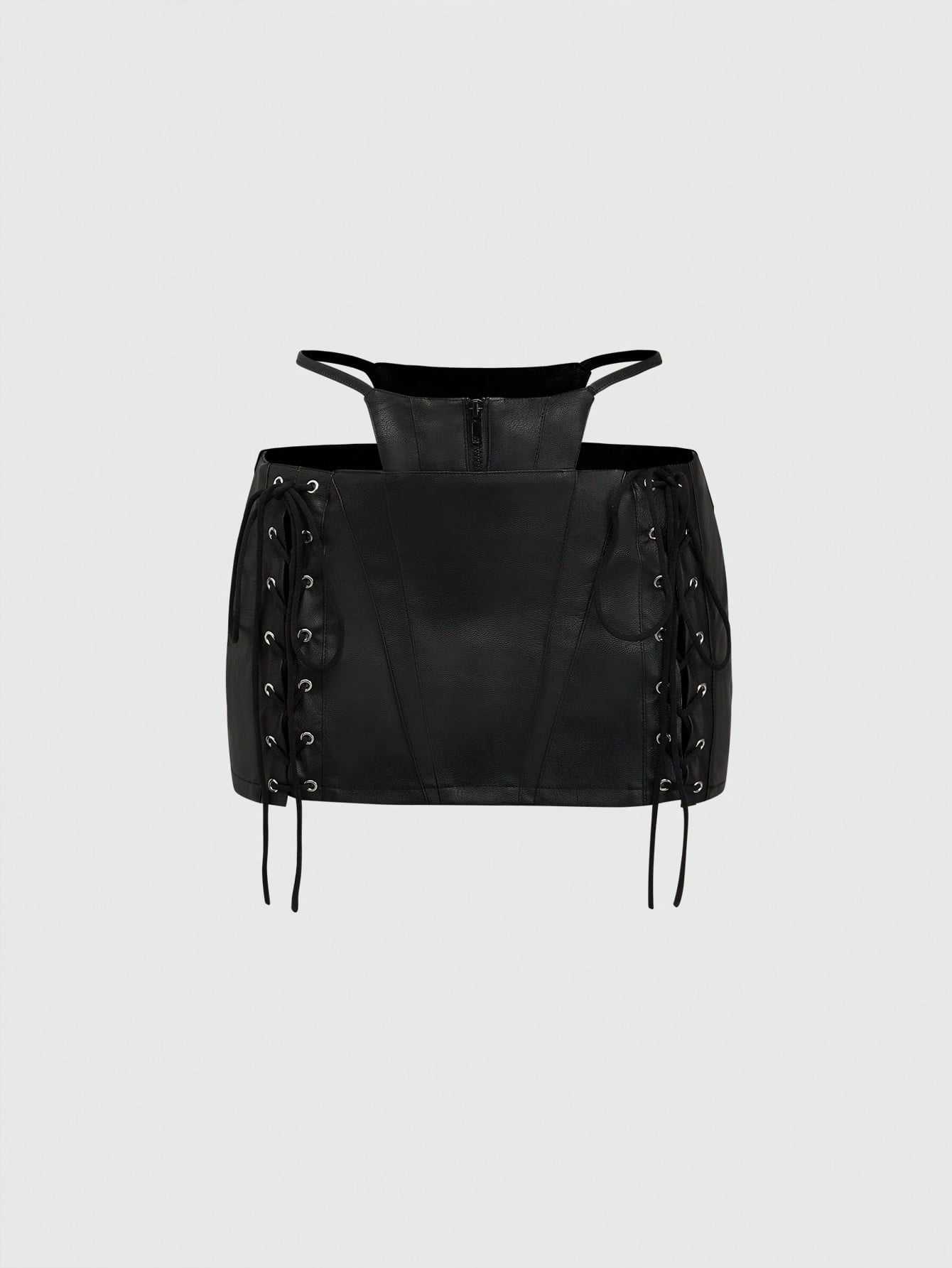 ROMWE Grunge Punk Futuristic Sexy Super Low Waist 2 In 1 Drawstring Design PU Leather Mini Skirt