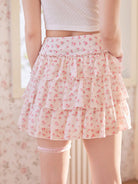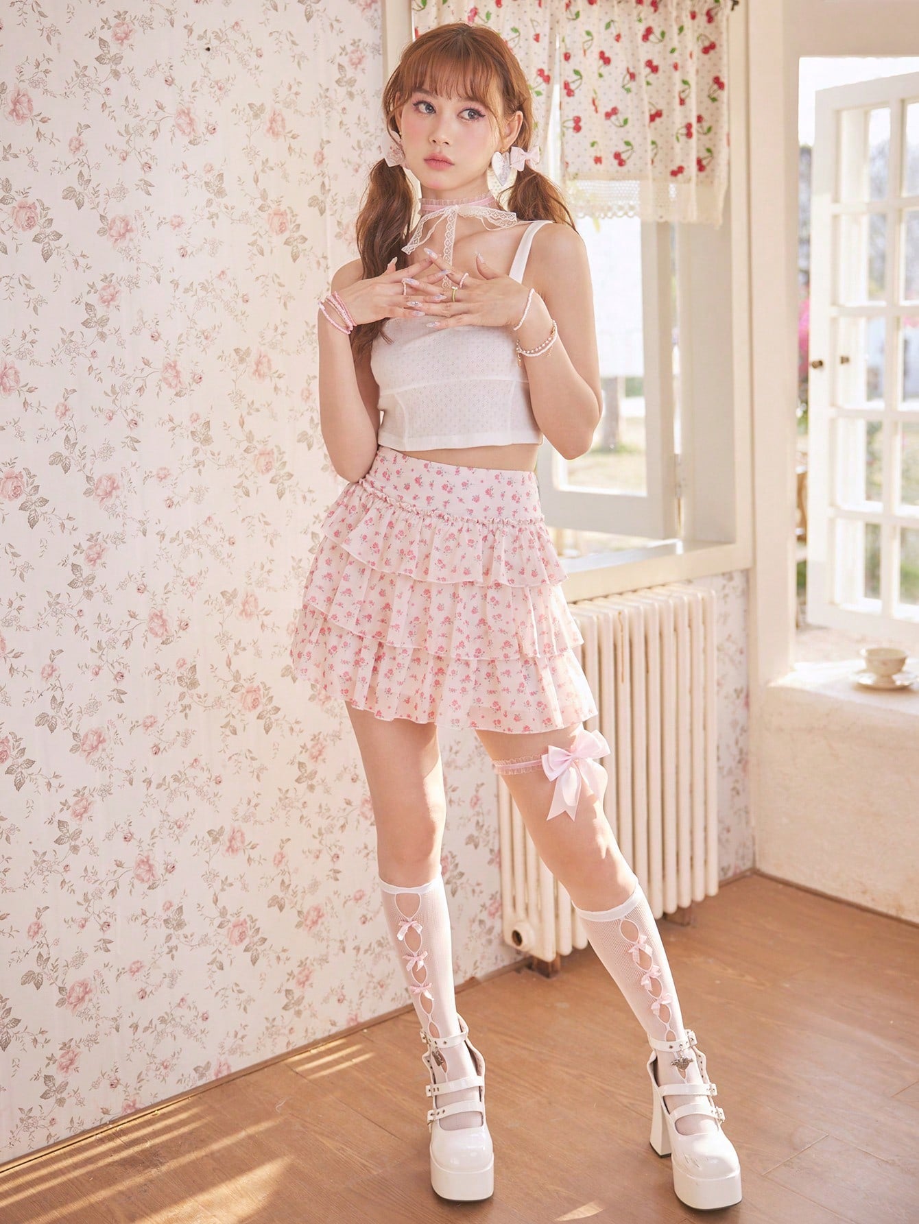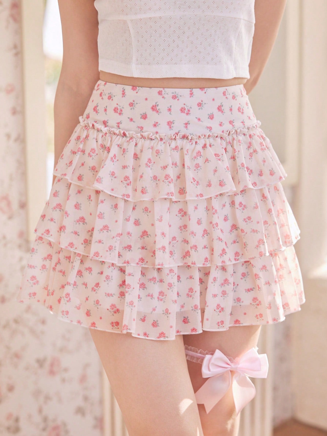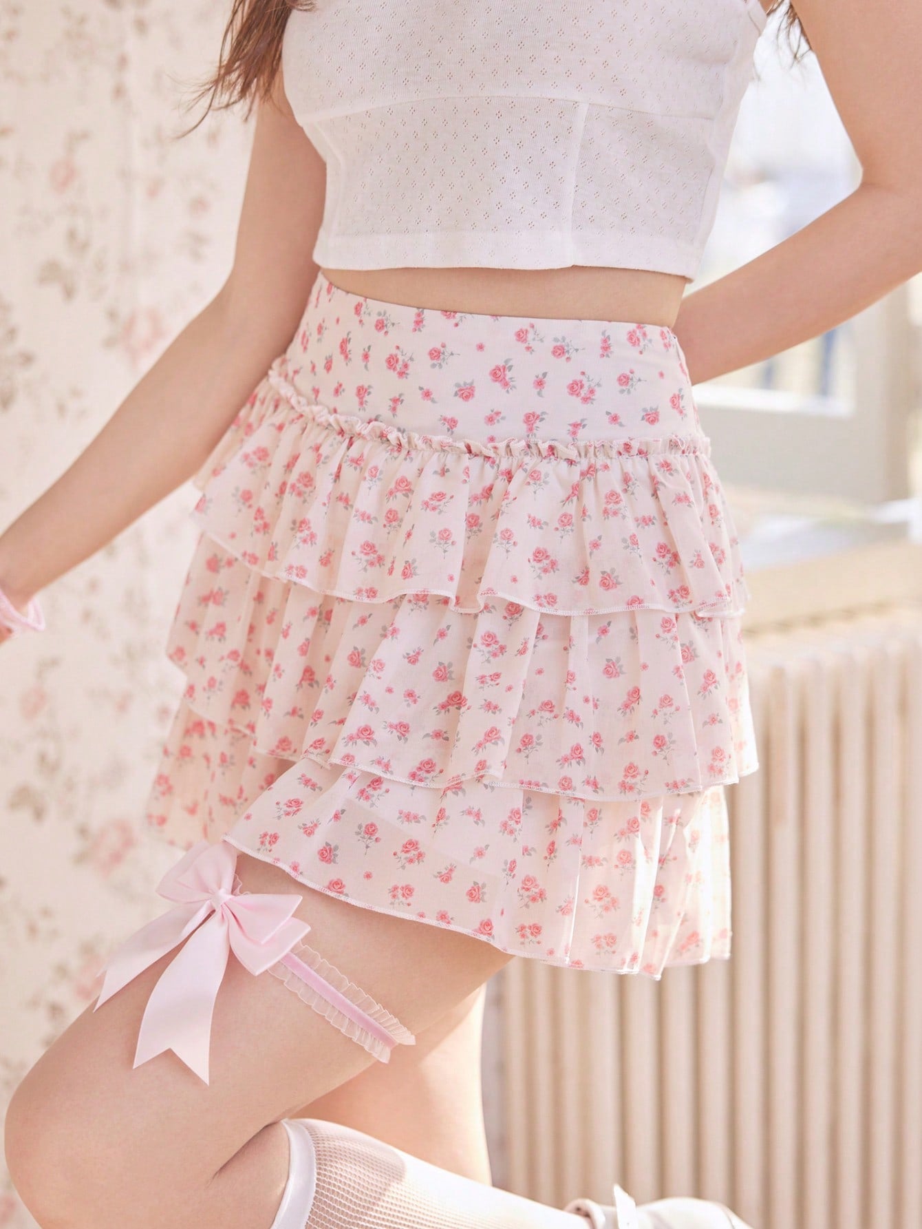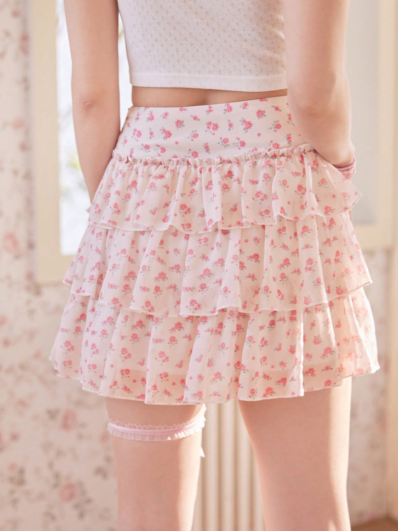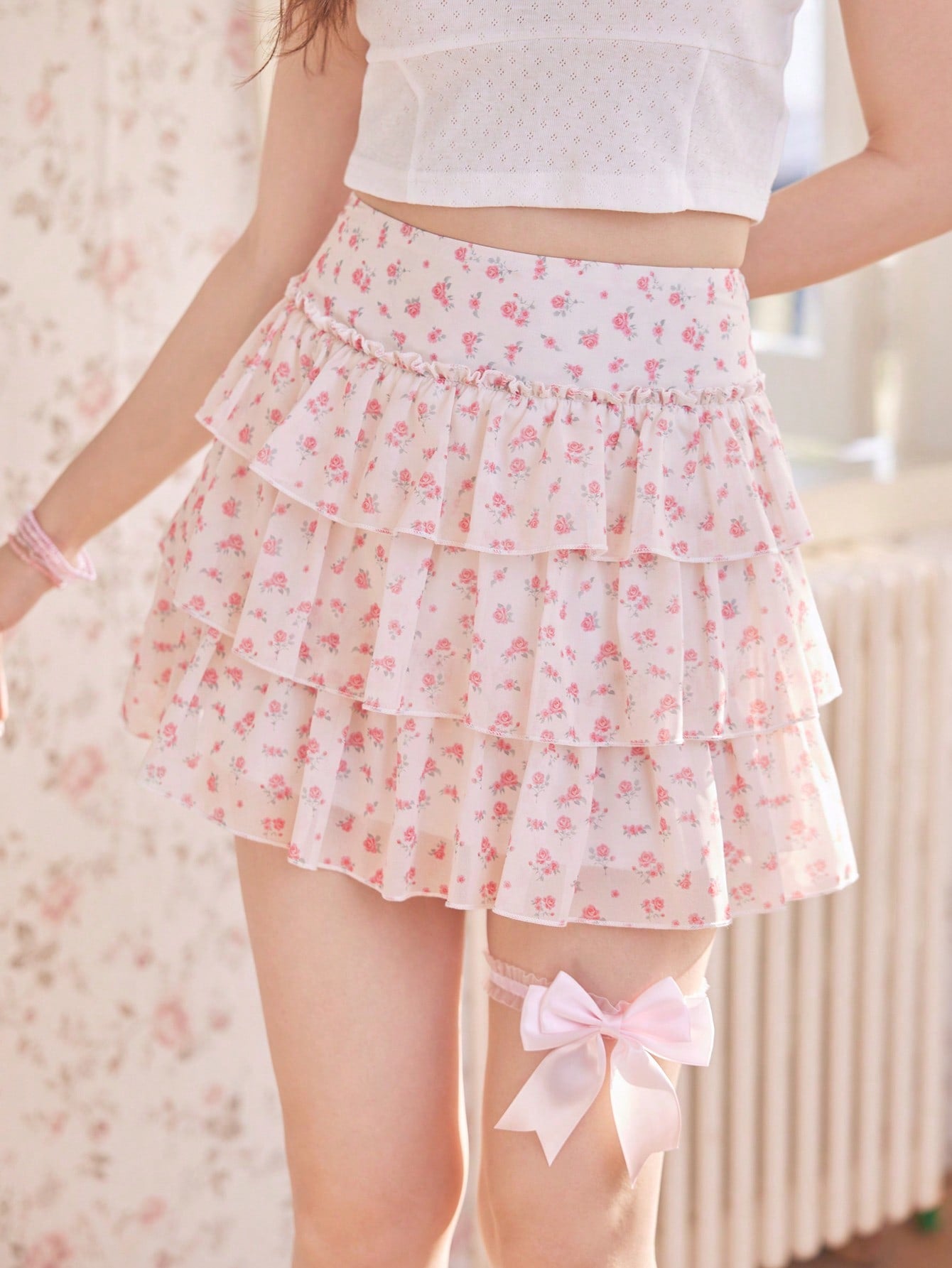 ROMWE Kawaii Ditsy Floral Print Ruffle Hem Skirt, School