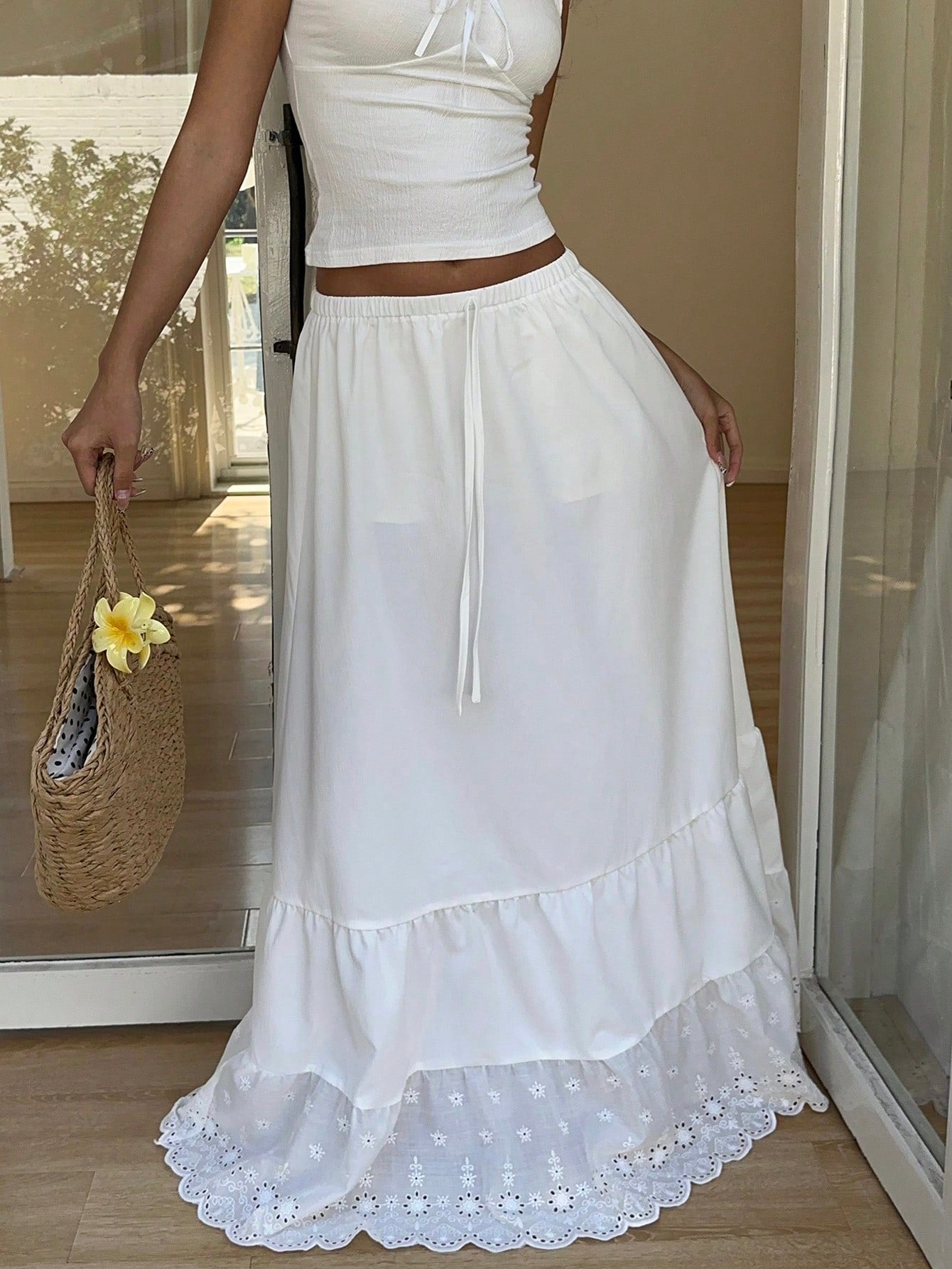 تنورة طويلة نسائية كاجوال من Sunnyshic، مزينة بتطريز من الدانتيل، بتصميم مربوط وربطة عنق، بخصر منخفض، مناسبة للربيع/الصيف