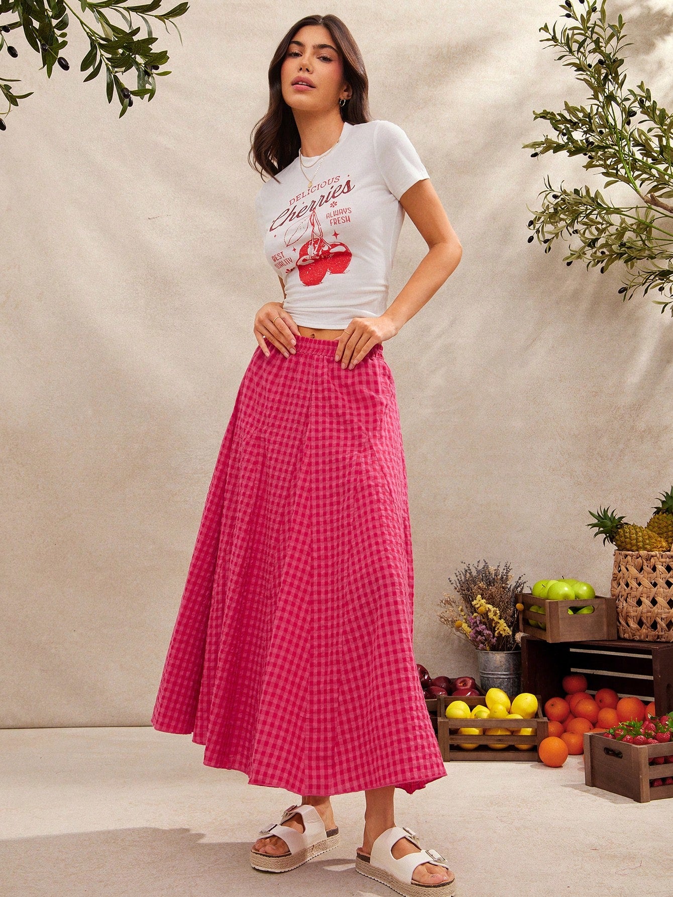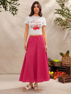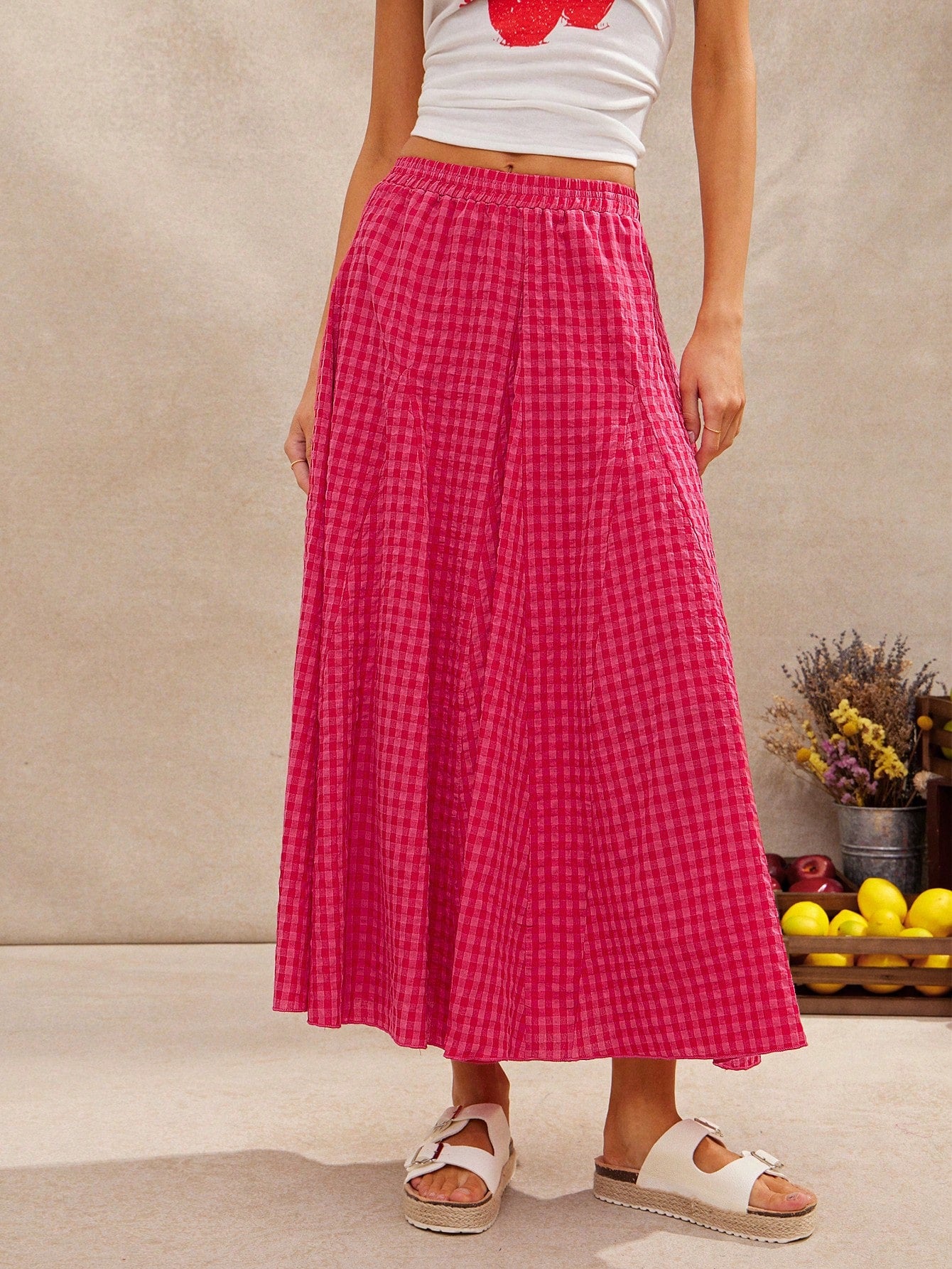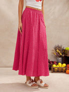 WESTFADE Summer Tonal Gingham Checkered Plaid High Waist Smocked Waist Godot Midi Skirt Spring Break