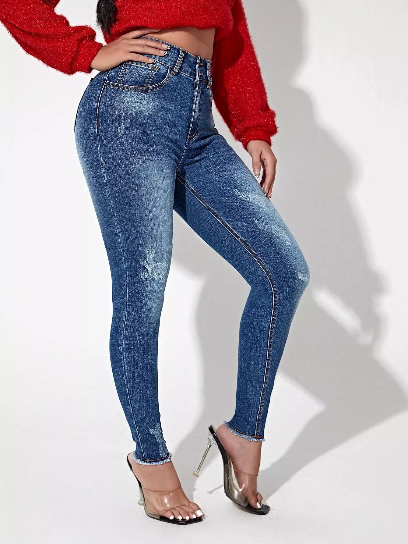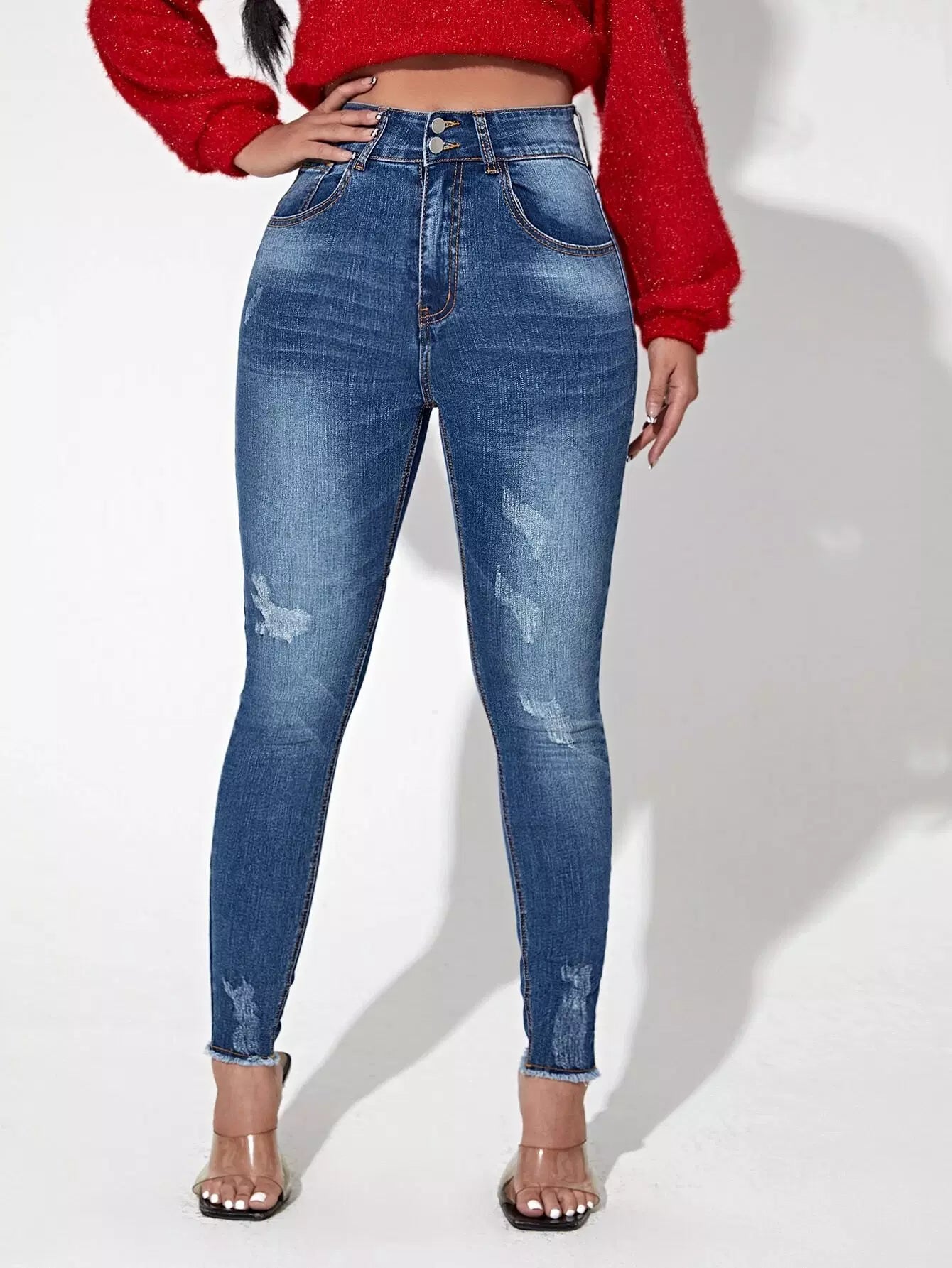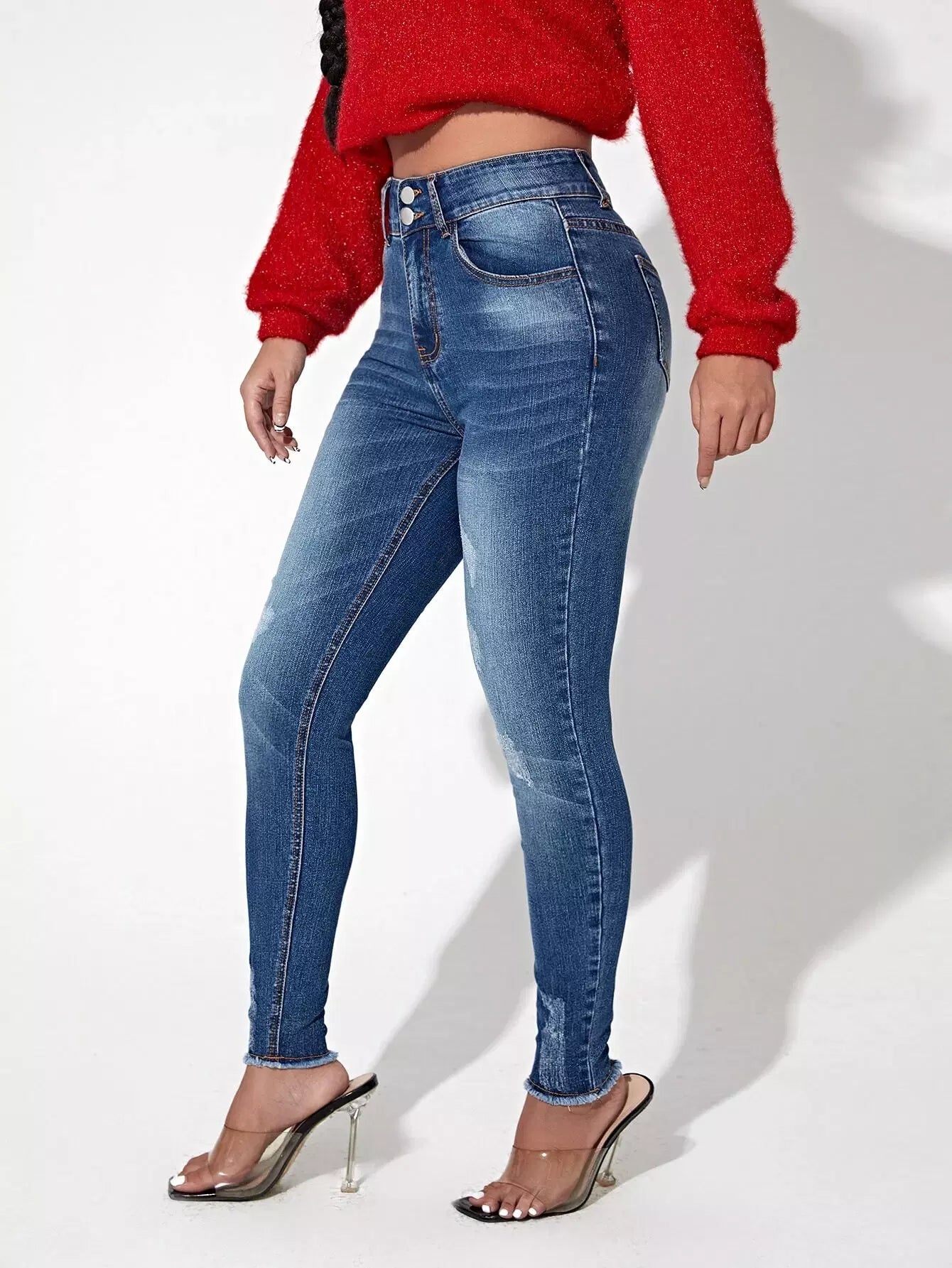 1 قطعة بنطلون جينز سكيني بحاشية خصر عالية خفيف بحافة خصر عالية وأزرار