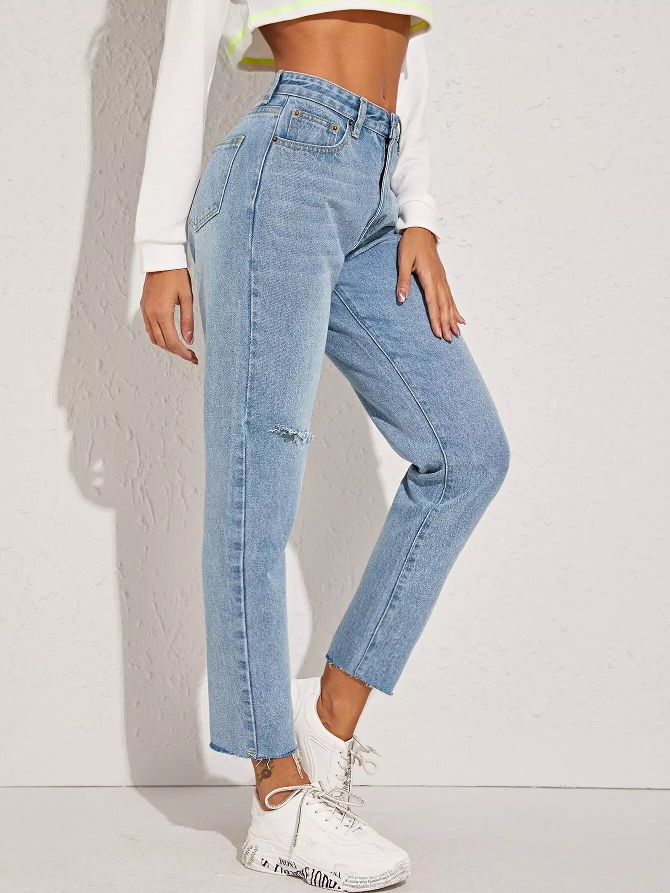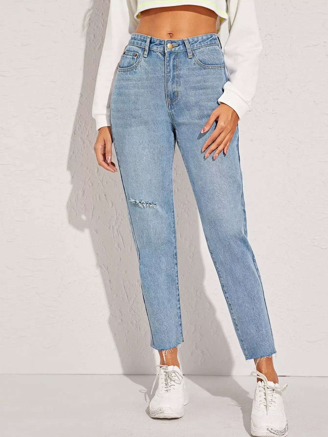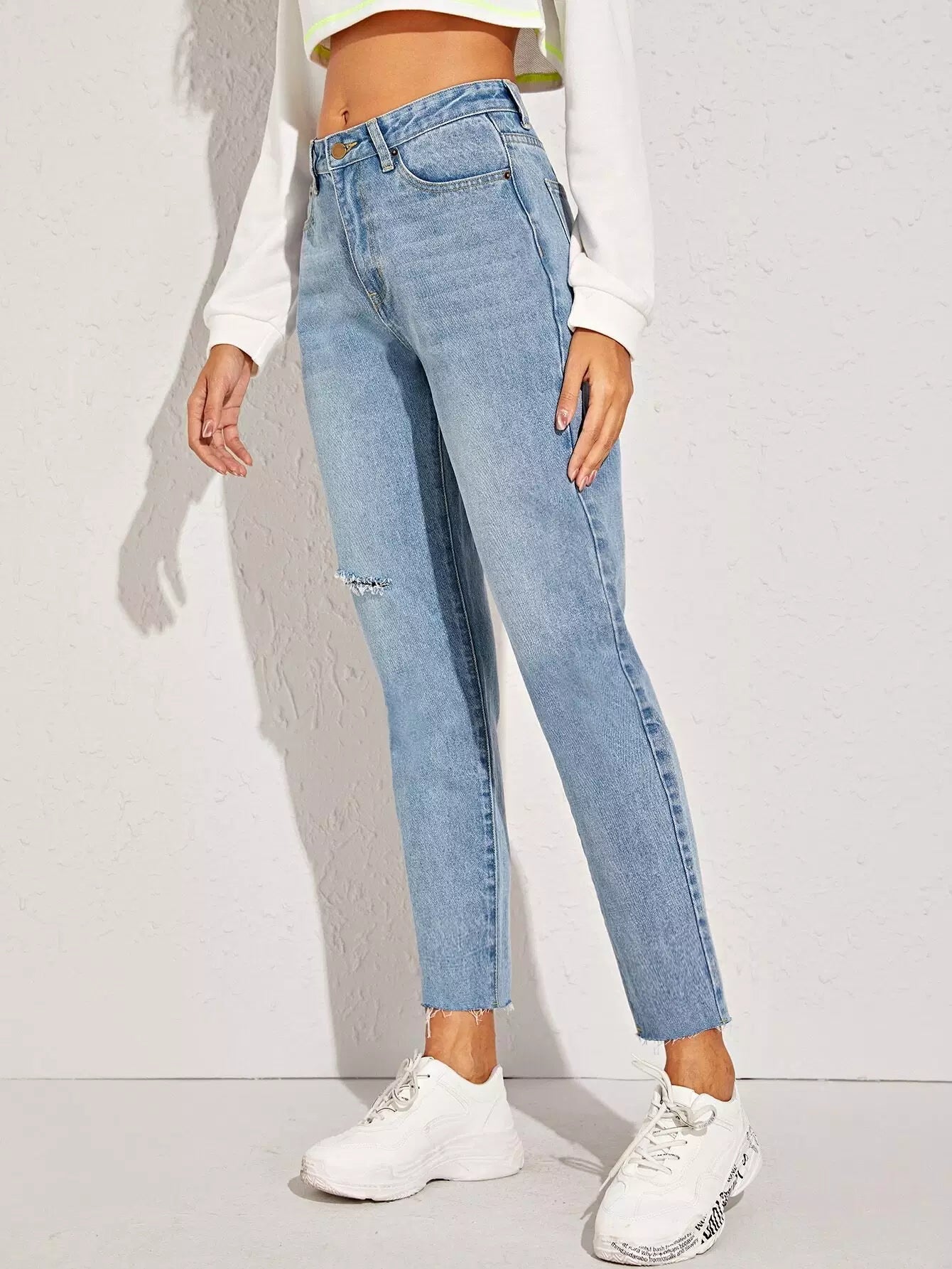 بنطلون جينز بحواف مدمرة بحمض الغسيل الحمضي بحافة خامة مدمرة