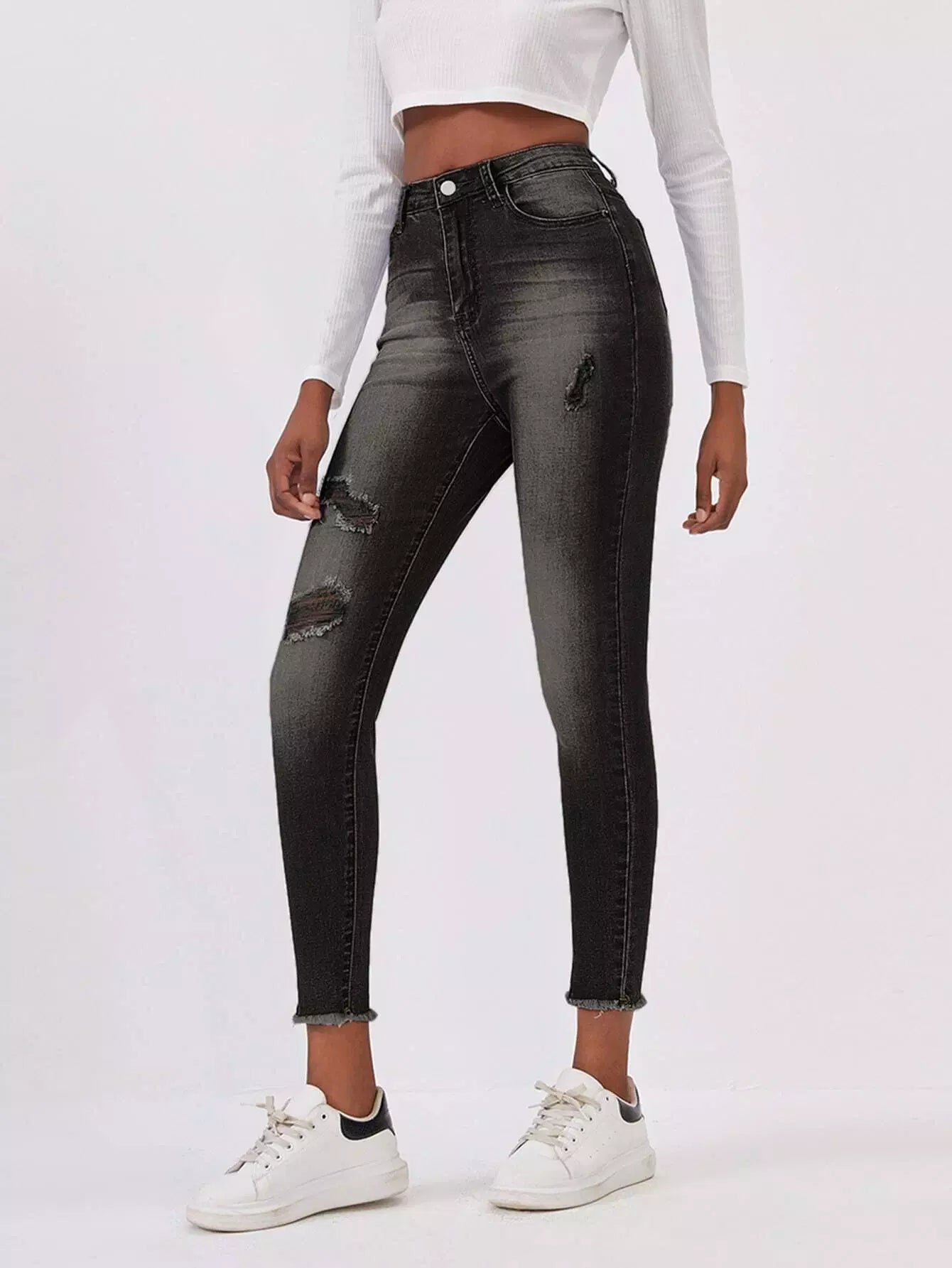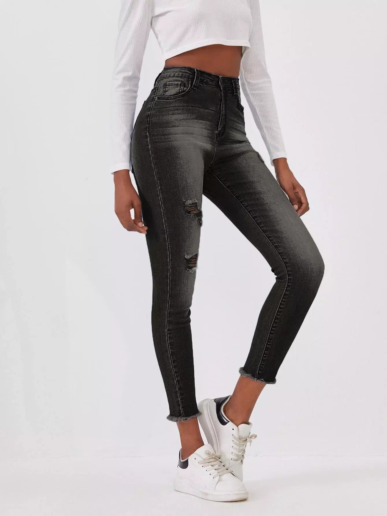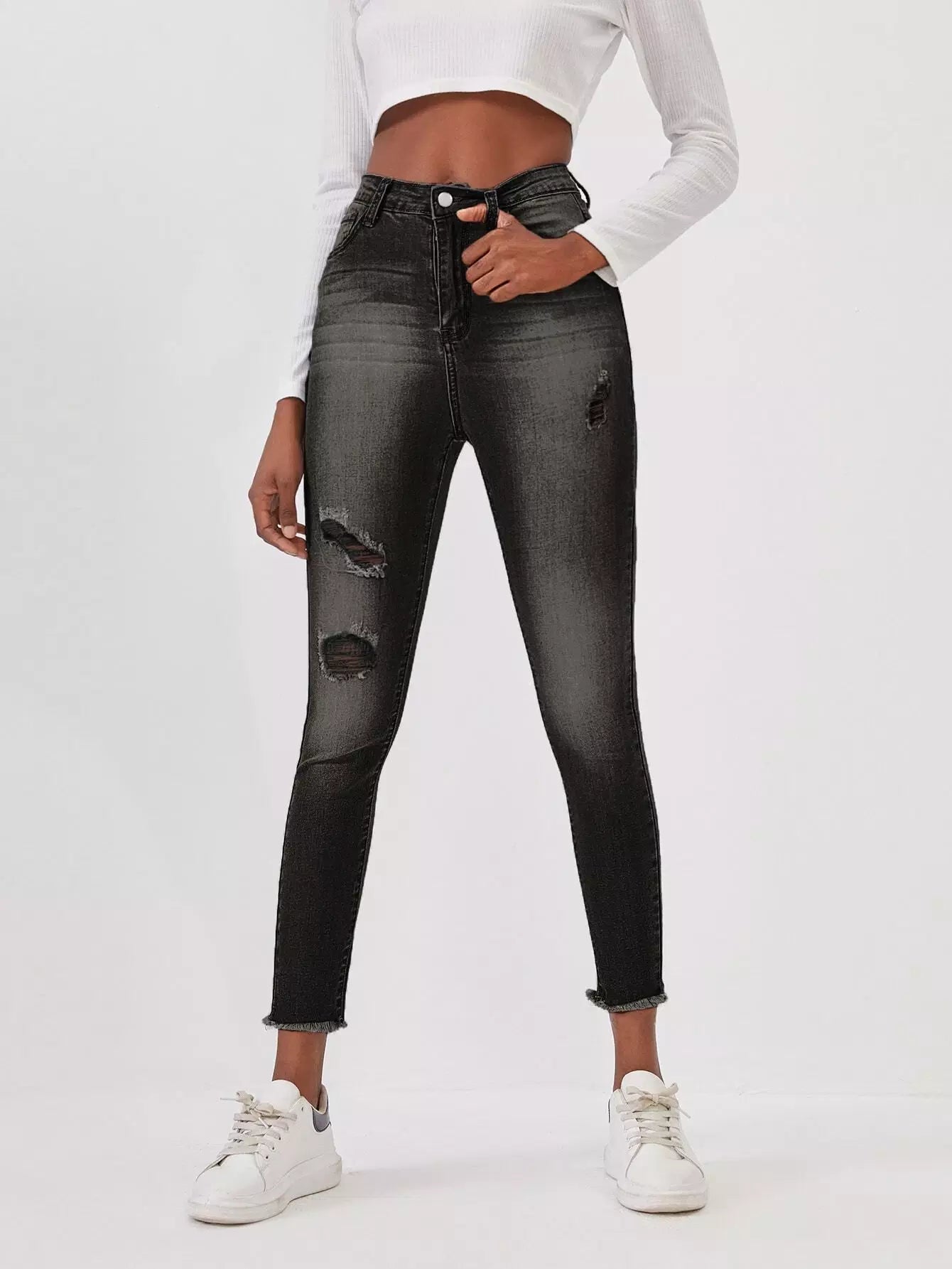 بنطلون جينز ممزق عالي التمدد بغسول مبيض