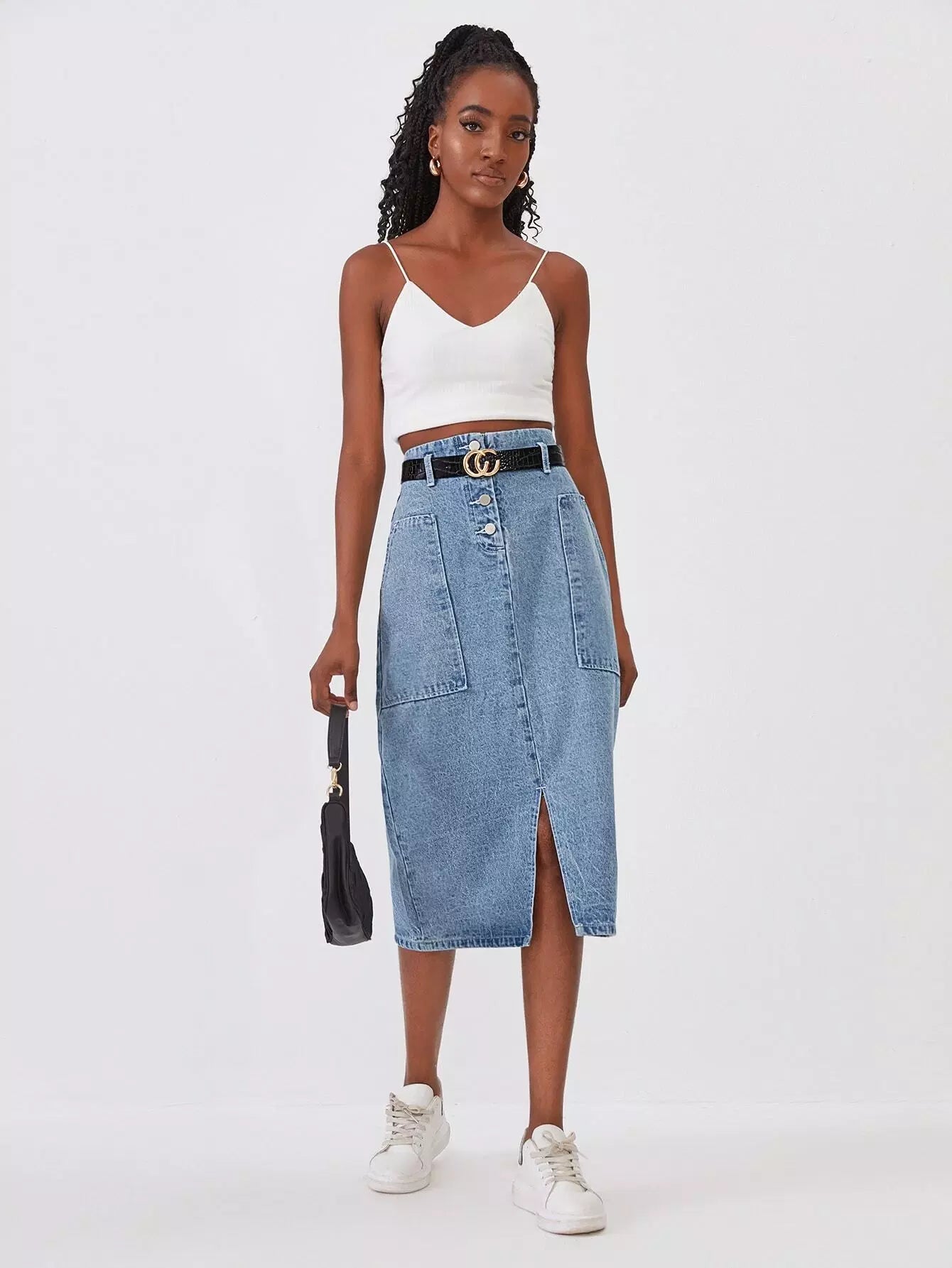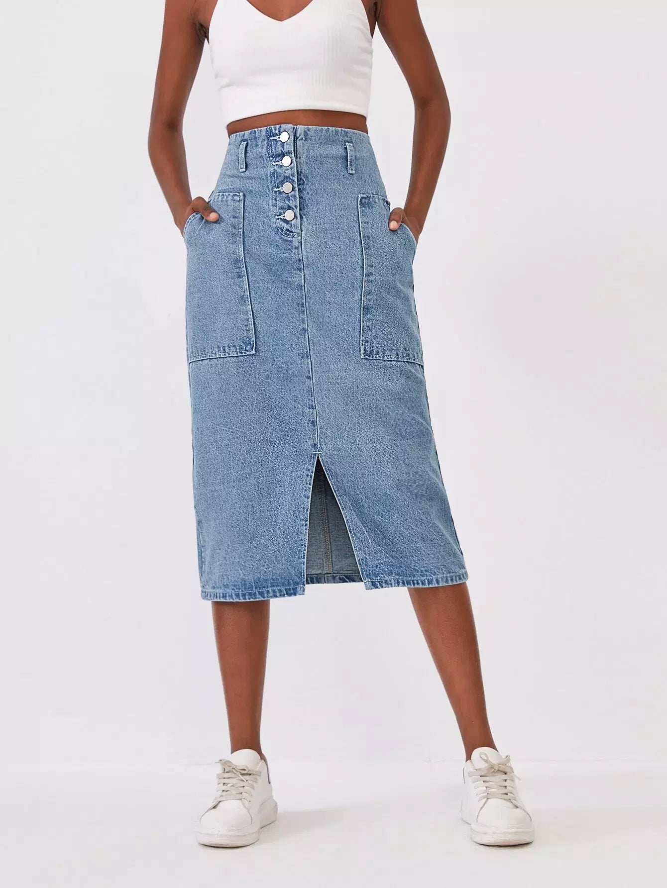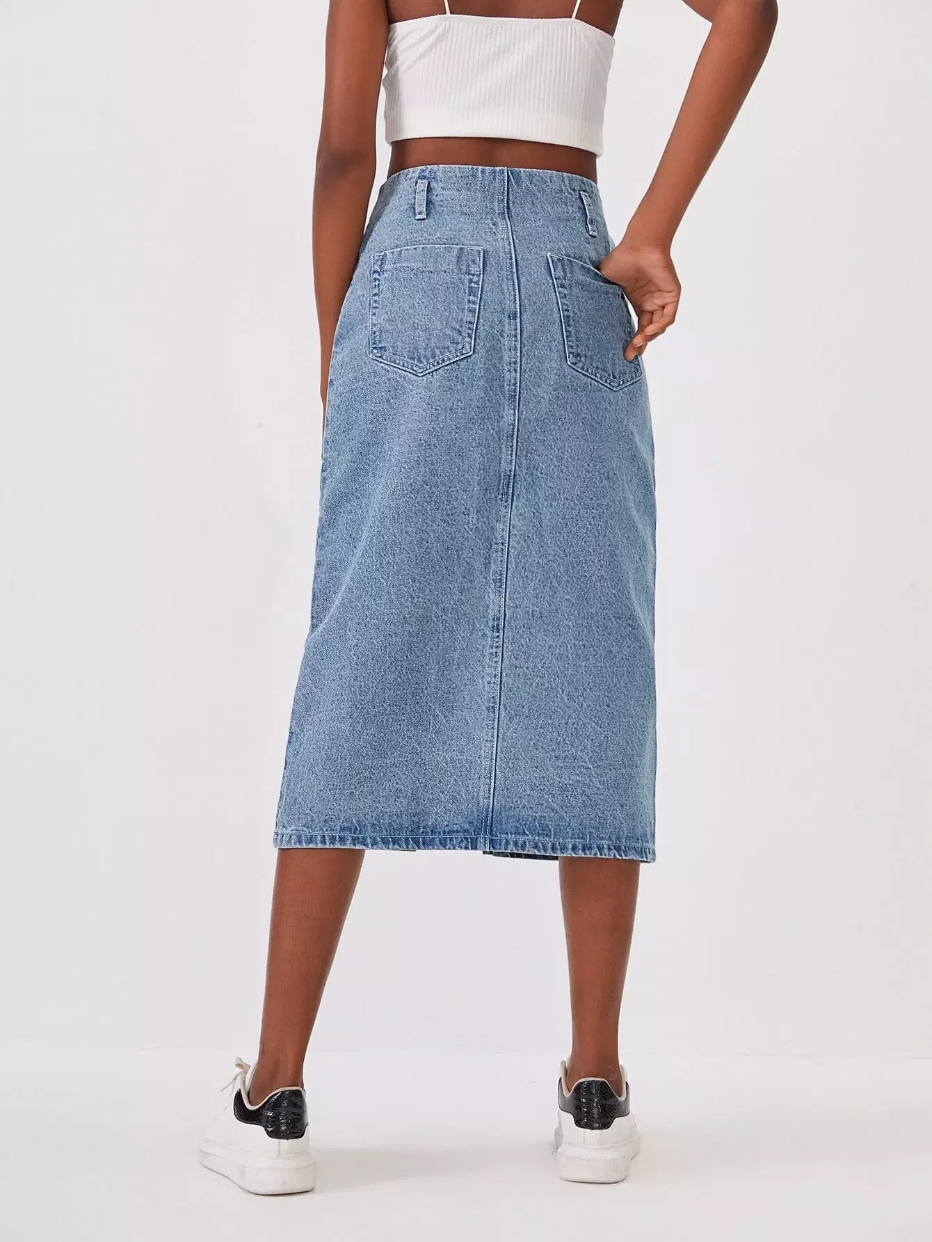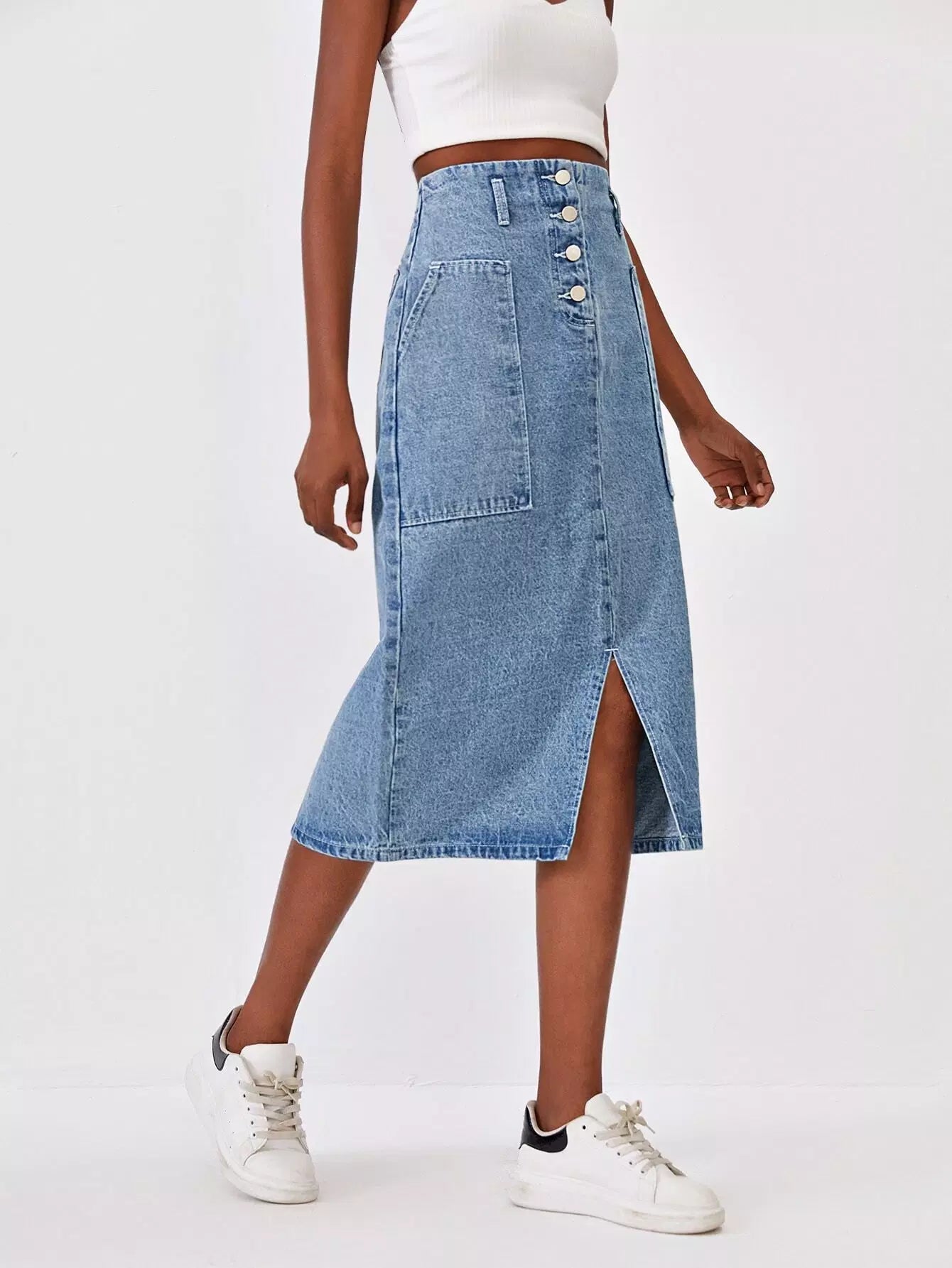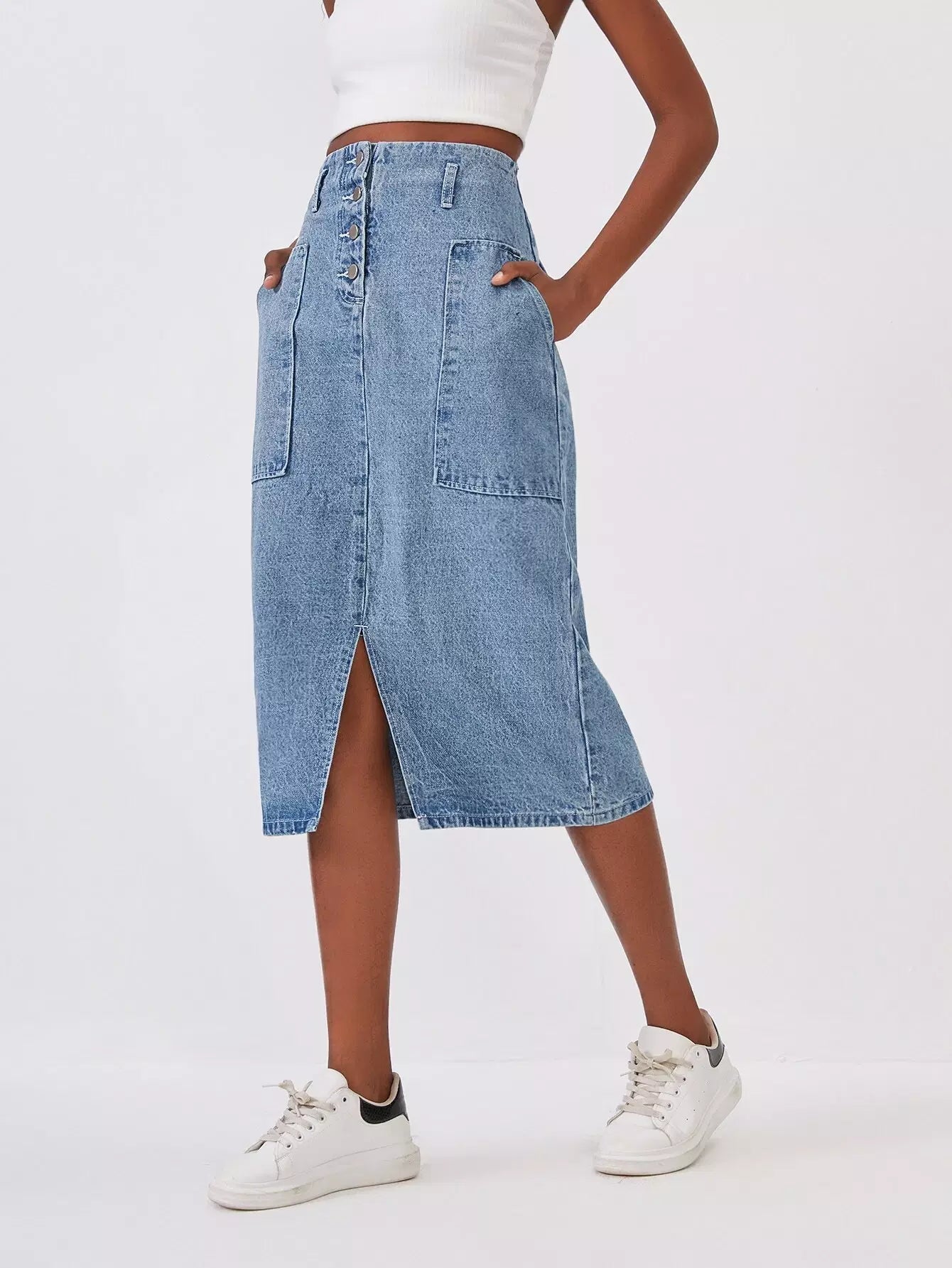 تنورة دنيم ذات جيب مائل بحافة مشقوقة بأزرار