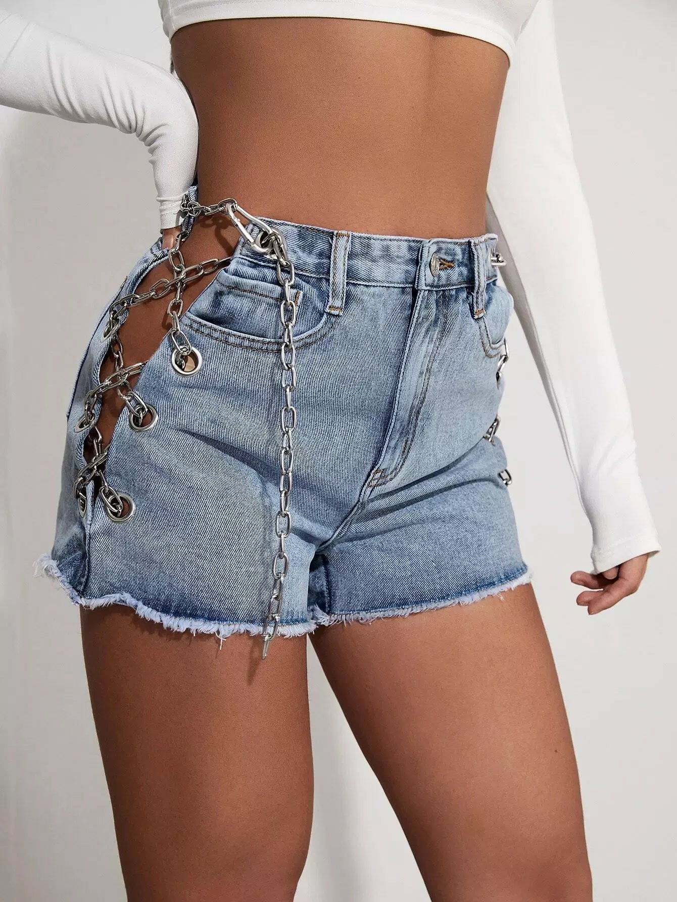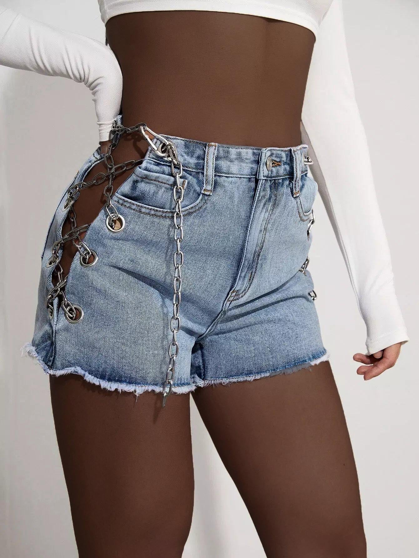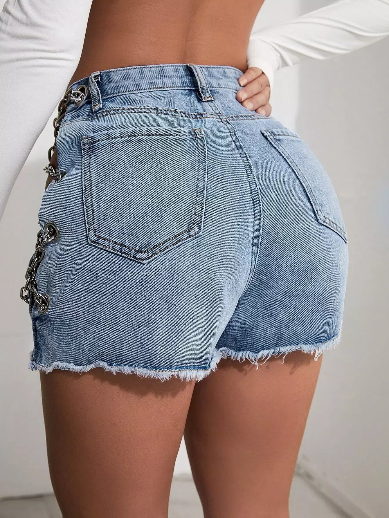 شورت جينز جينز بحاشية جانبية بأربطة على شكل سلسلة