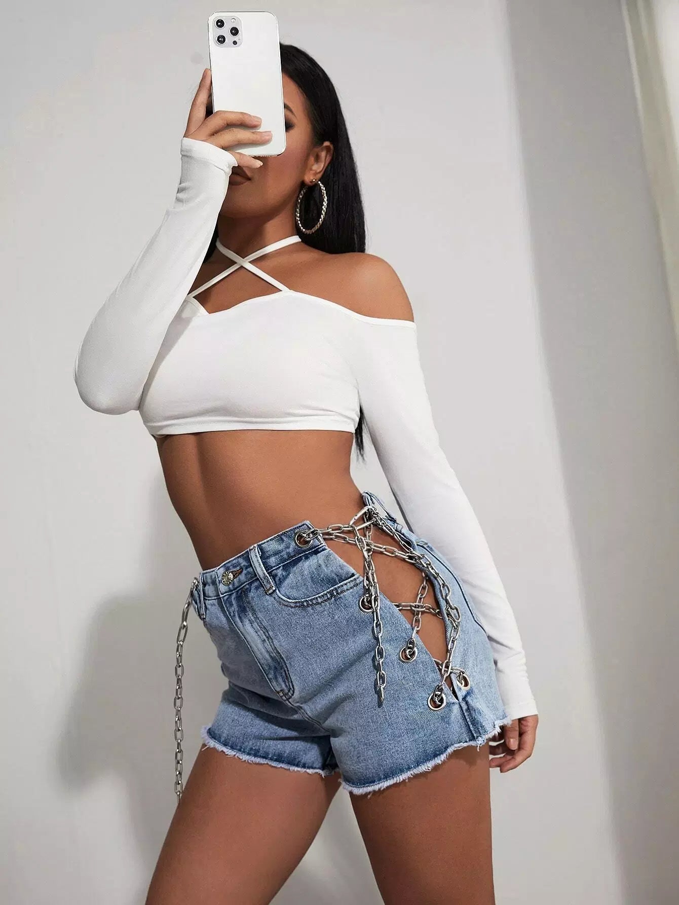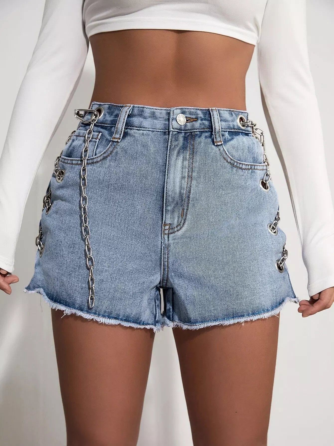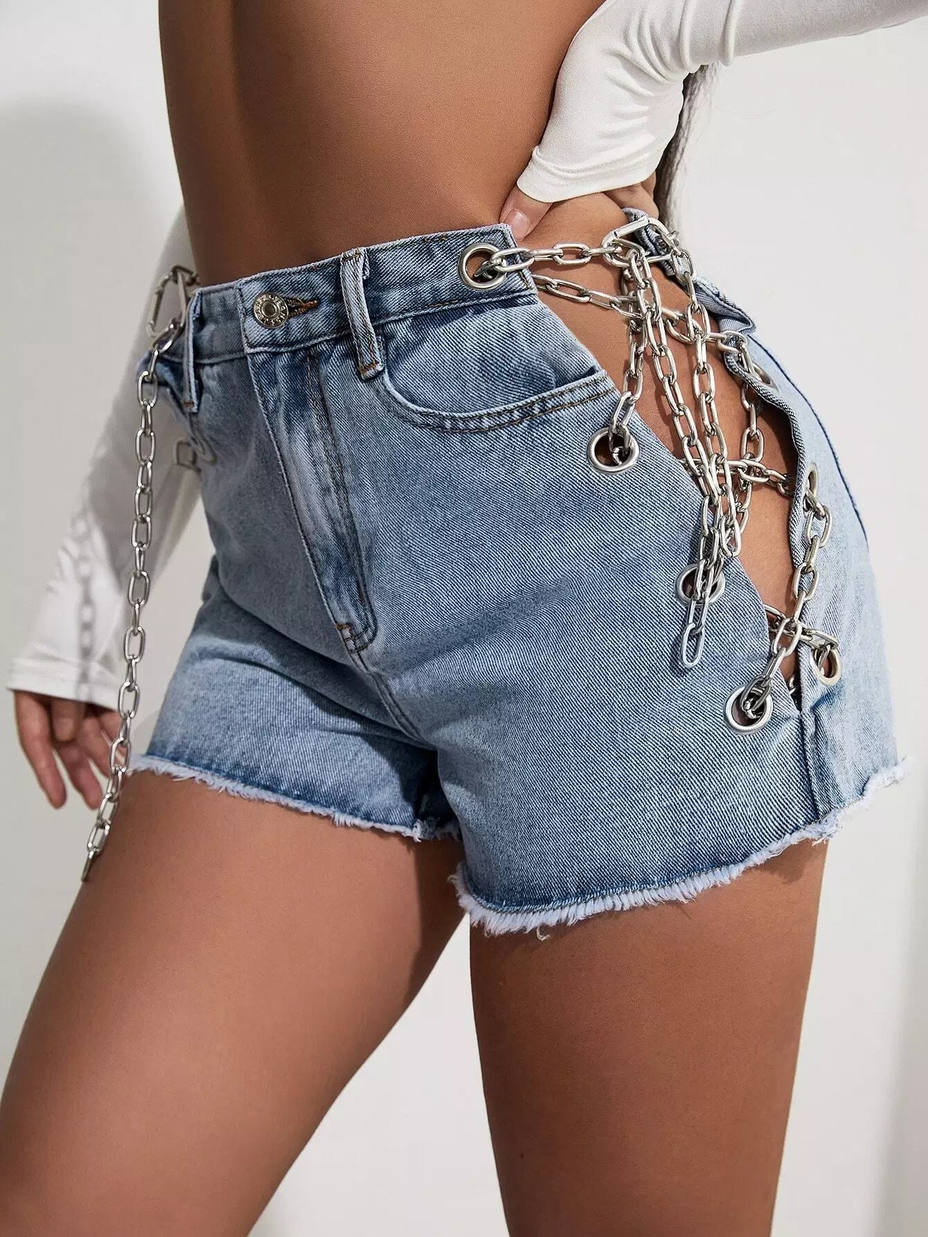 شورت جينز جينز بحاشية جانبية بأربطة على شكل سلسلة