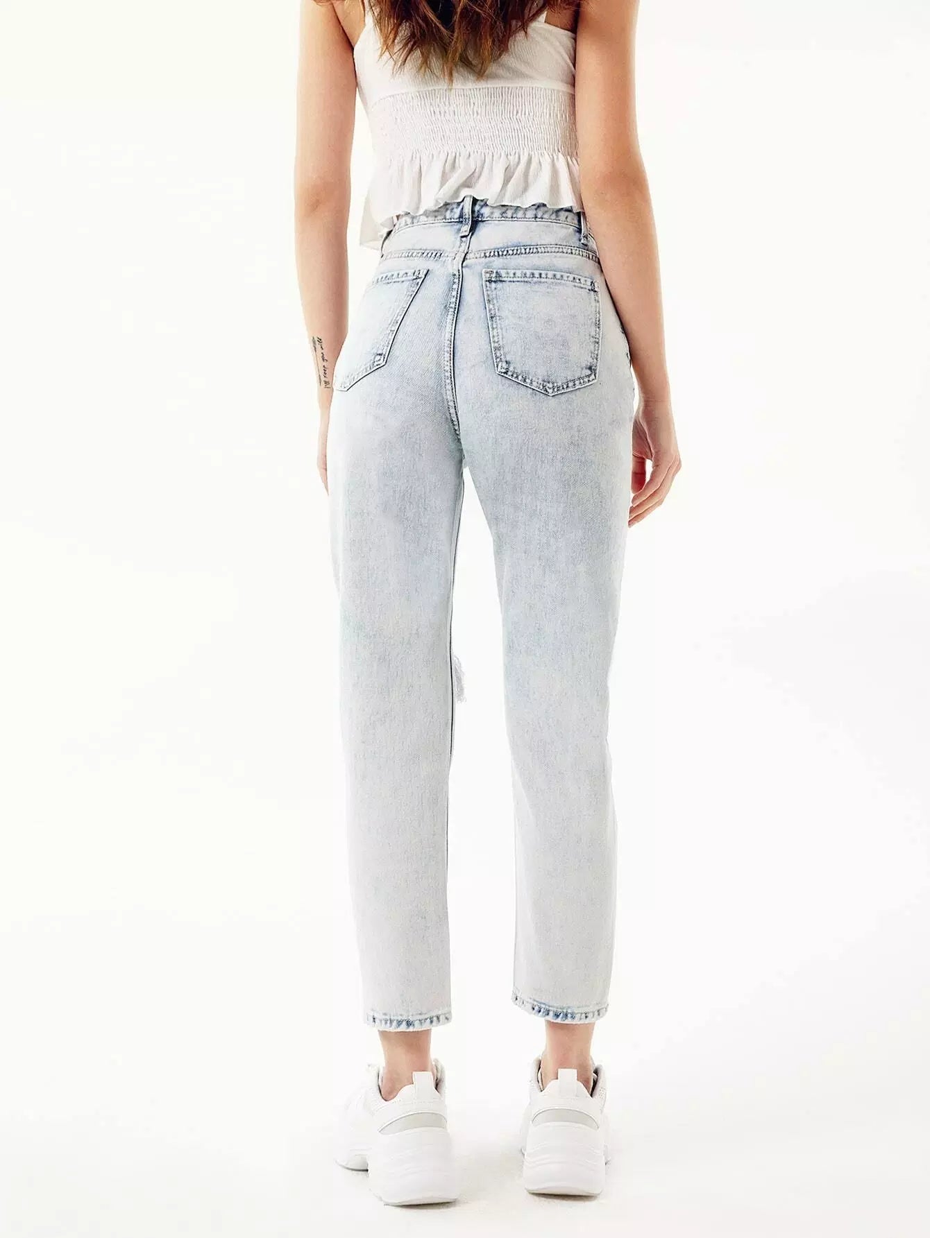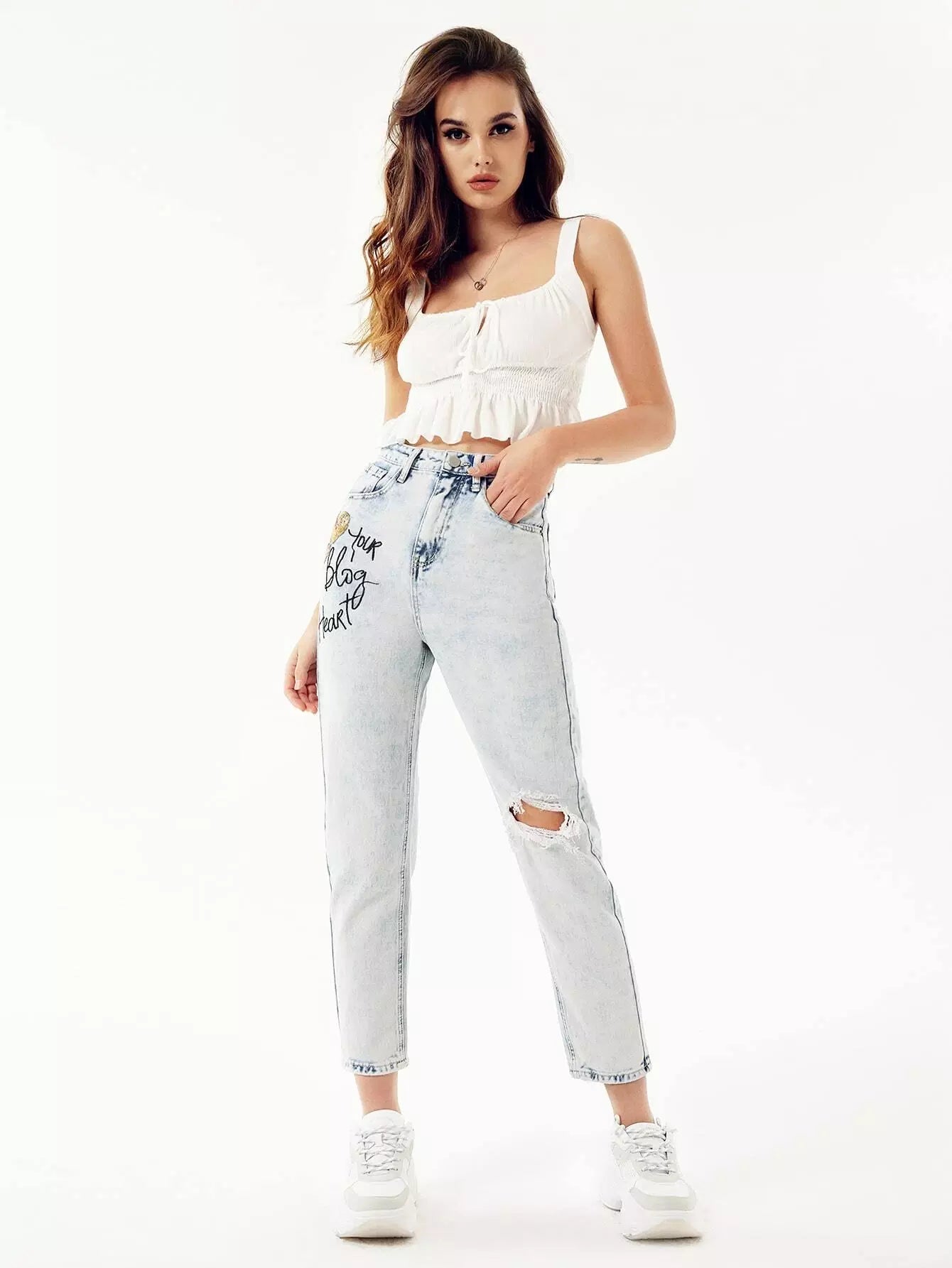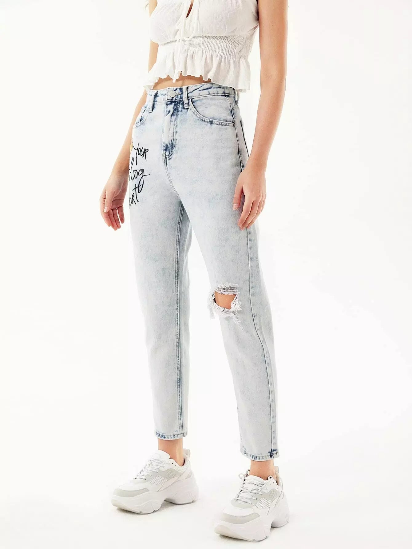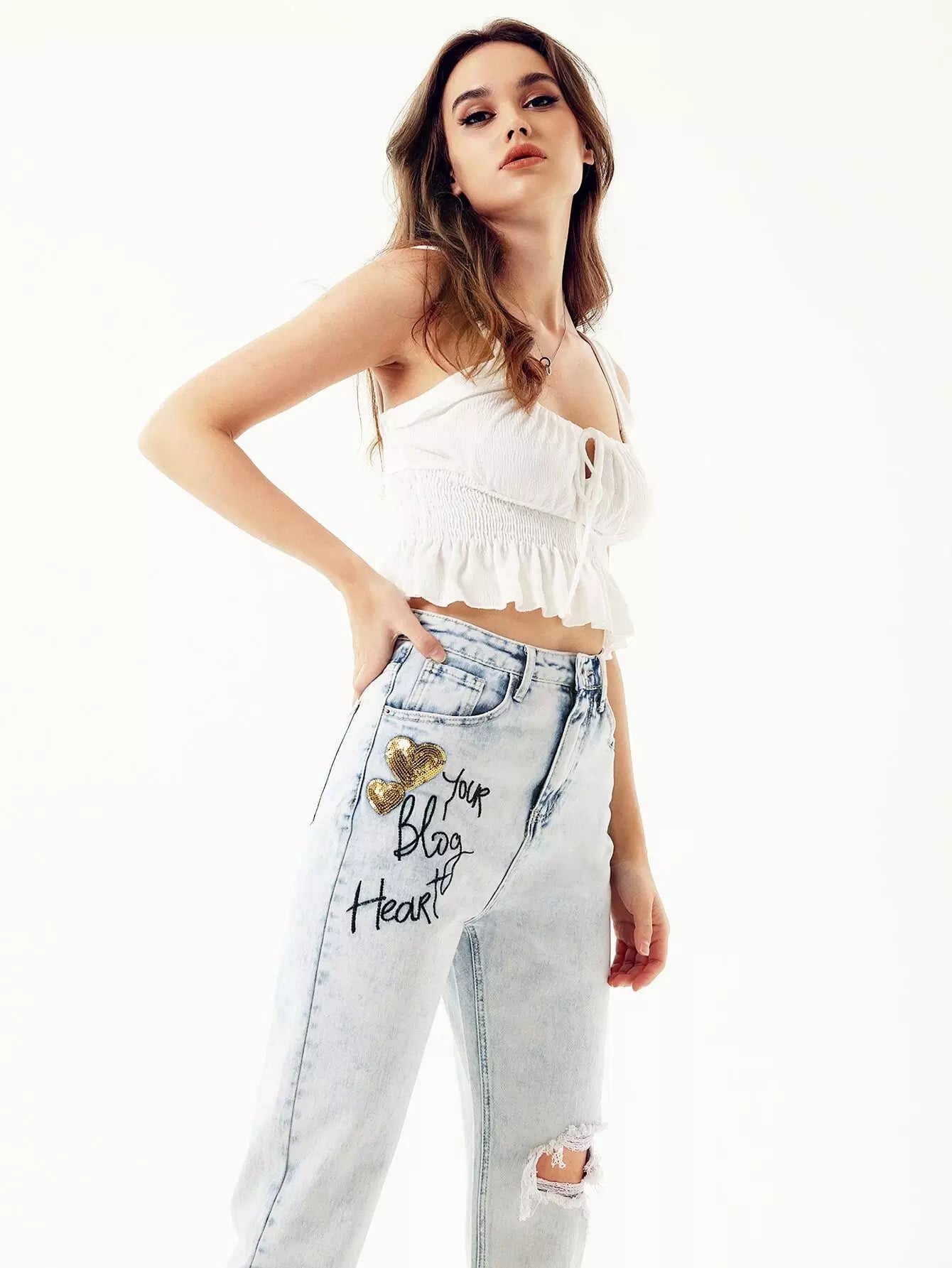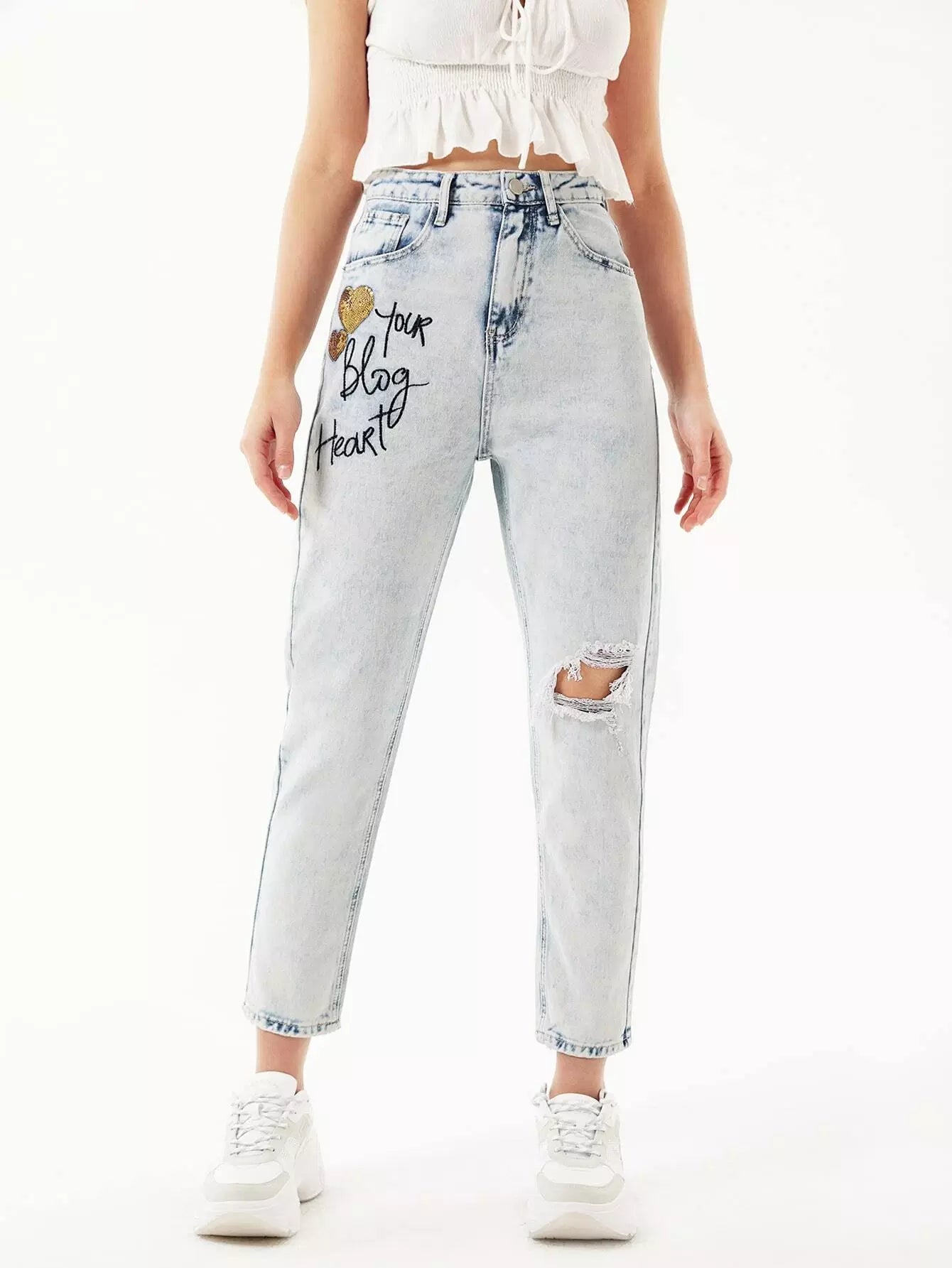 بنطلون جينز ممزق بنقشة قلب وشعار بترتر بلون مغاير