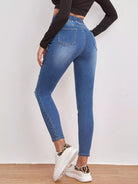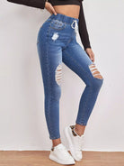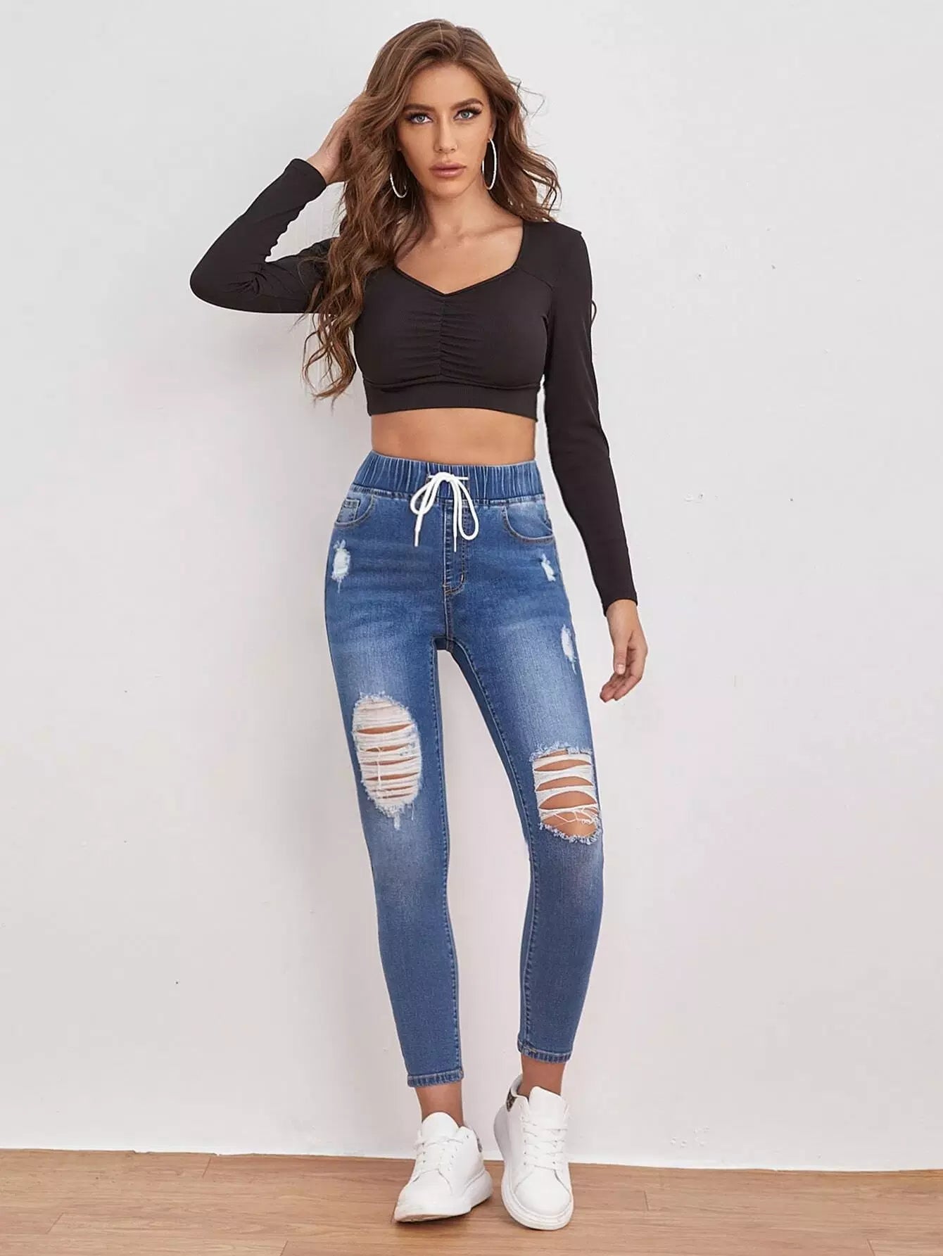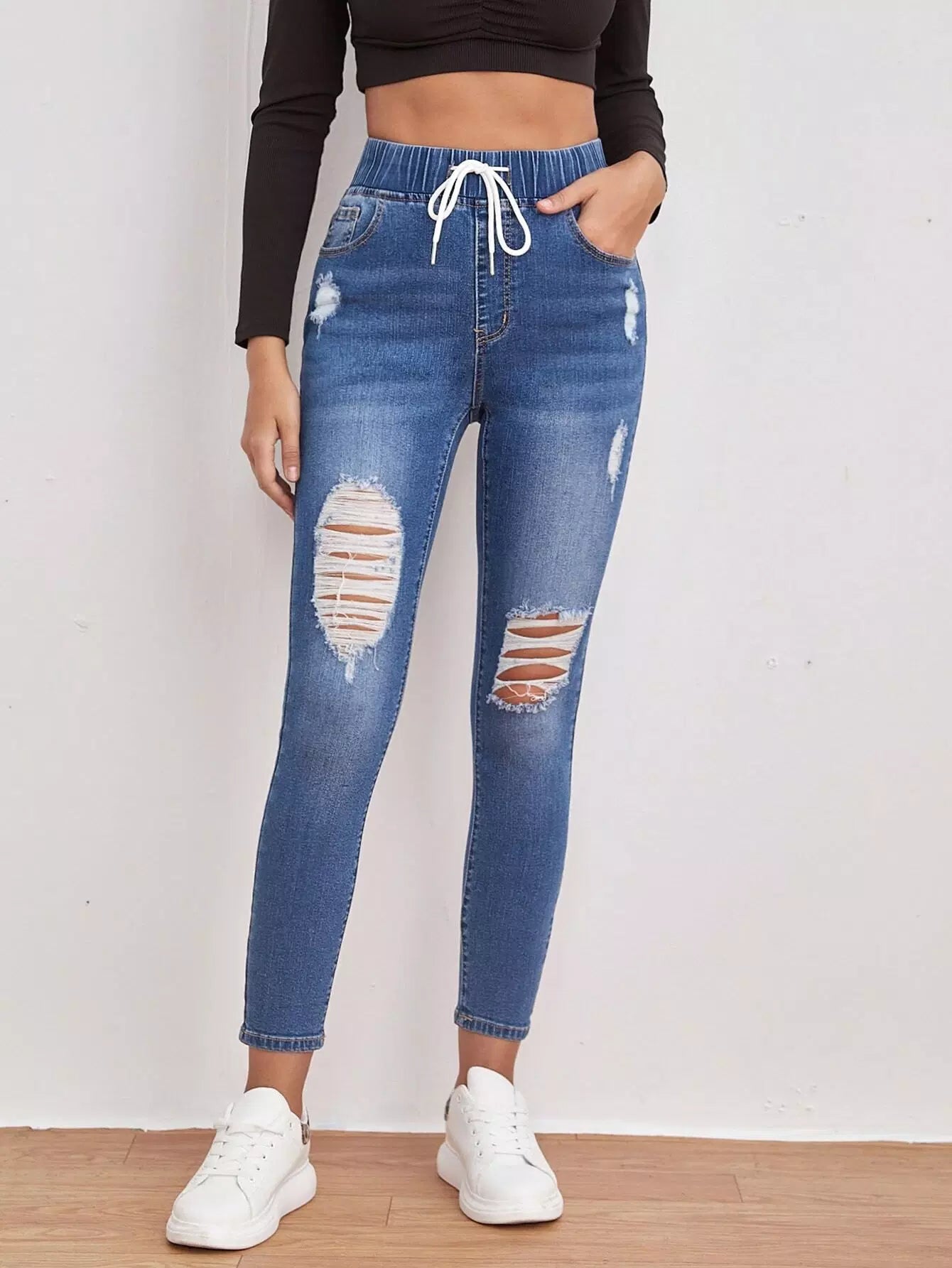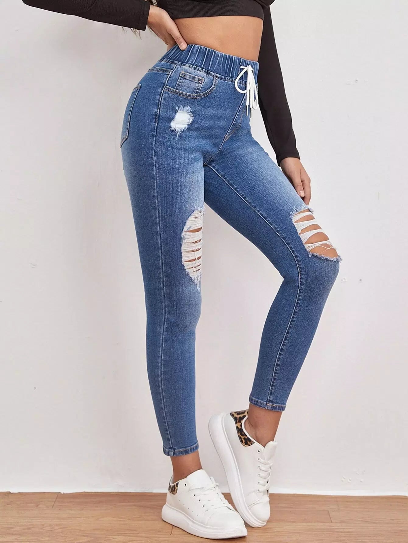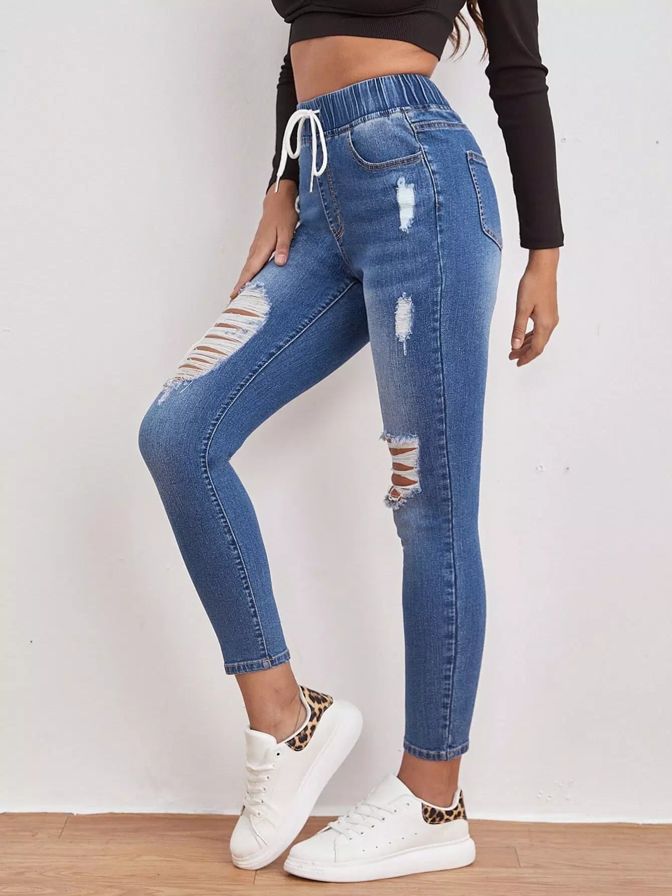 بنطال جينز سكيني ضيق ممزق برباط على الخصر