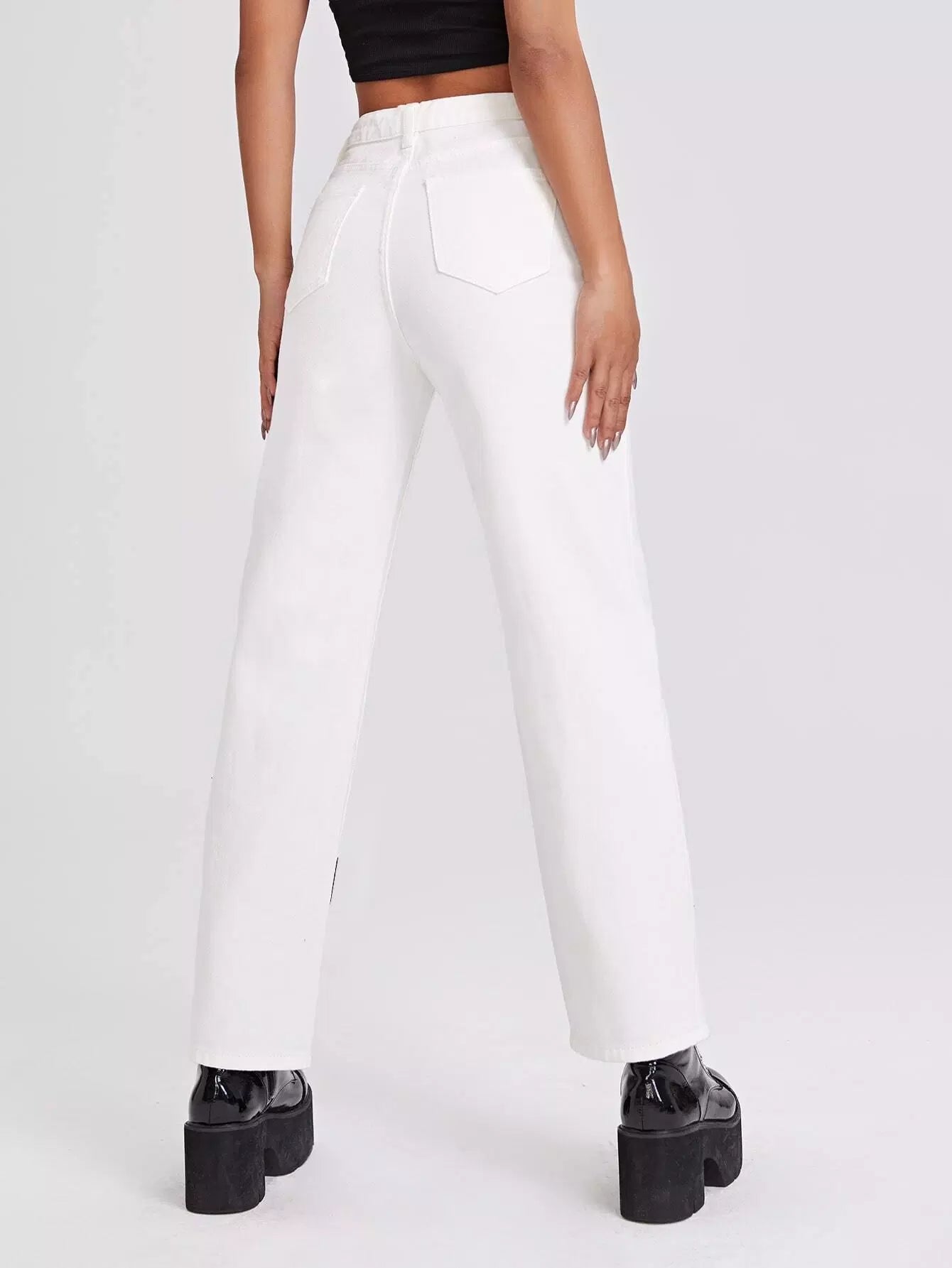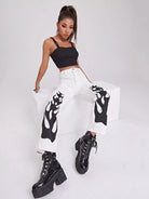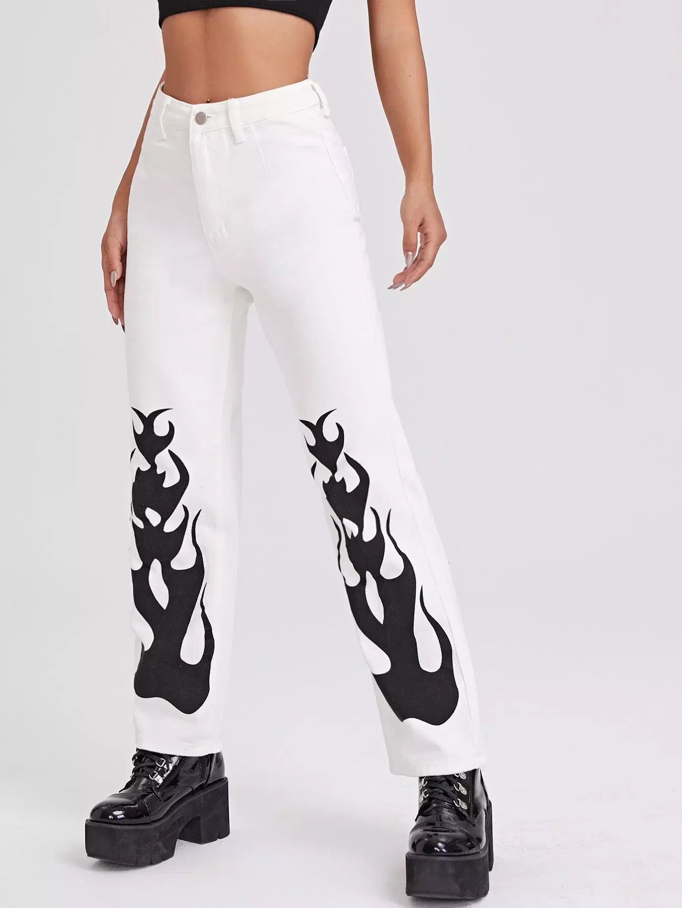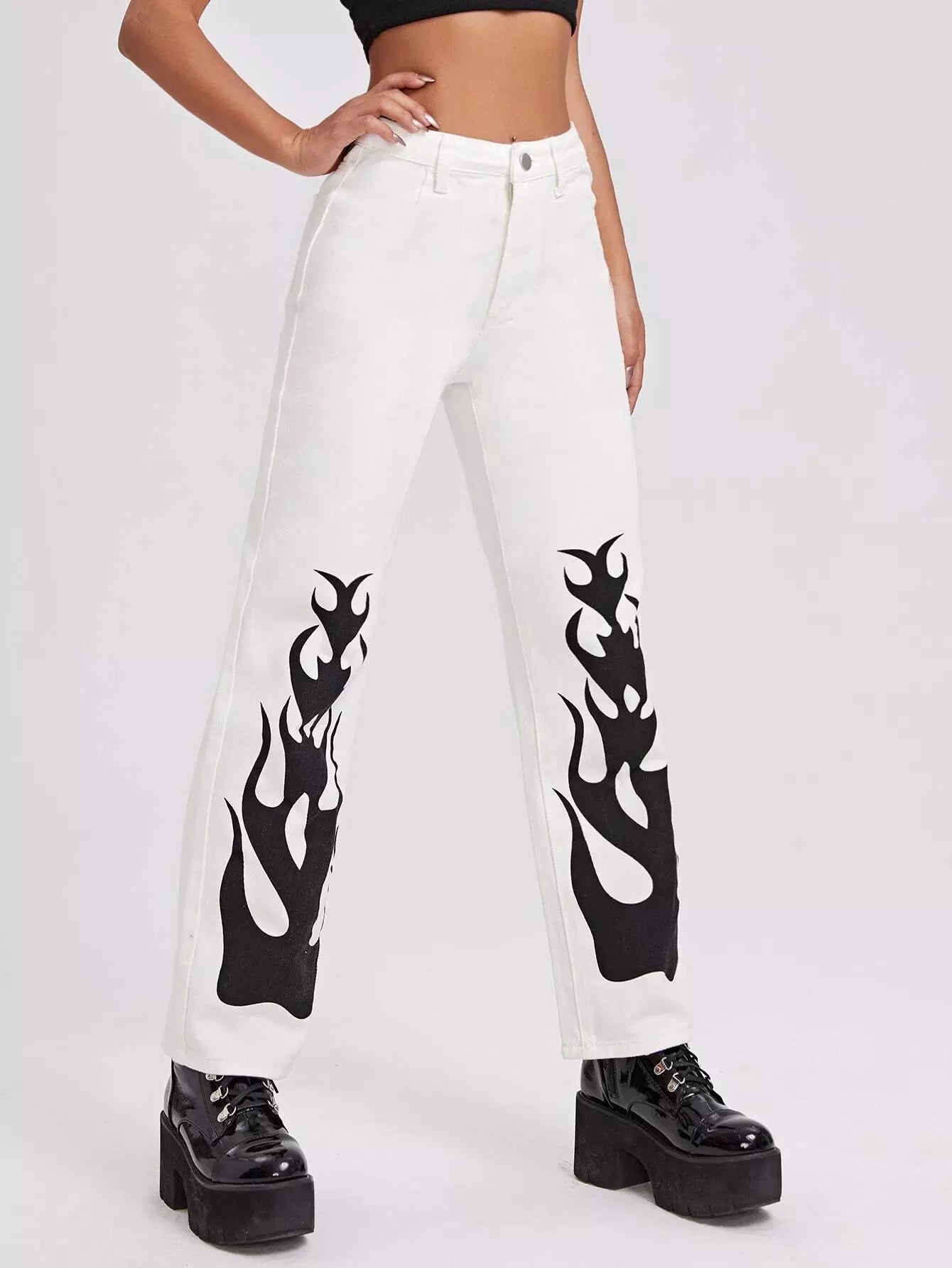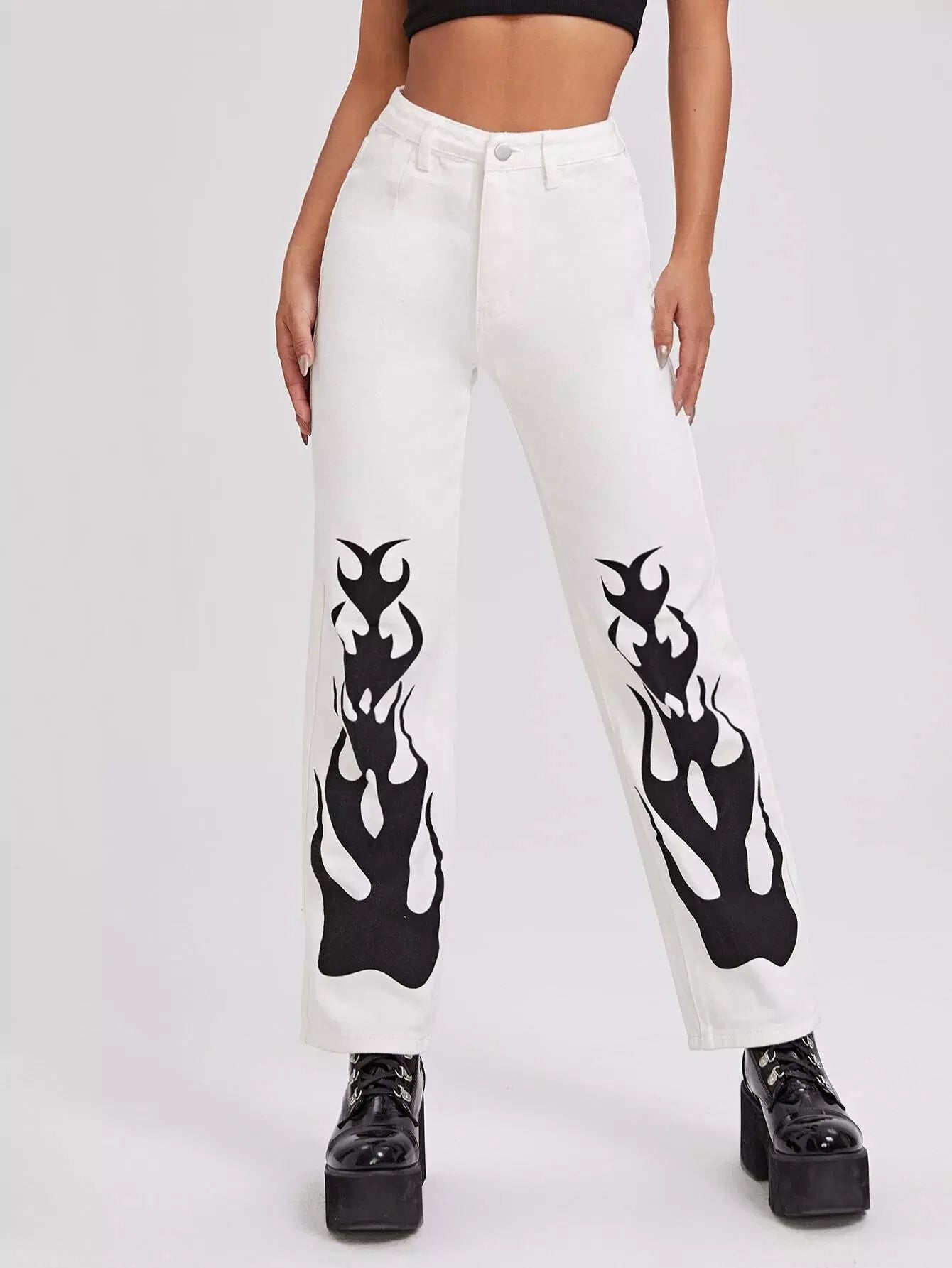 بنطلون جينز بطبعة نار بساق مستقيمة