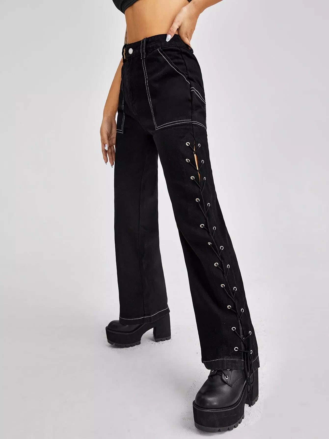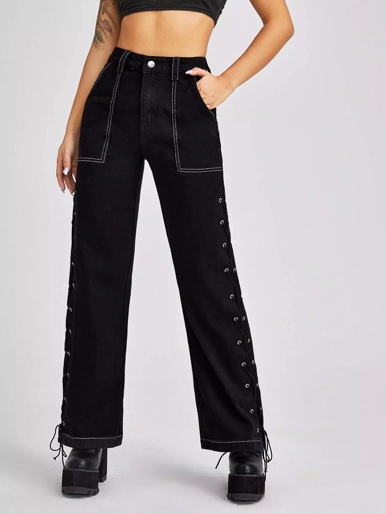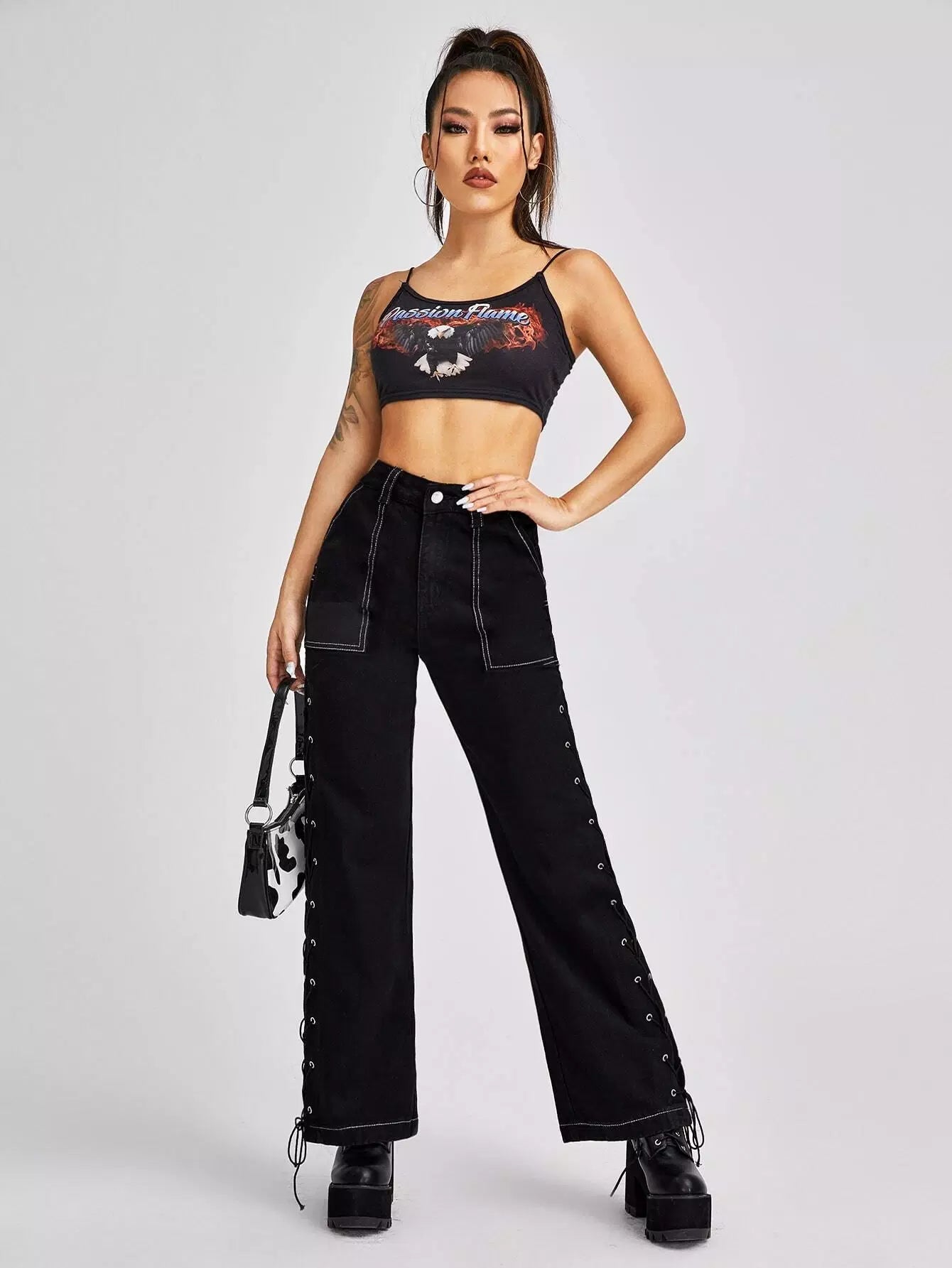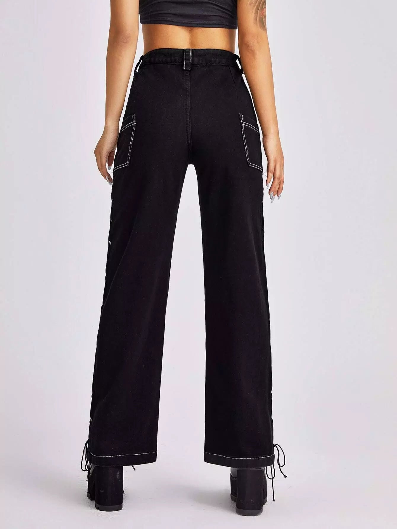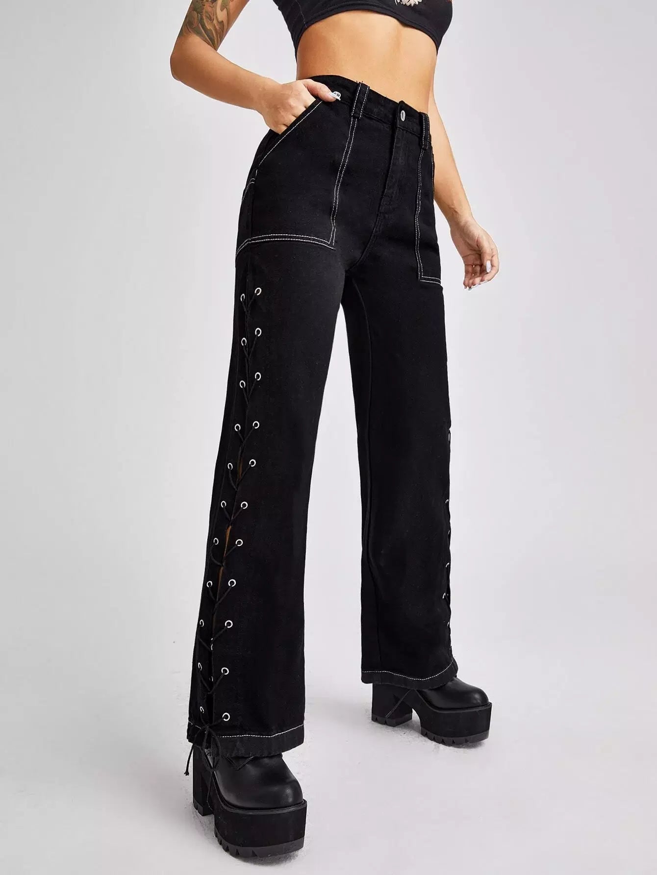 بنطلون جينز واسع الساقين بأربطة بأربطة من أعلى