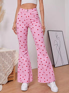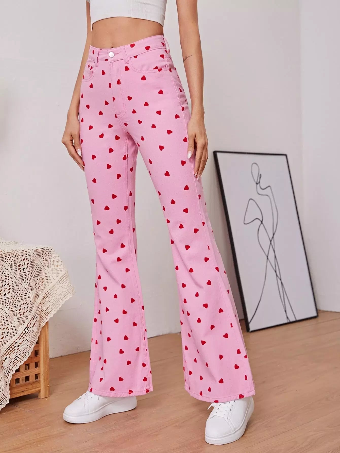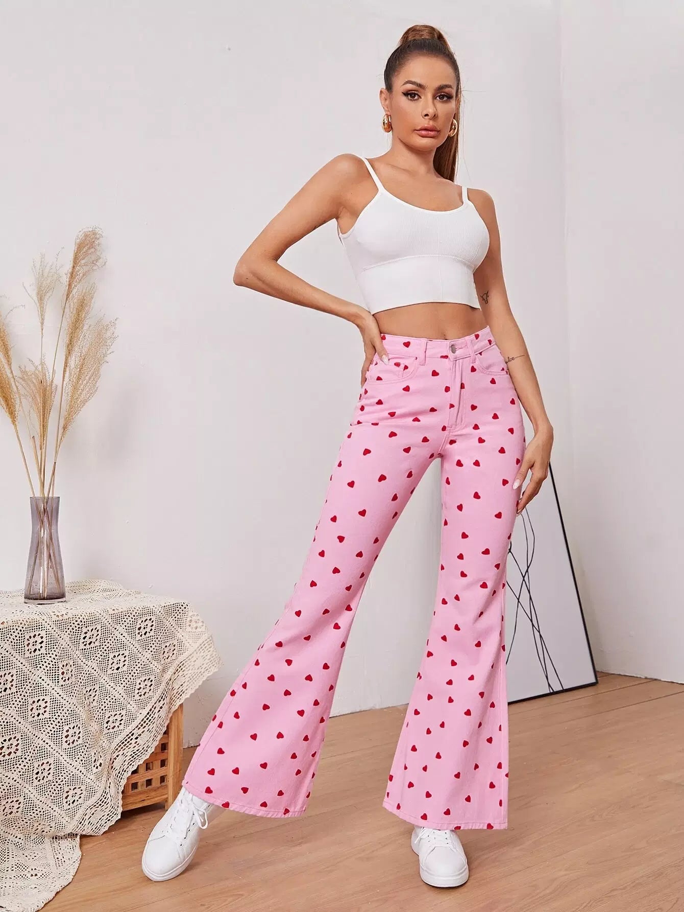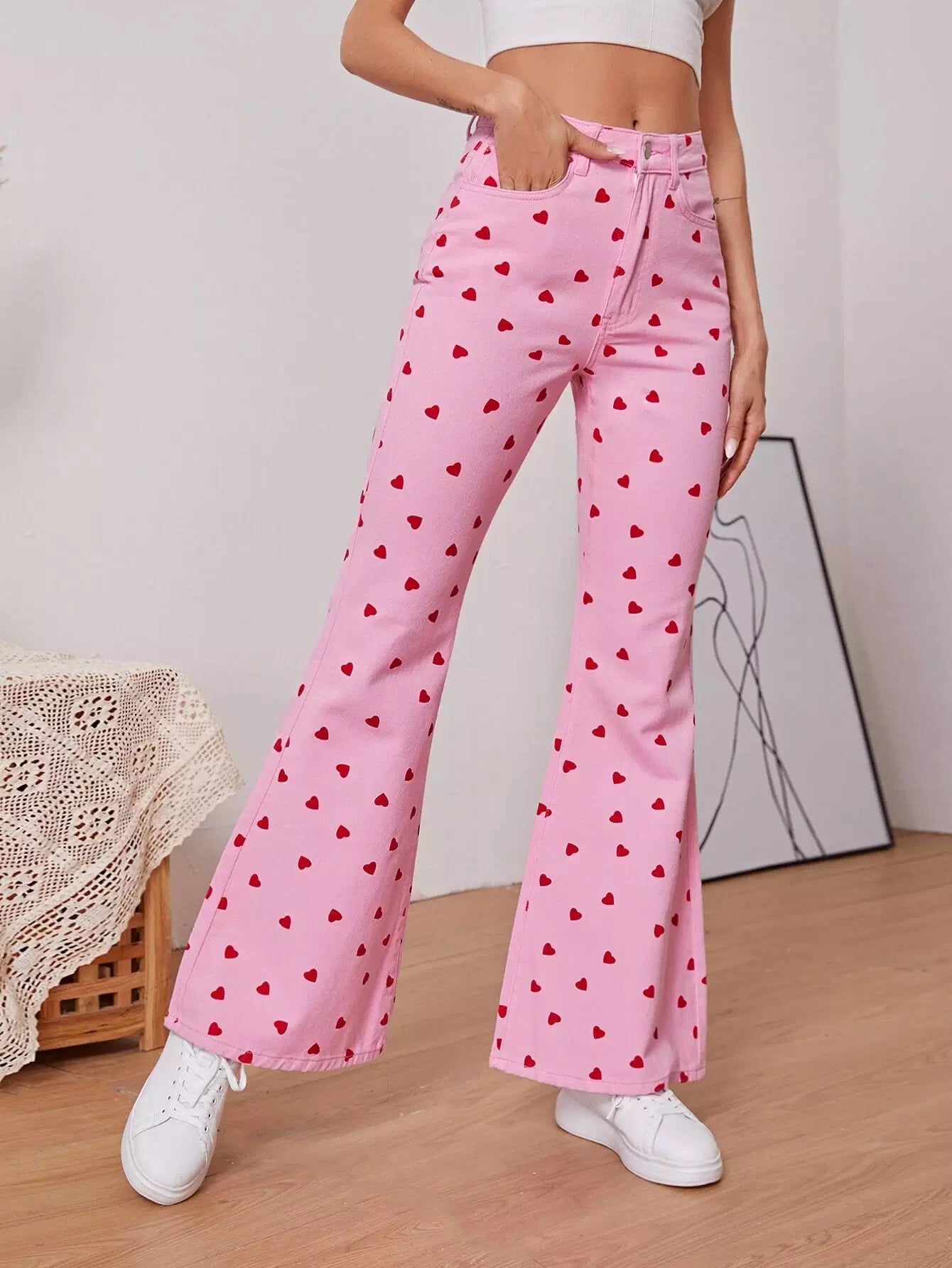 بنطلون جينز بطبعة قلب مطبوع على شكل قلب بخصر عالٍ وساق واسعة