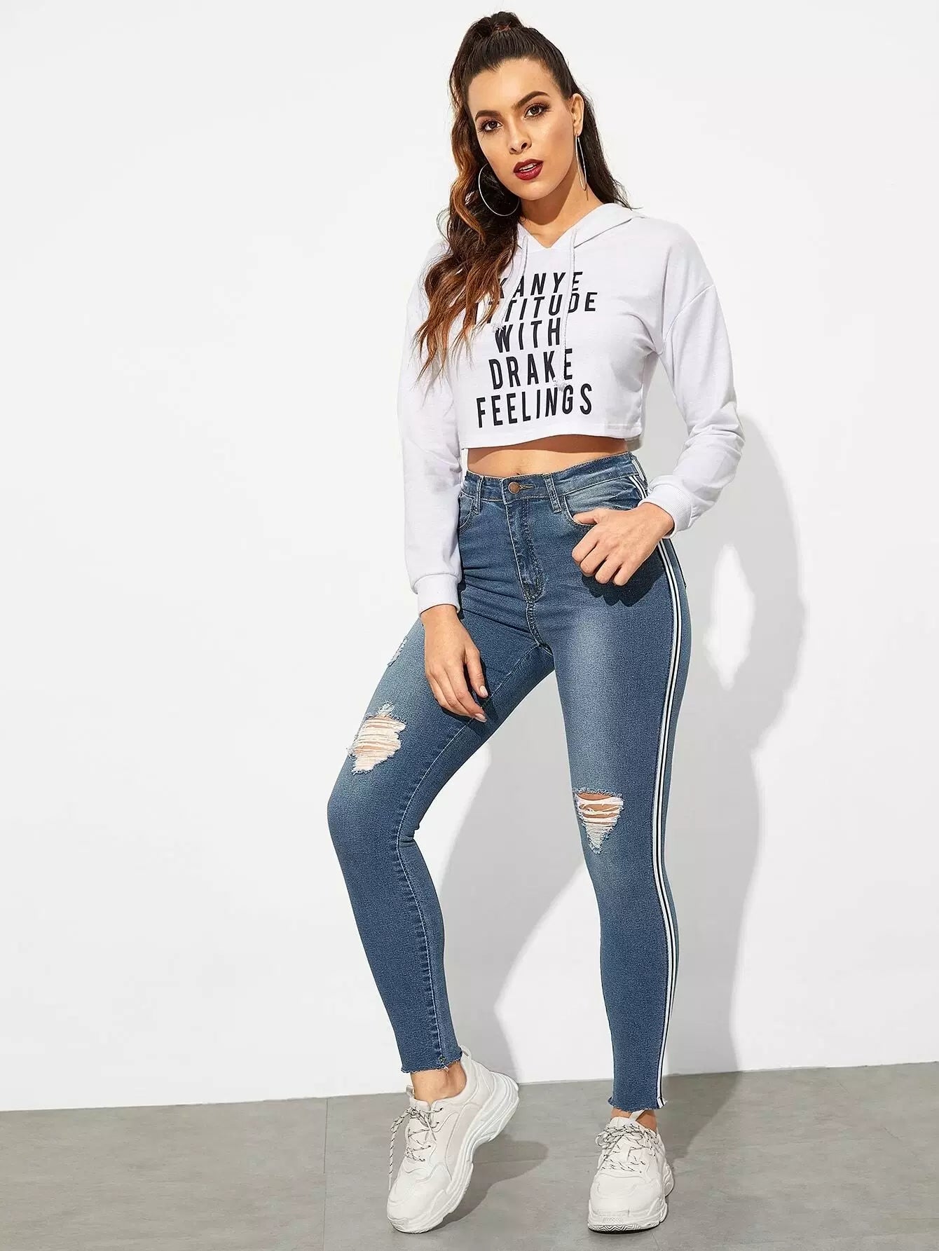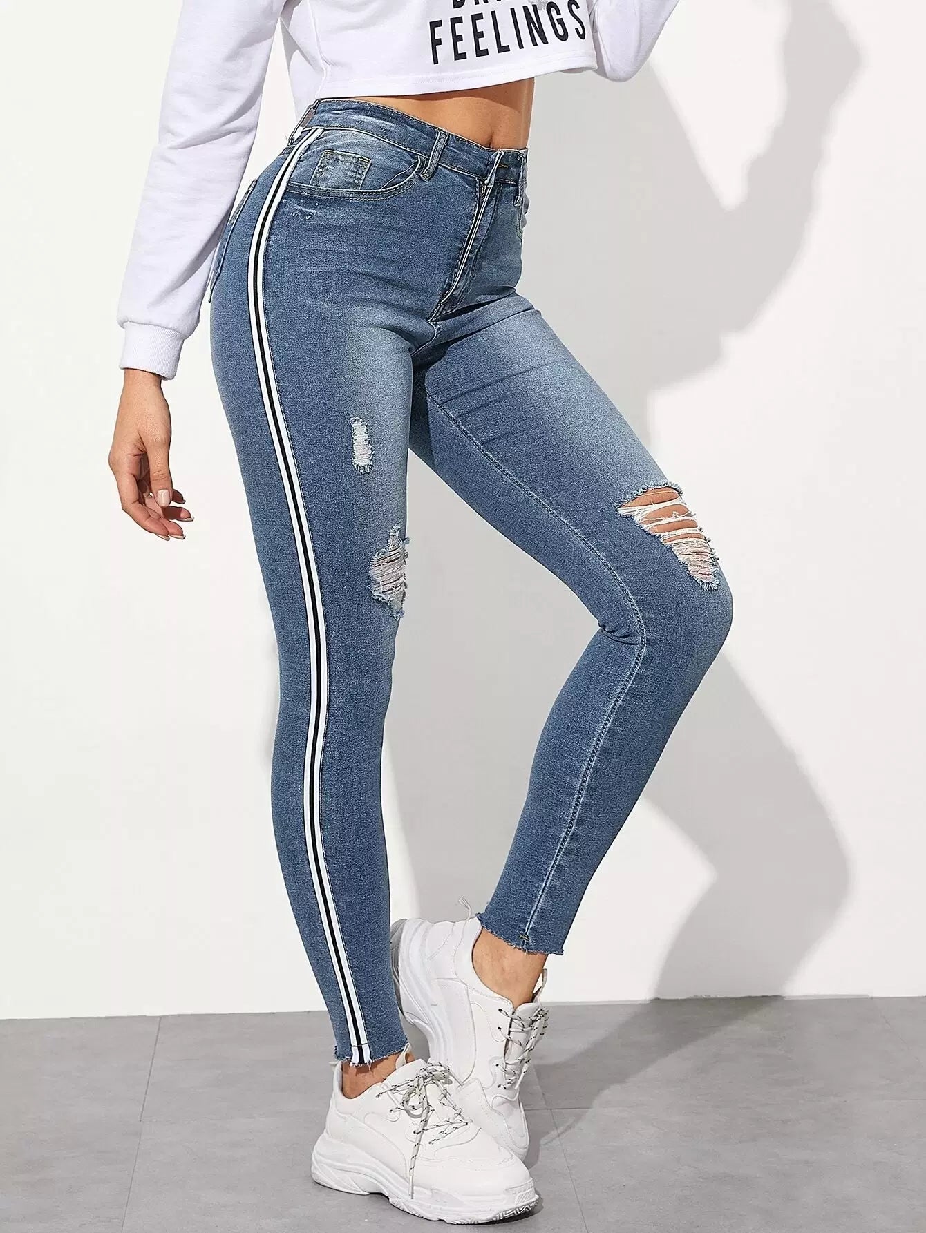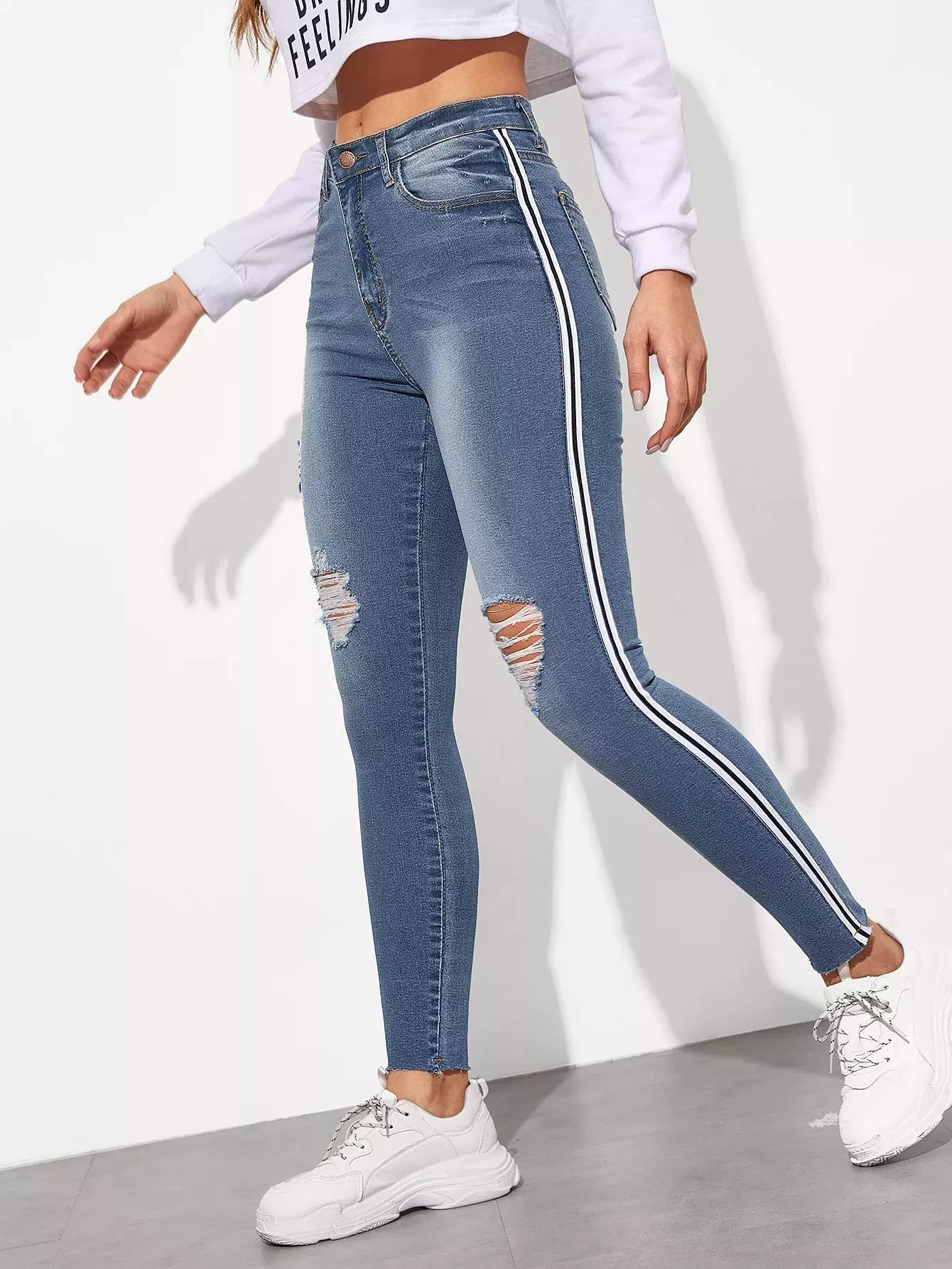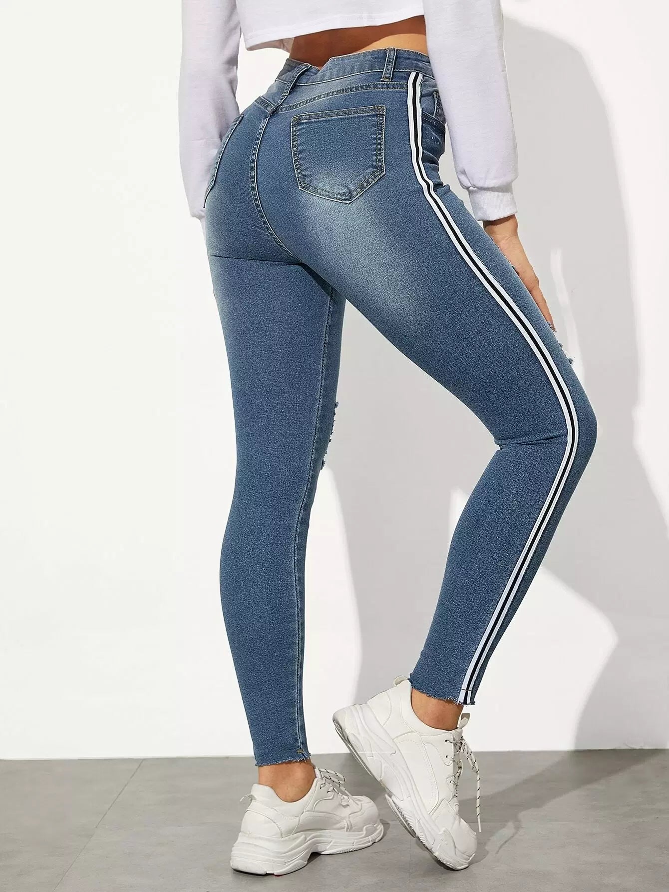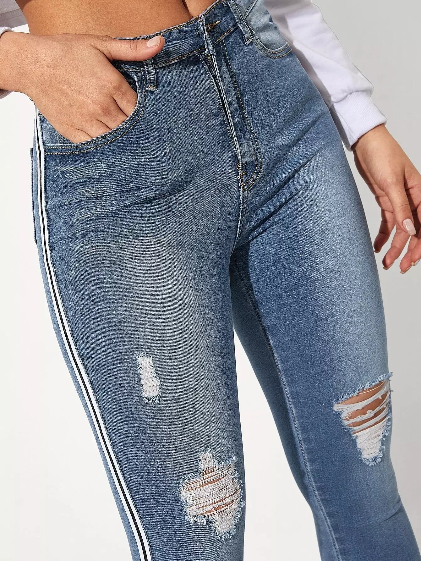 بنطلون جينز ضيق ممزق بشريط جانبي مطاطي عالي التمدد