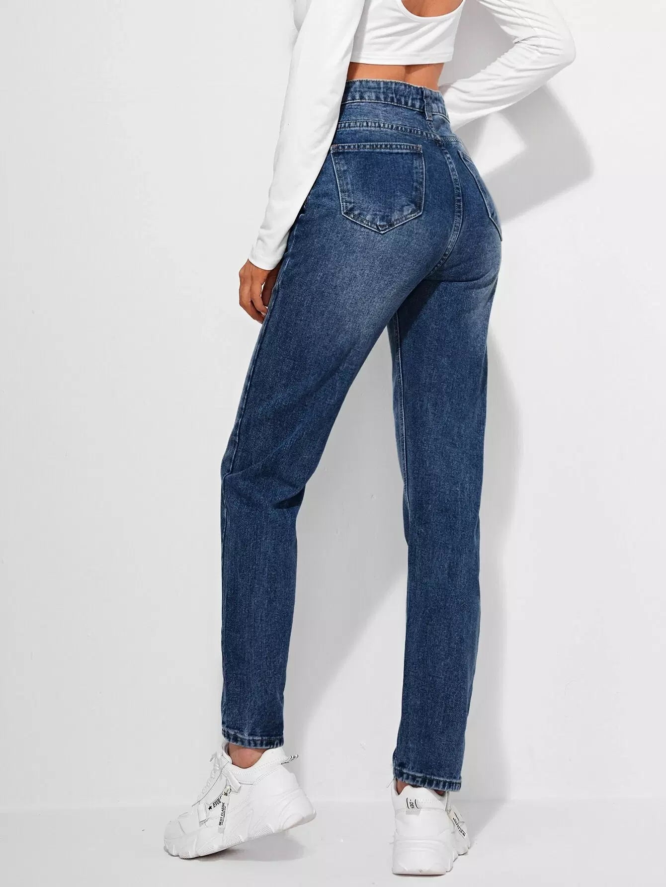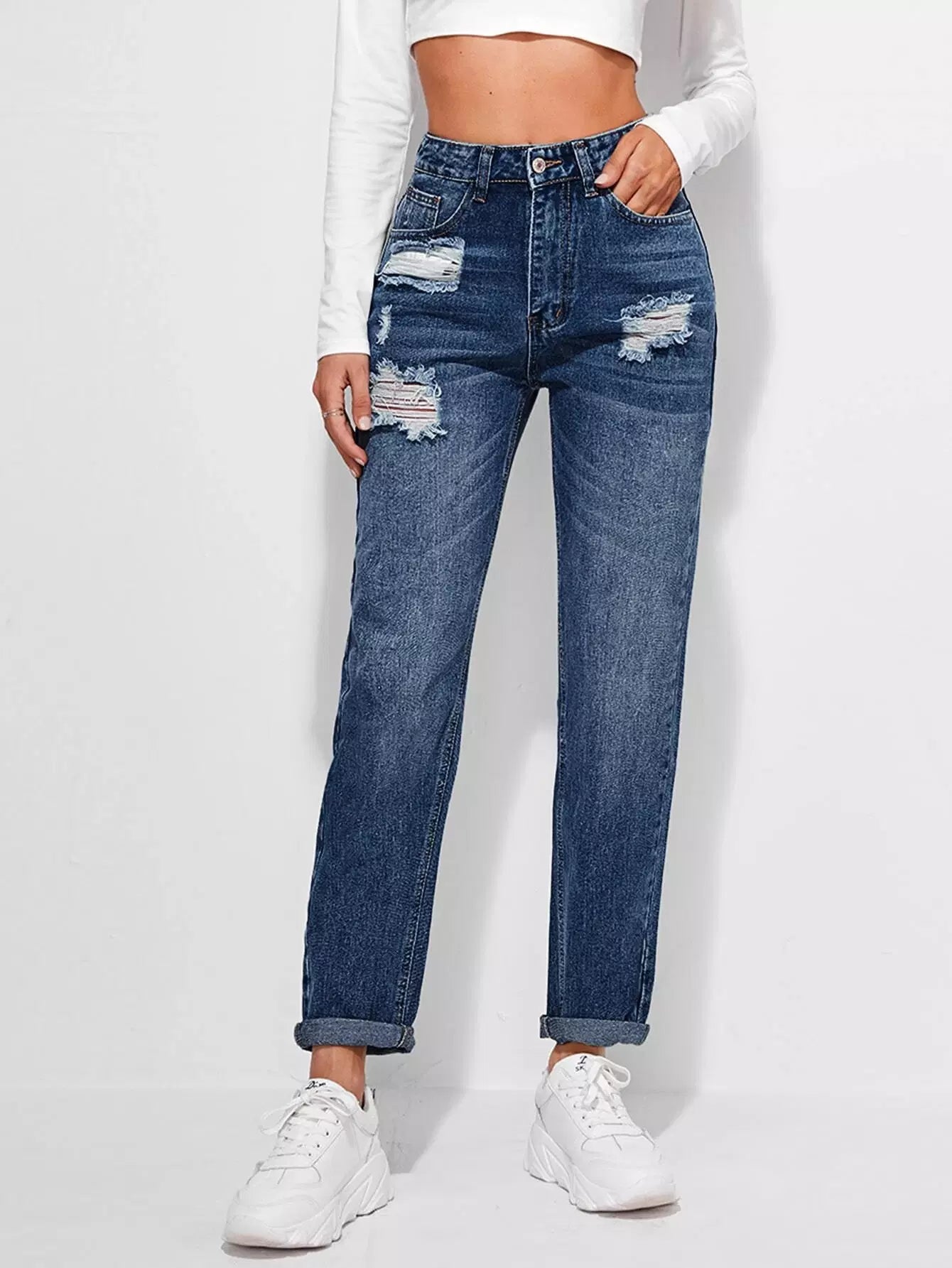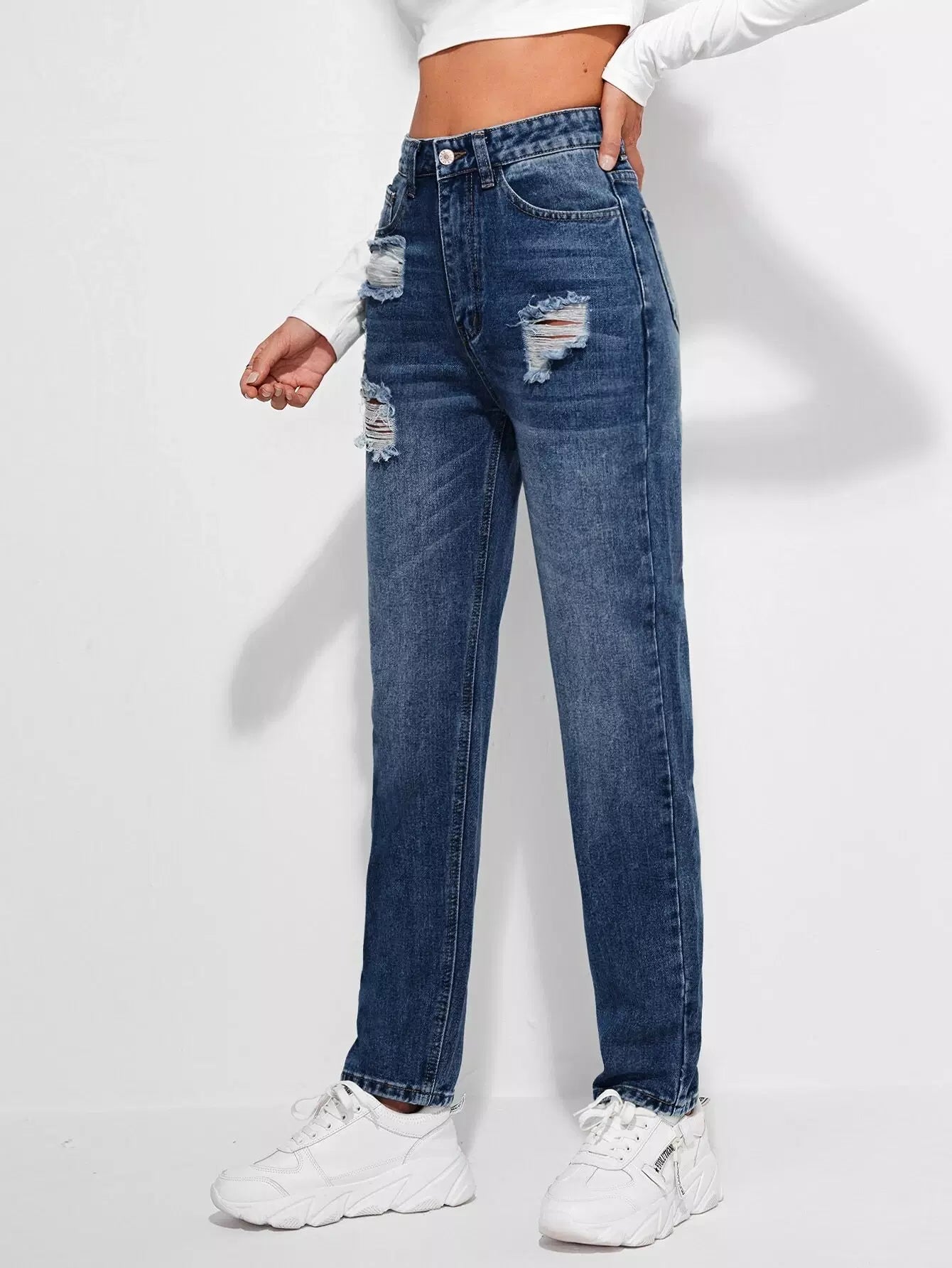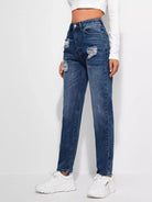 بنطلون جينز مستقيم ممزق عالي الخصر مغسول باللون الأبيض