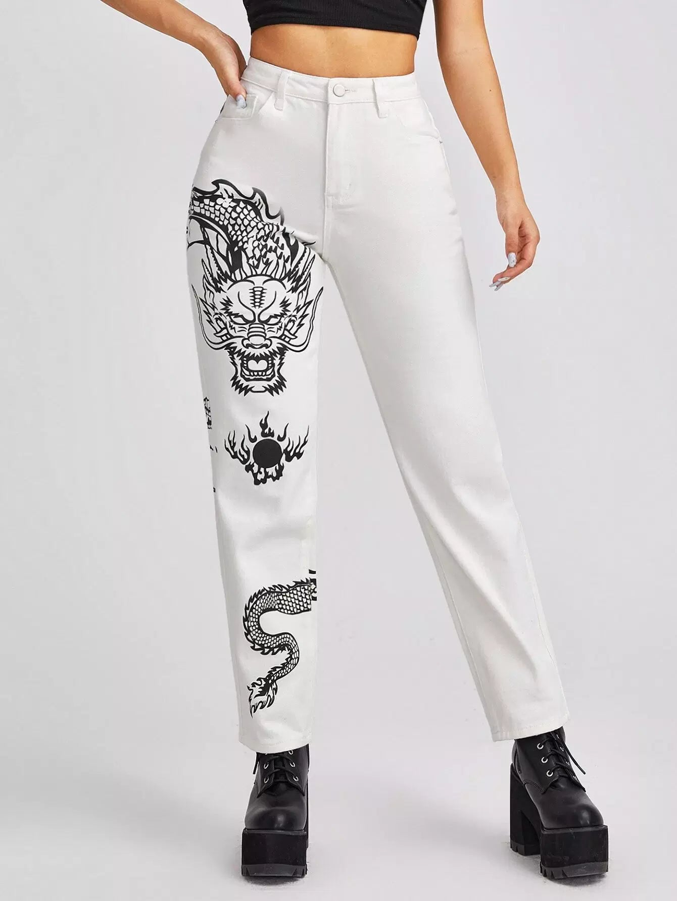 للنساء - جينز عالي الخصر بطبعة التنين الصيني