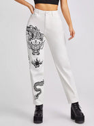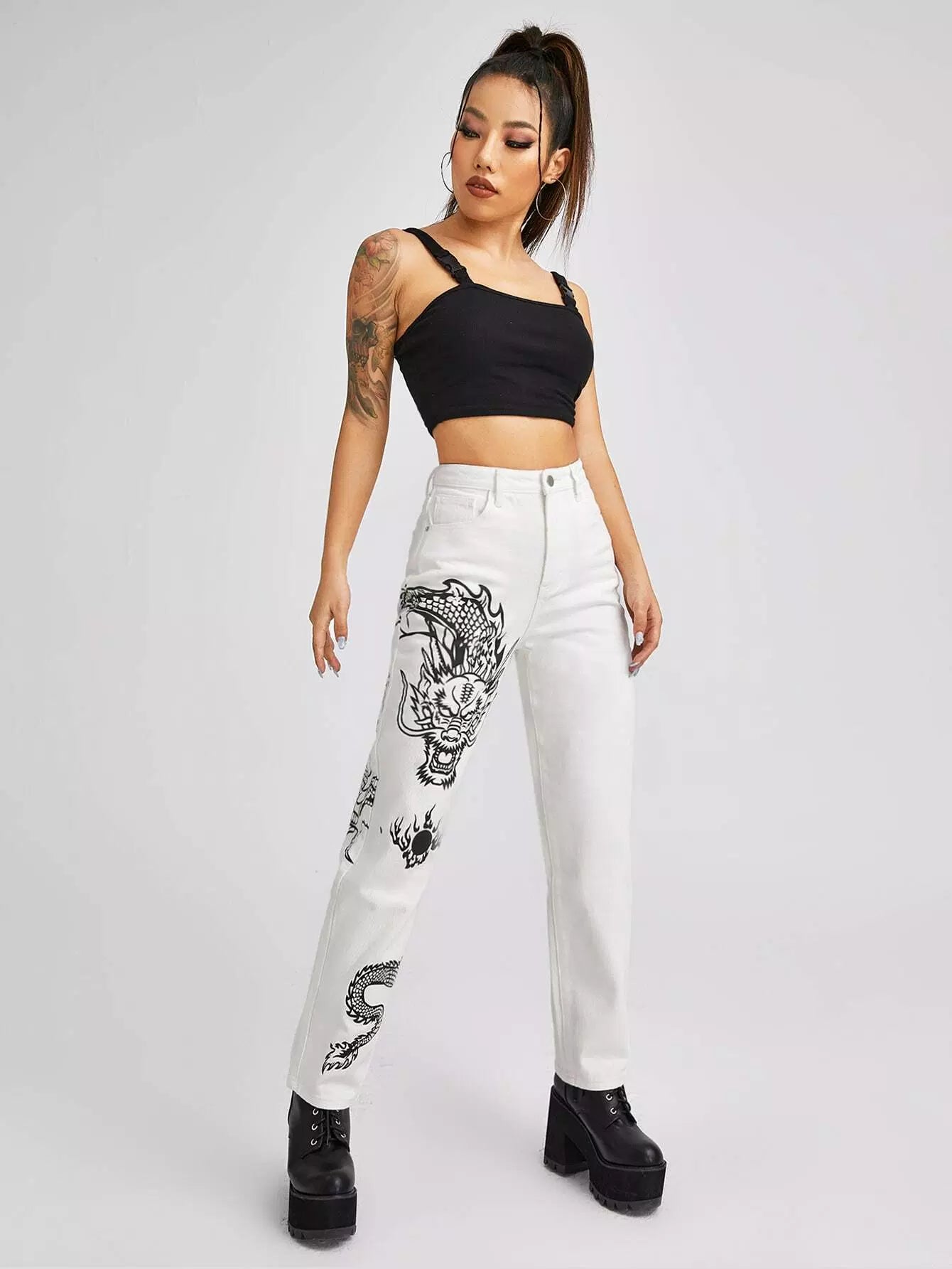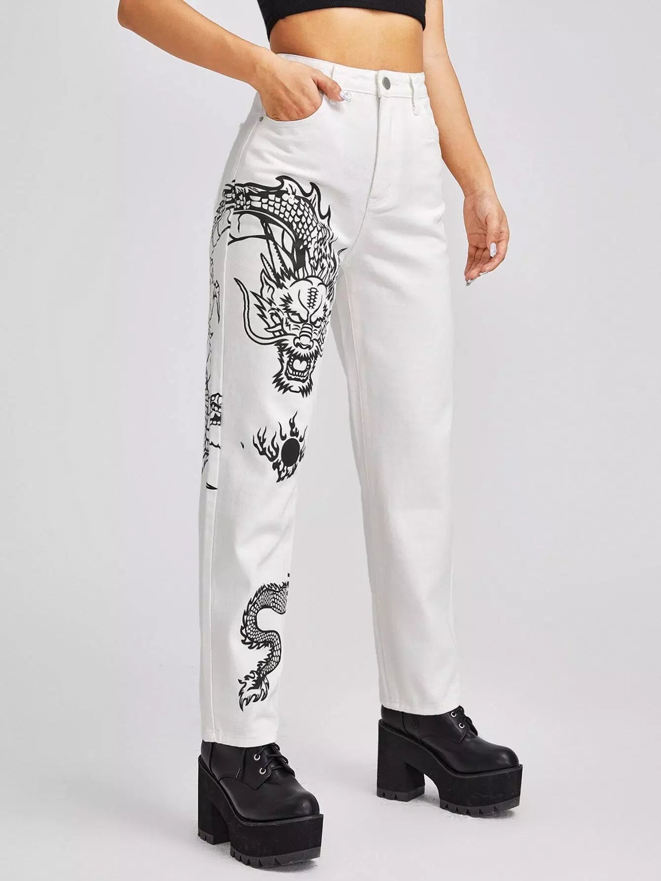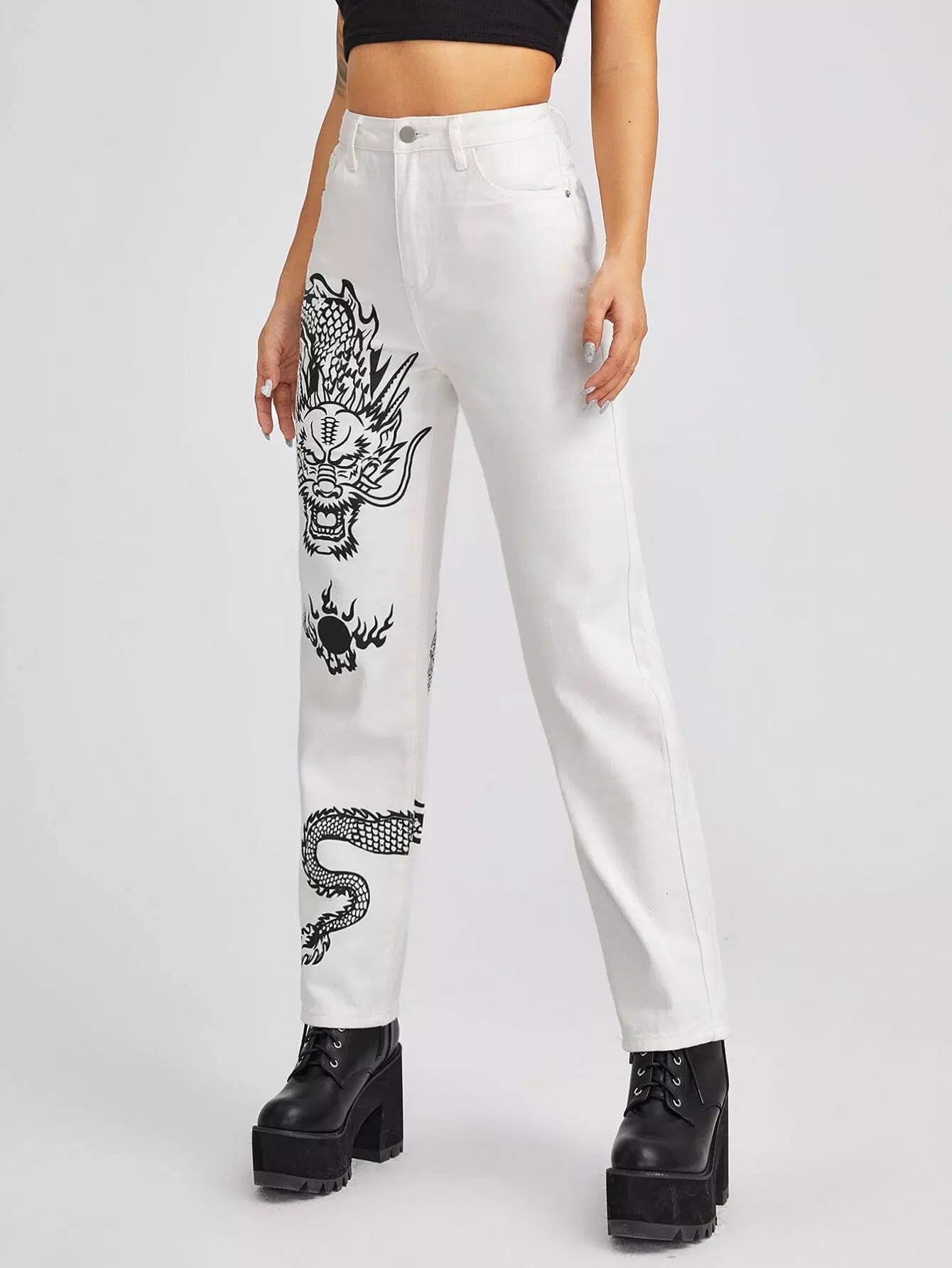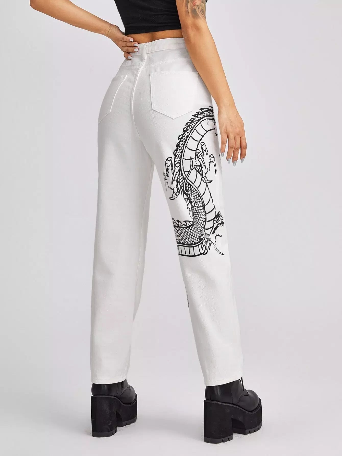 بنطلون جينز بطبعة تنين صيني عالي الخصر