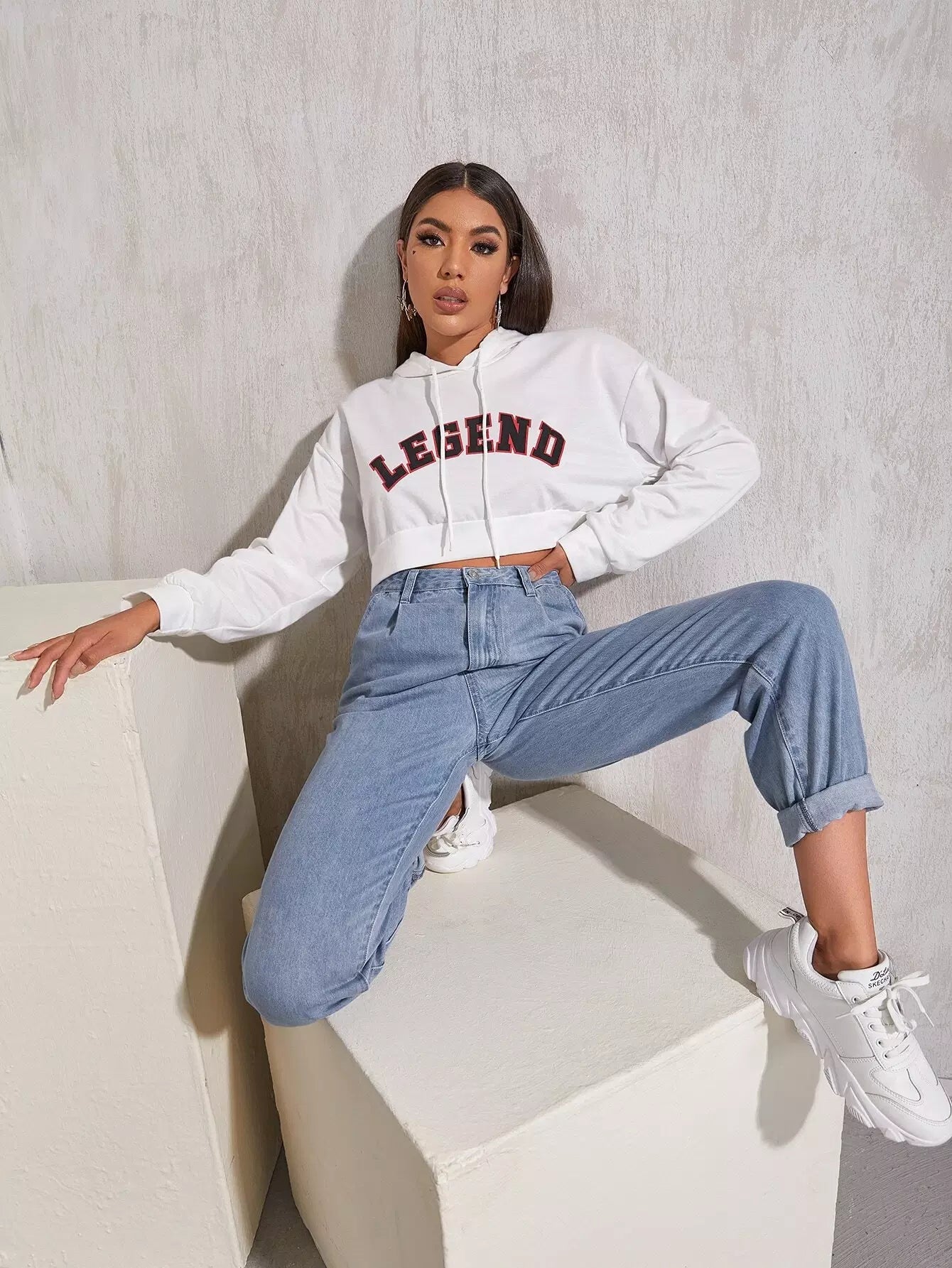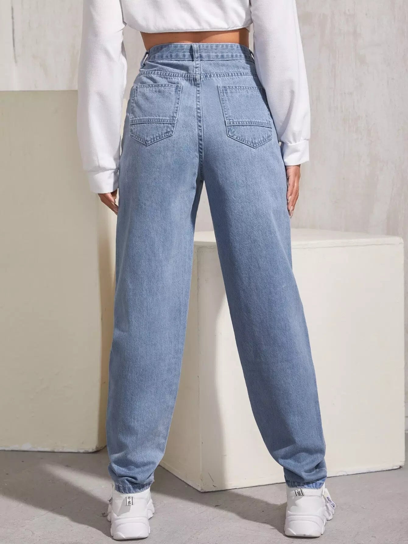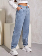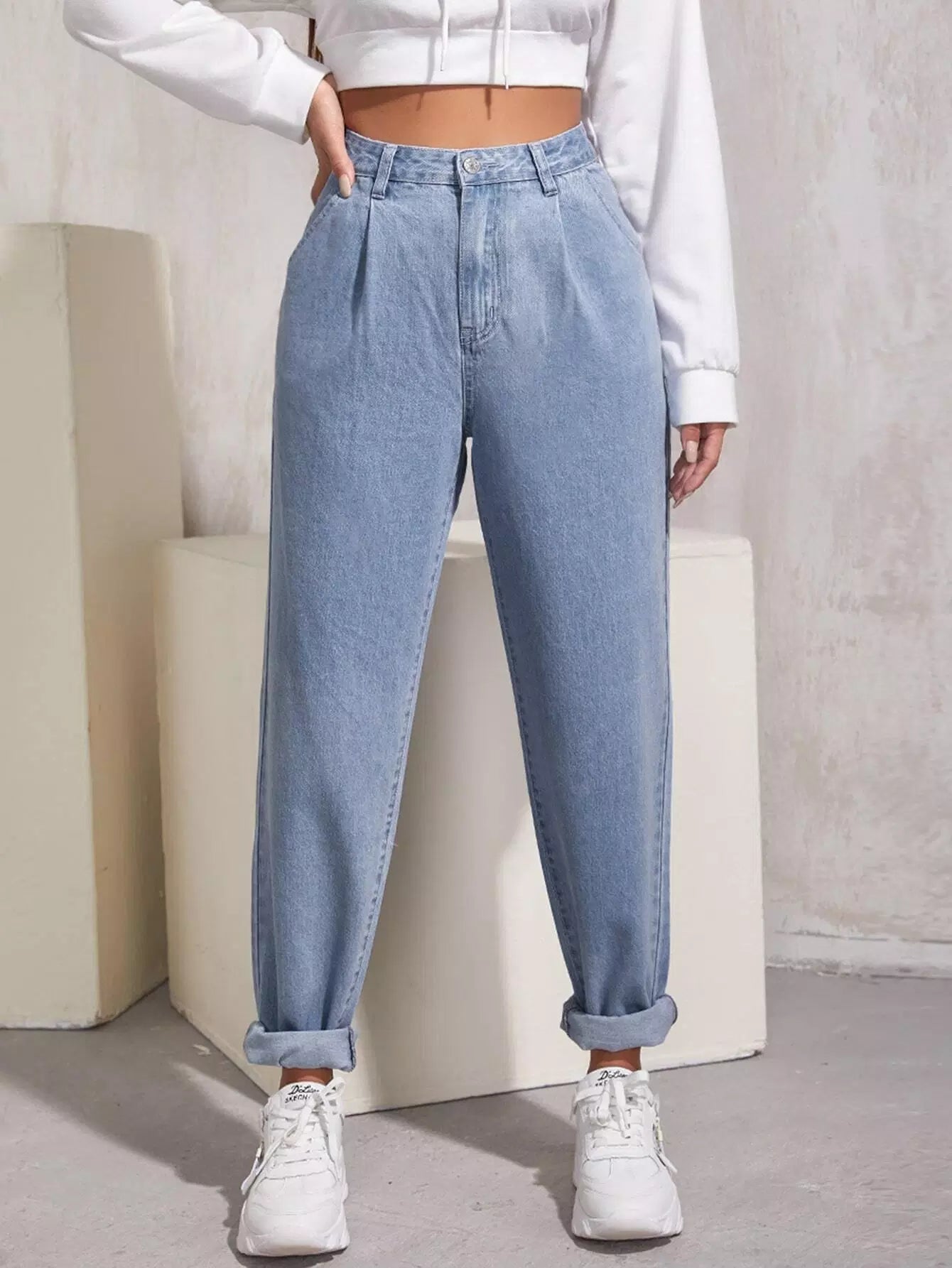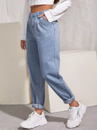 بنطلون جينز ذو خصر عالٍ مطوي بطيات ملفوفة الحواف