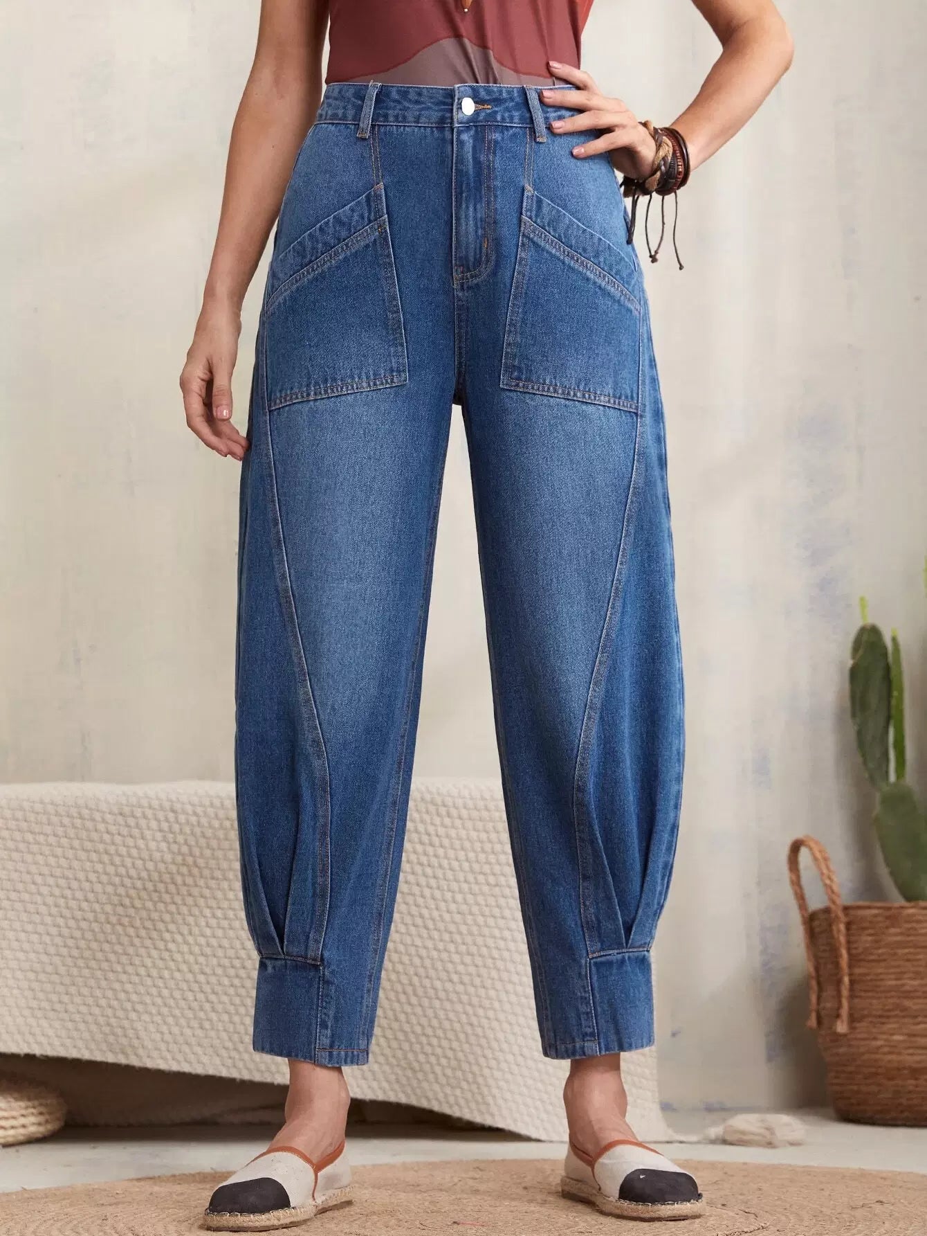 بنطلون جينز بخصر مرتفع وحافة مطوية