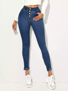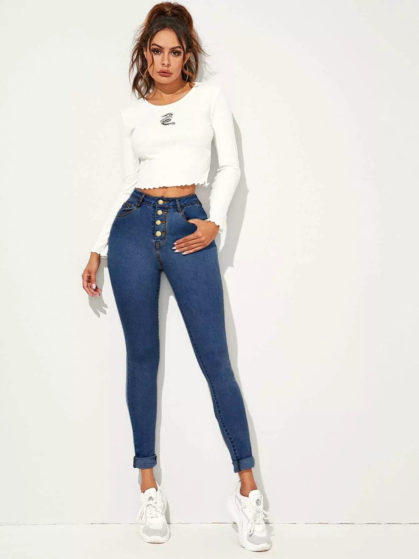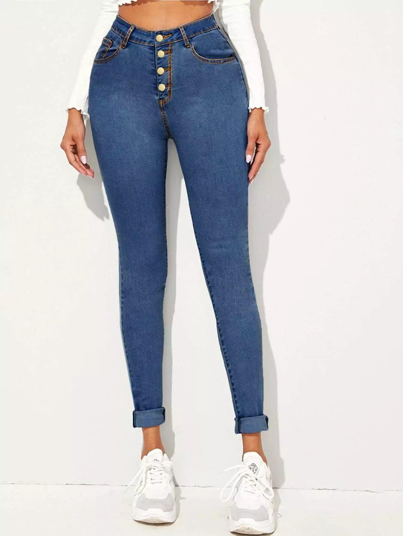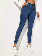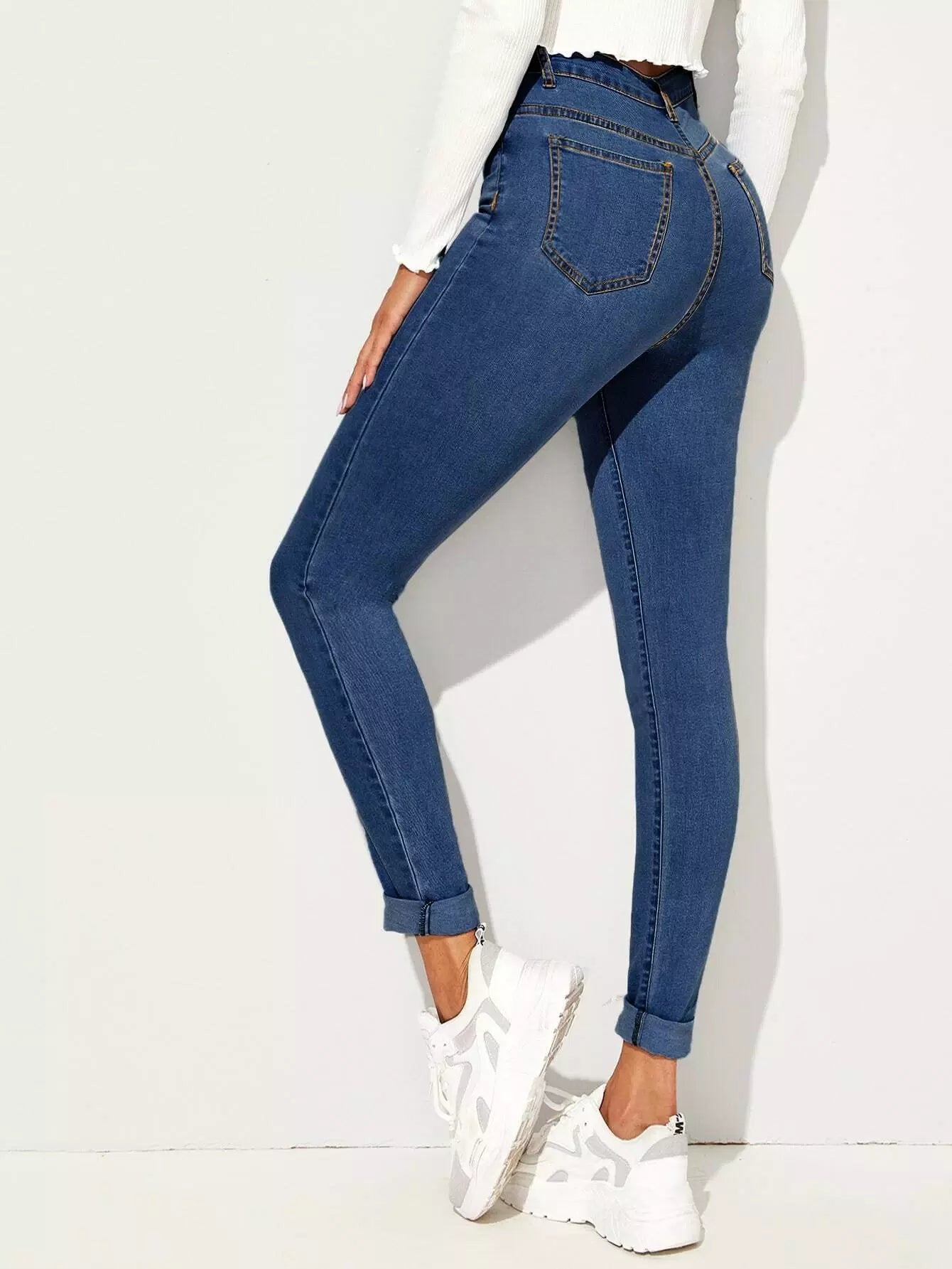 بنطلون جينز بخصر عالٍ وحواف مطوية عالية الخصر عالية التمدد