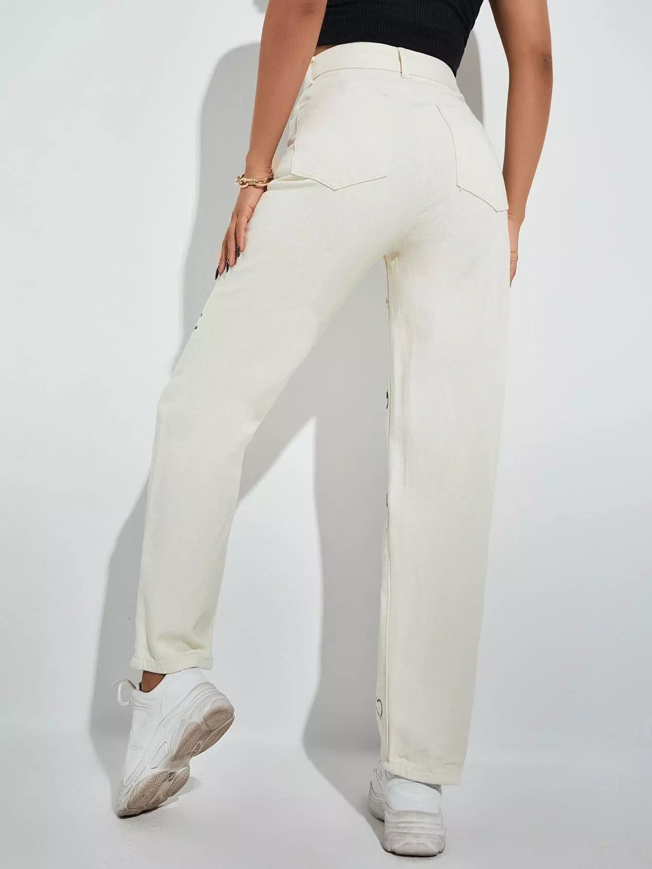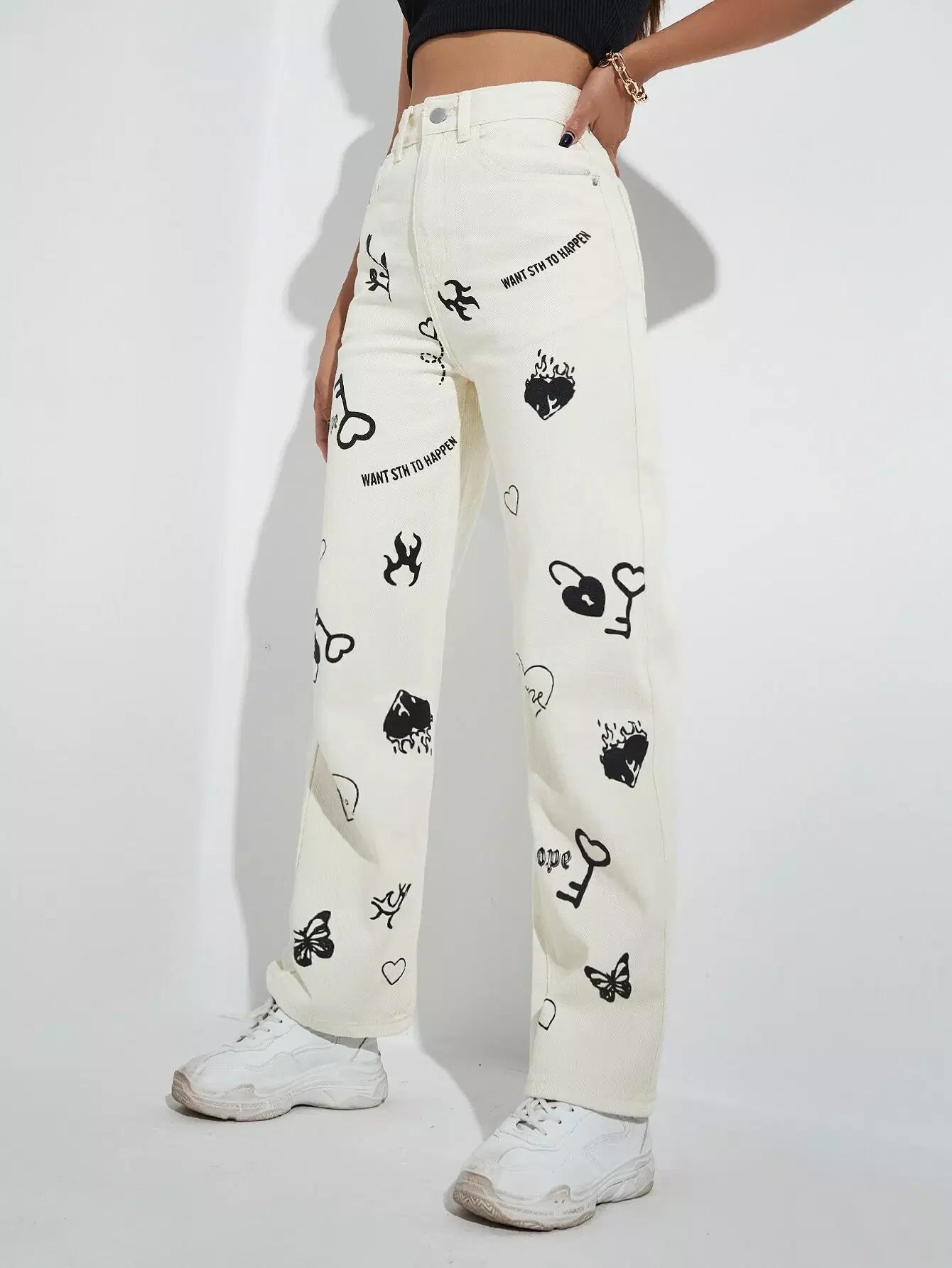 بنطلون جينز بخصر عالٍ مطبوع عليه حروف ورسومات