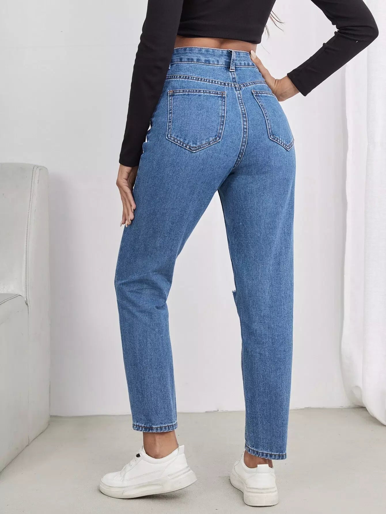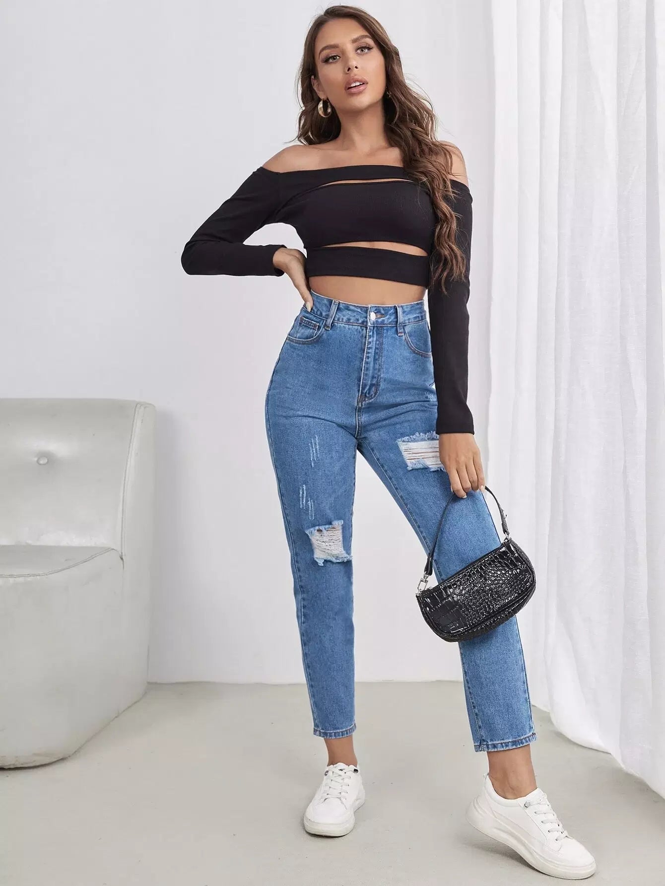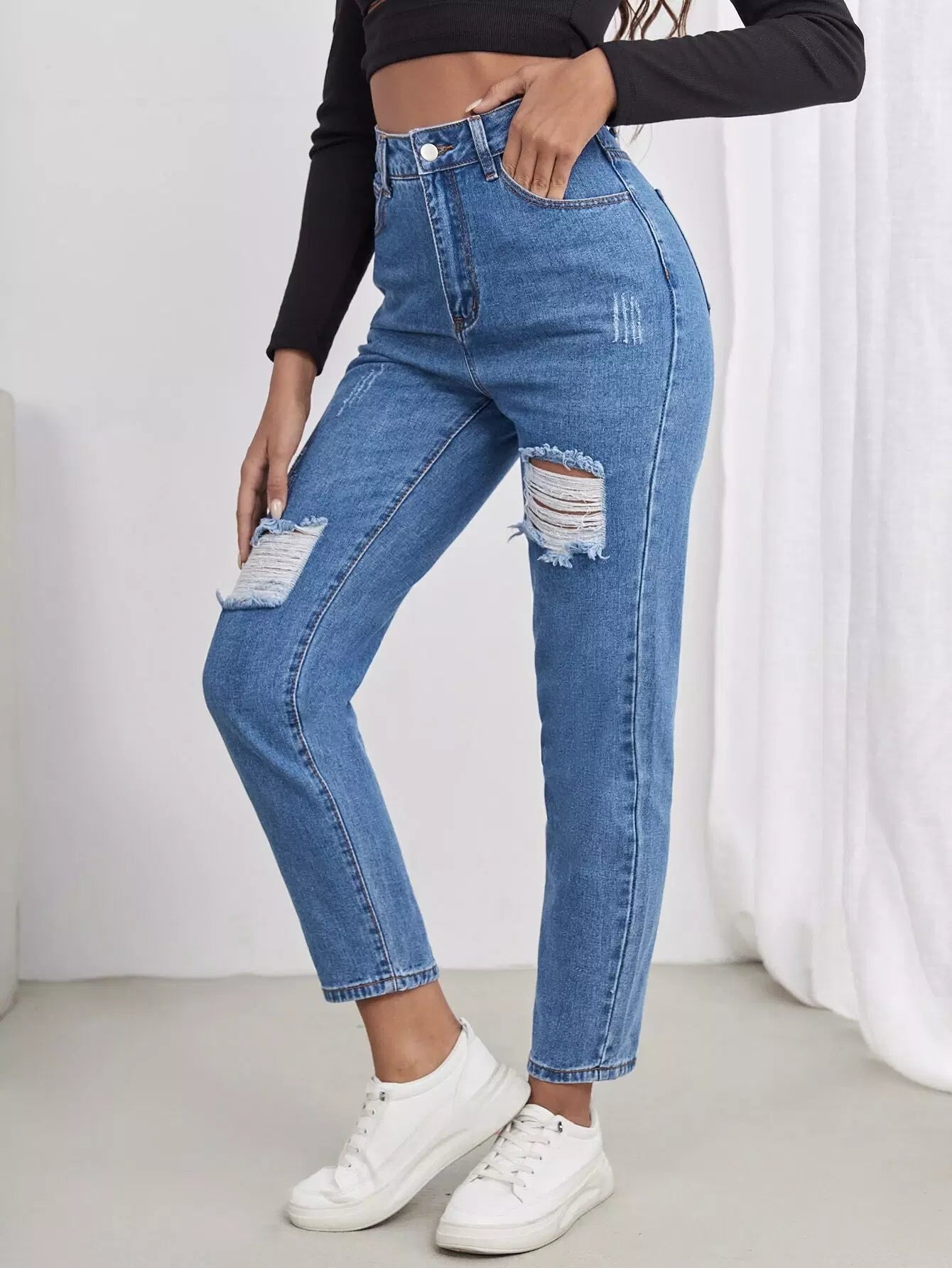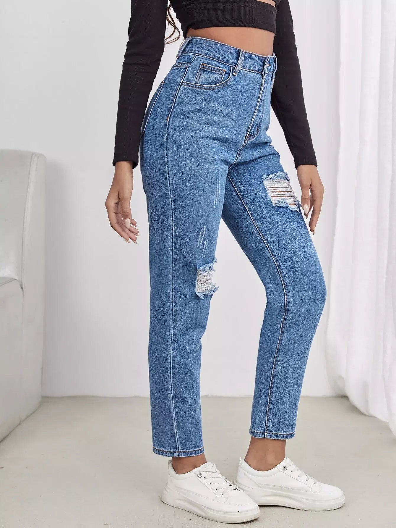 بنطلون جينز بخصر عالٍ ممزق بالجزر