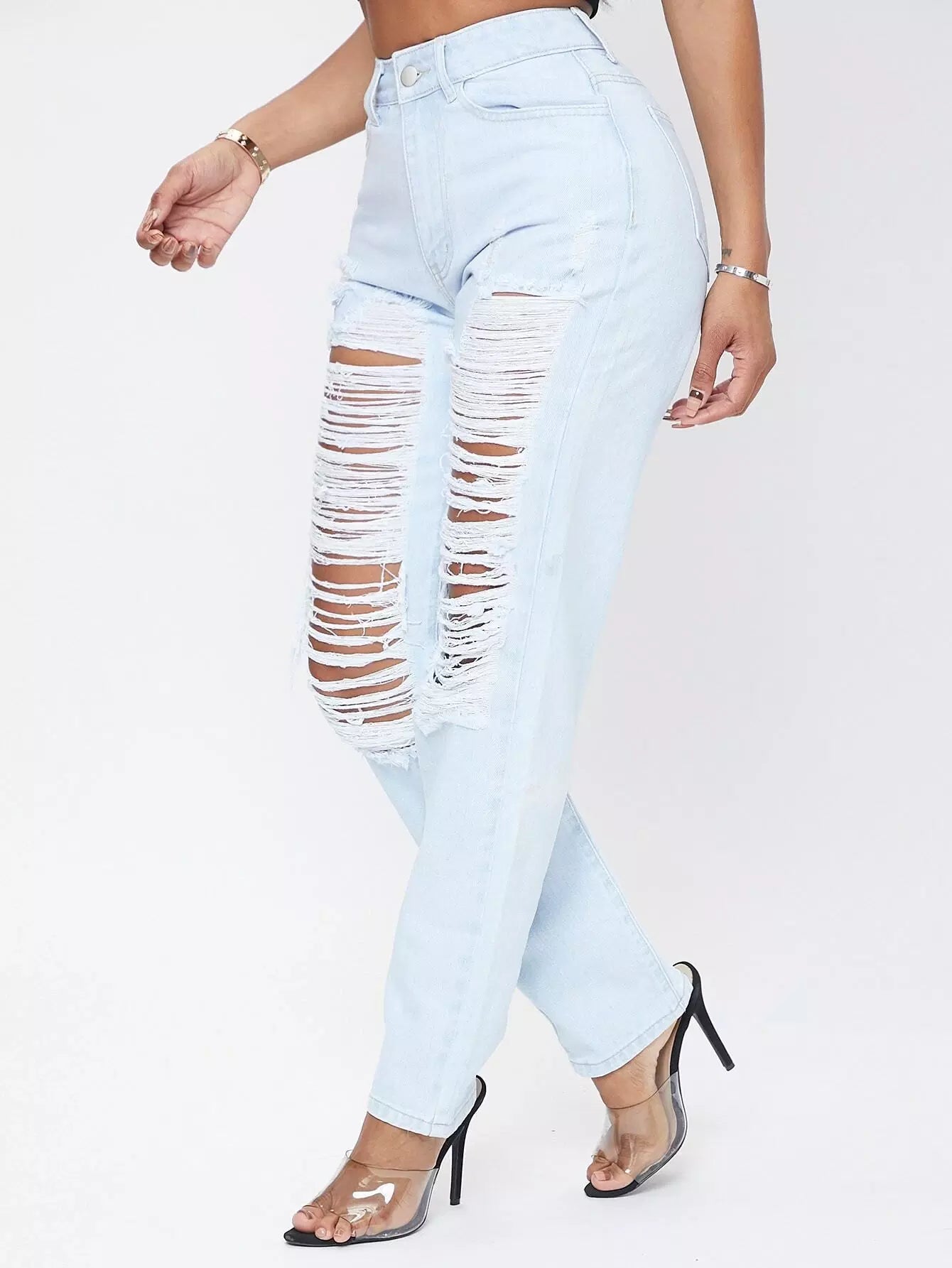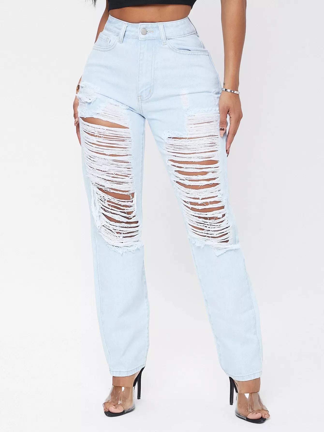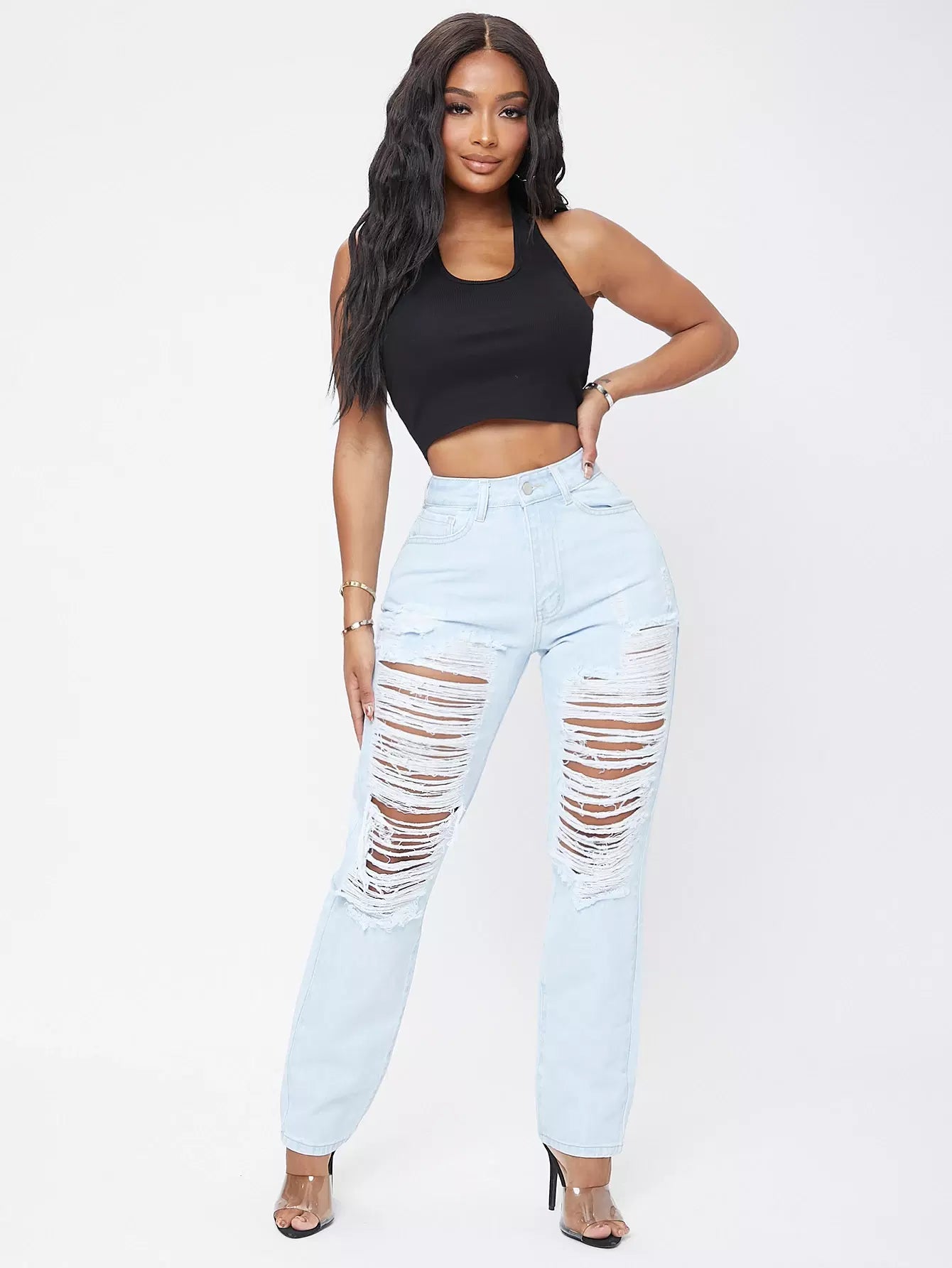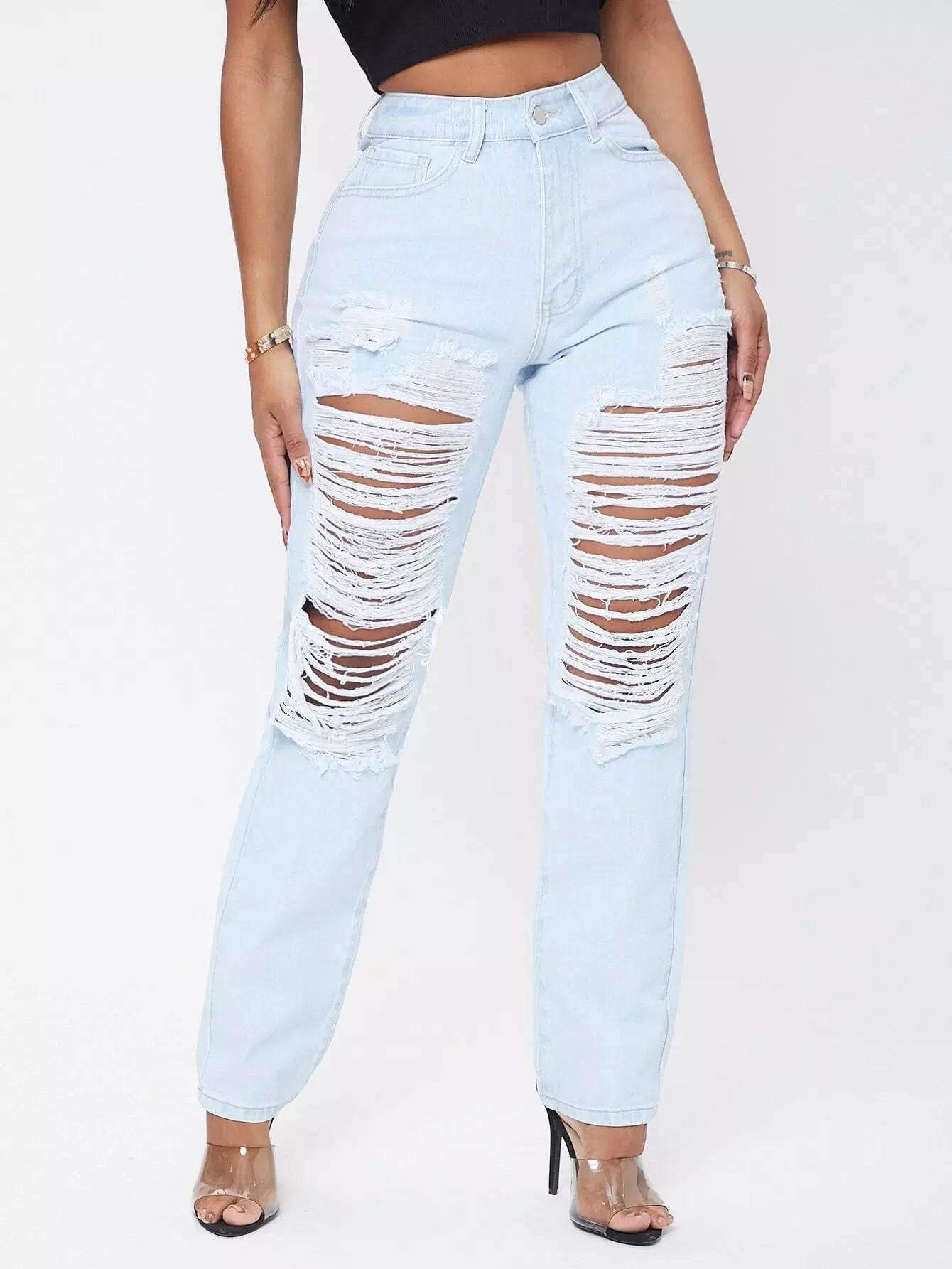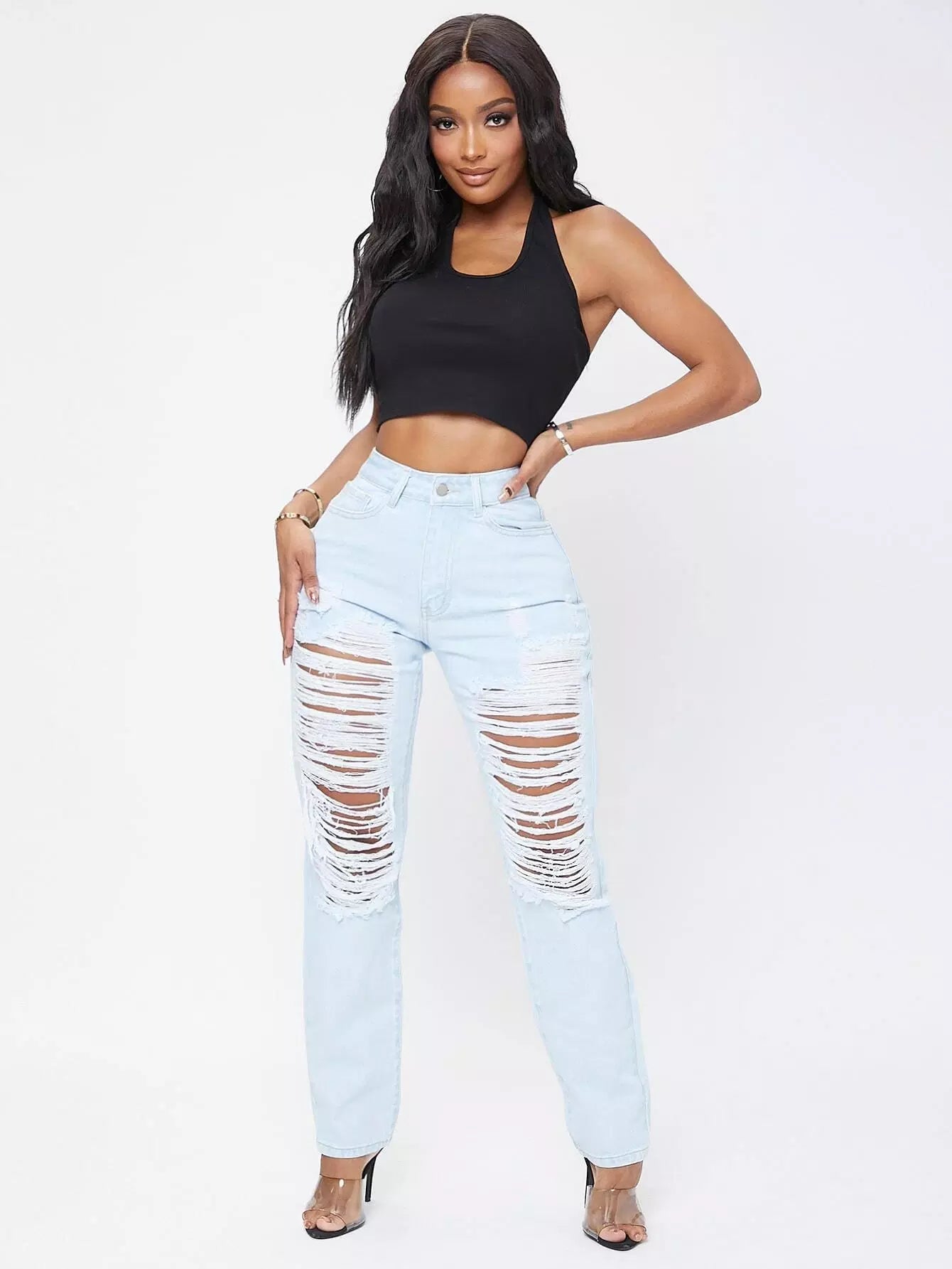 بنطلون جينز ممزق عالي الخصر ومتعرج