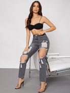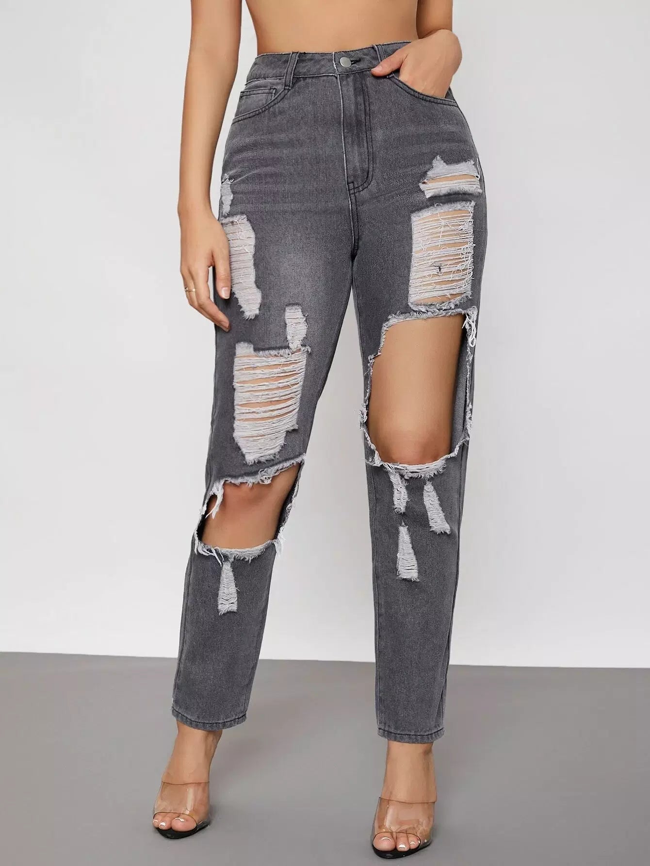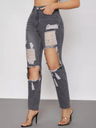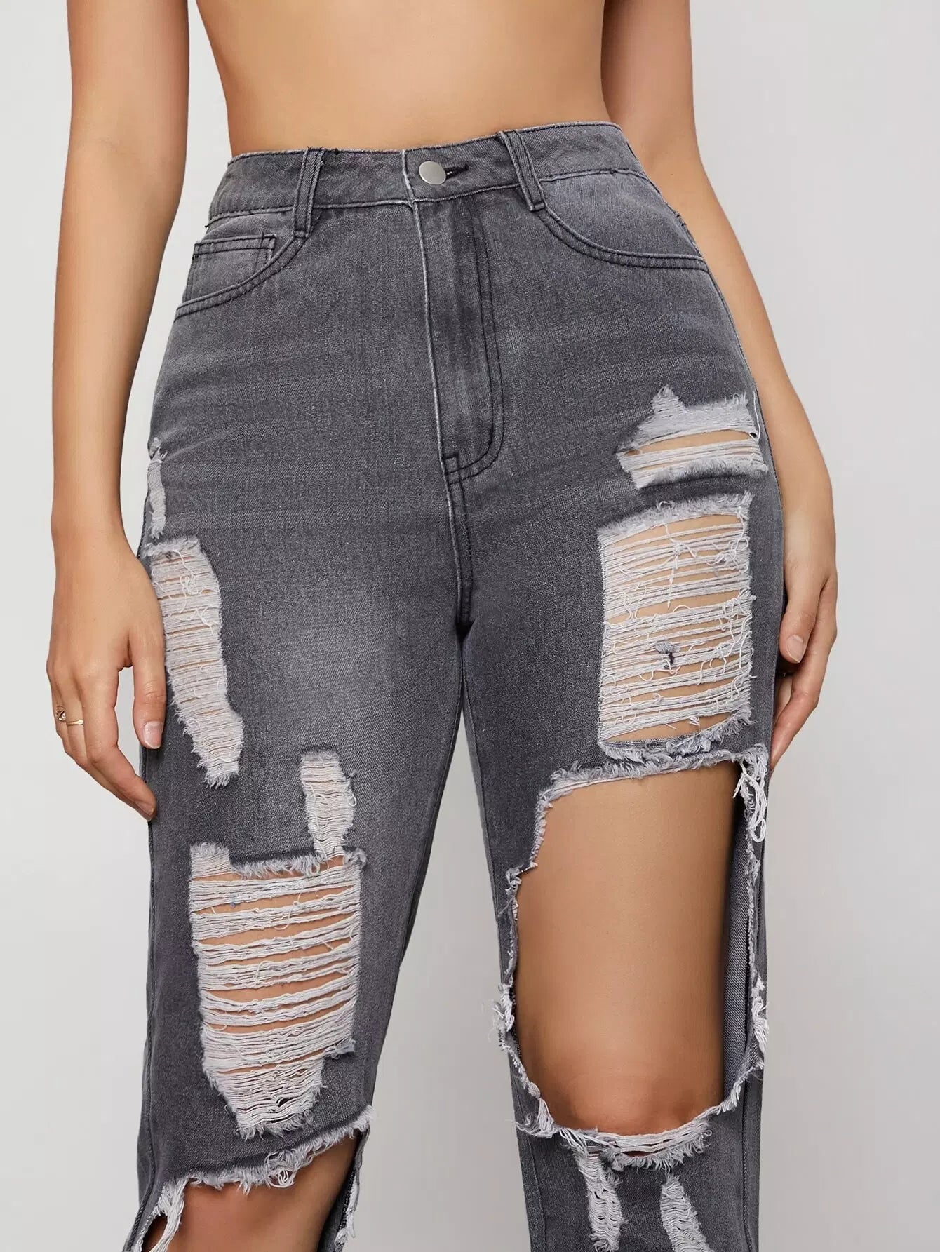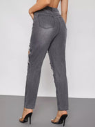 بنطلون جينز أم ممزق عالي الخصر ذو تفاصيل عالية الخصر