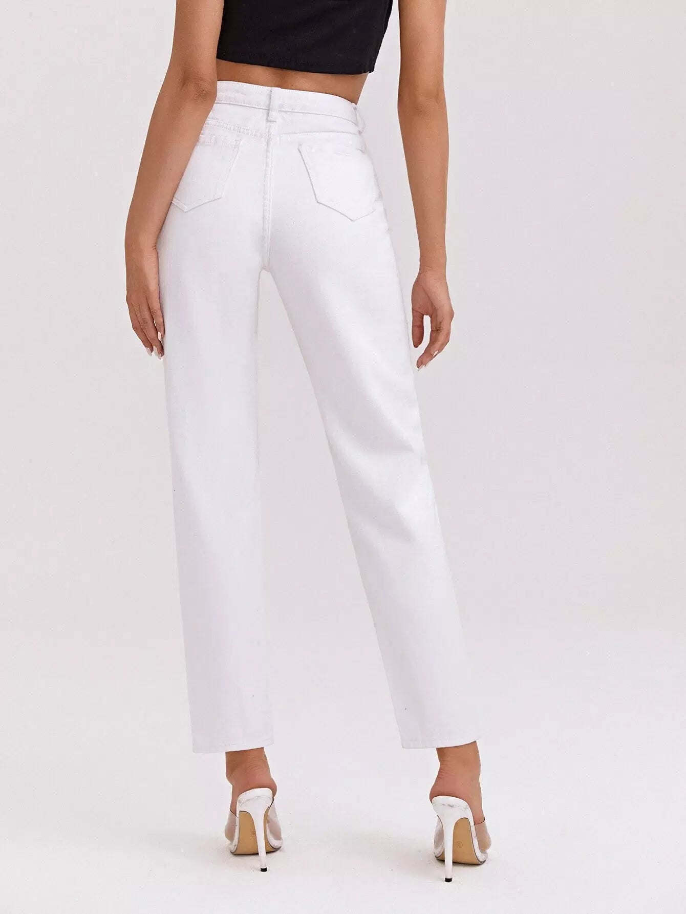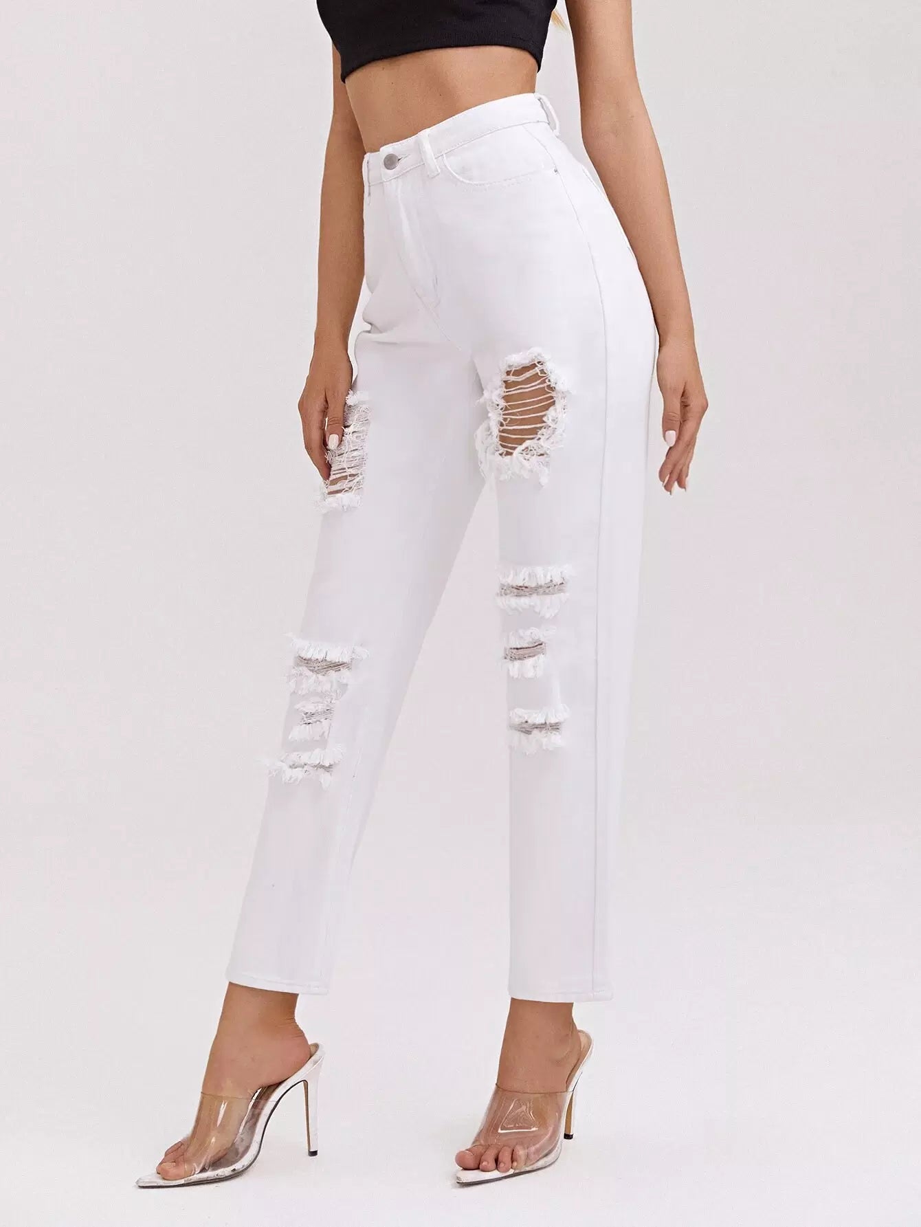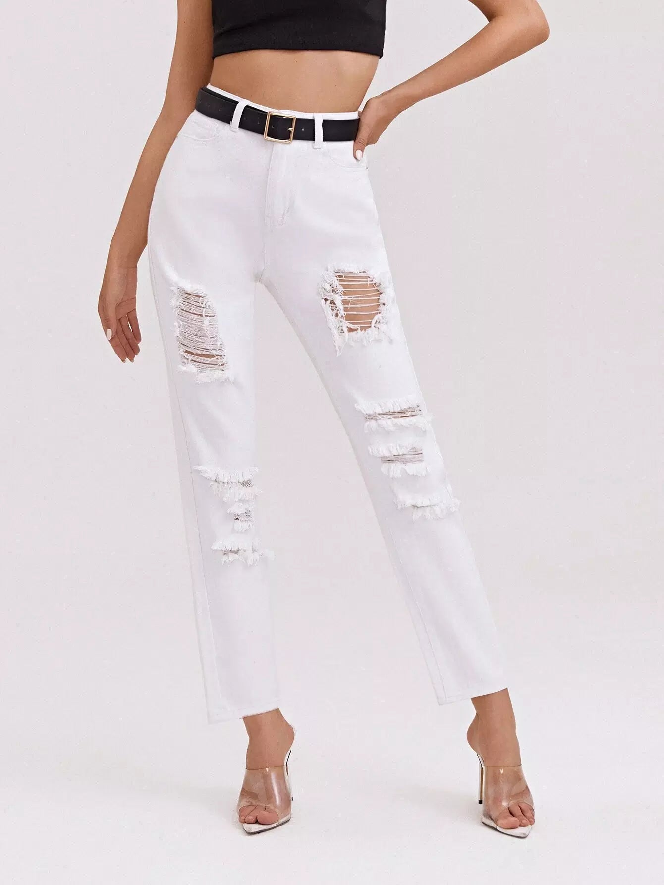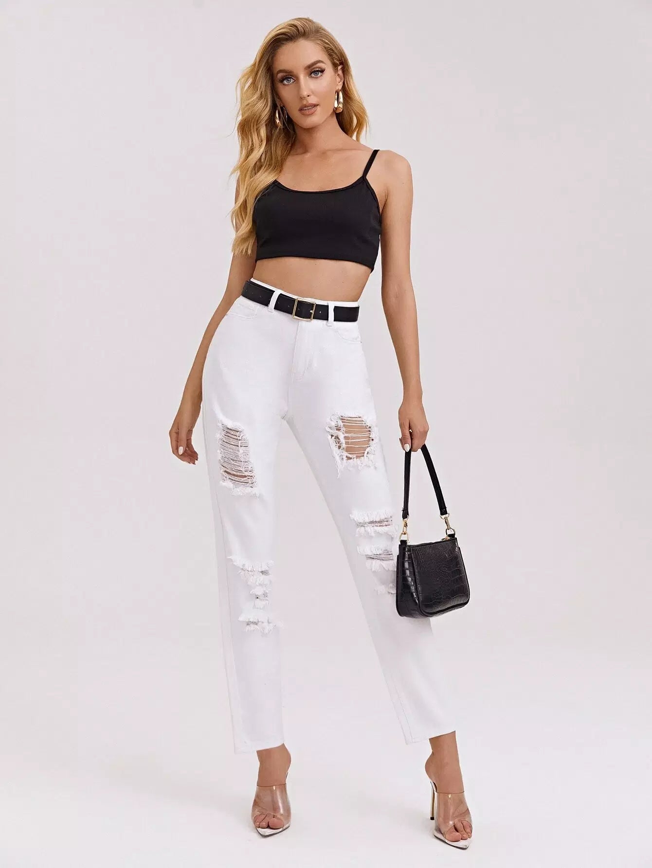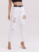 بنطلون جينز ممزق عالي الخصر بدون حزام