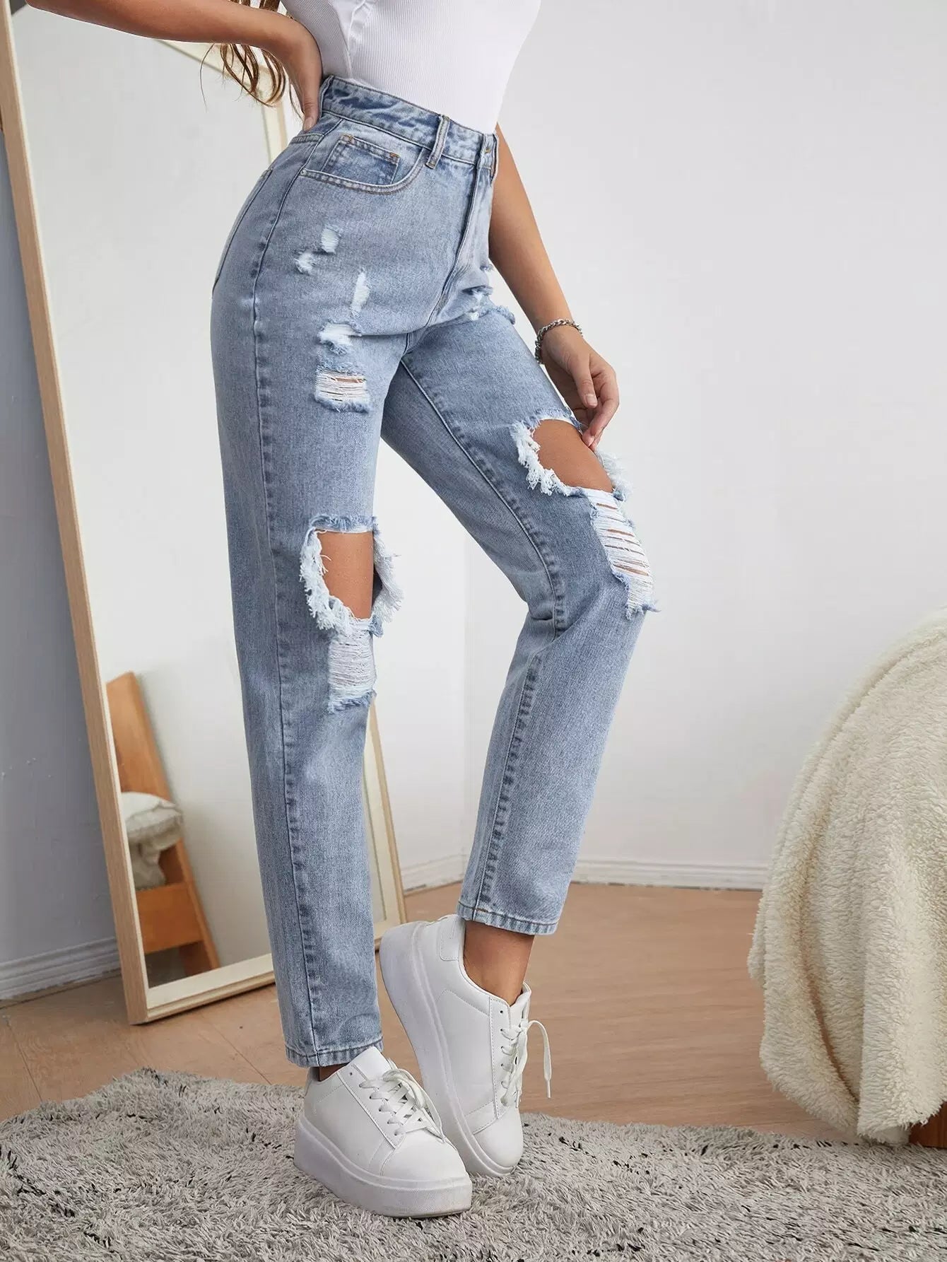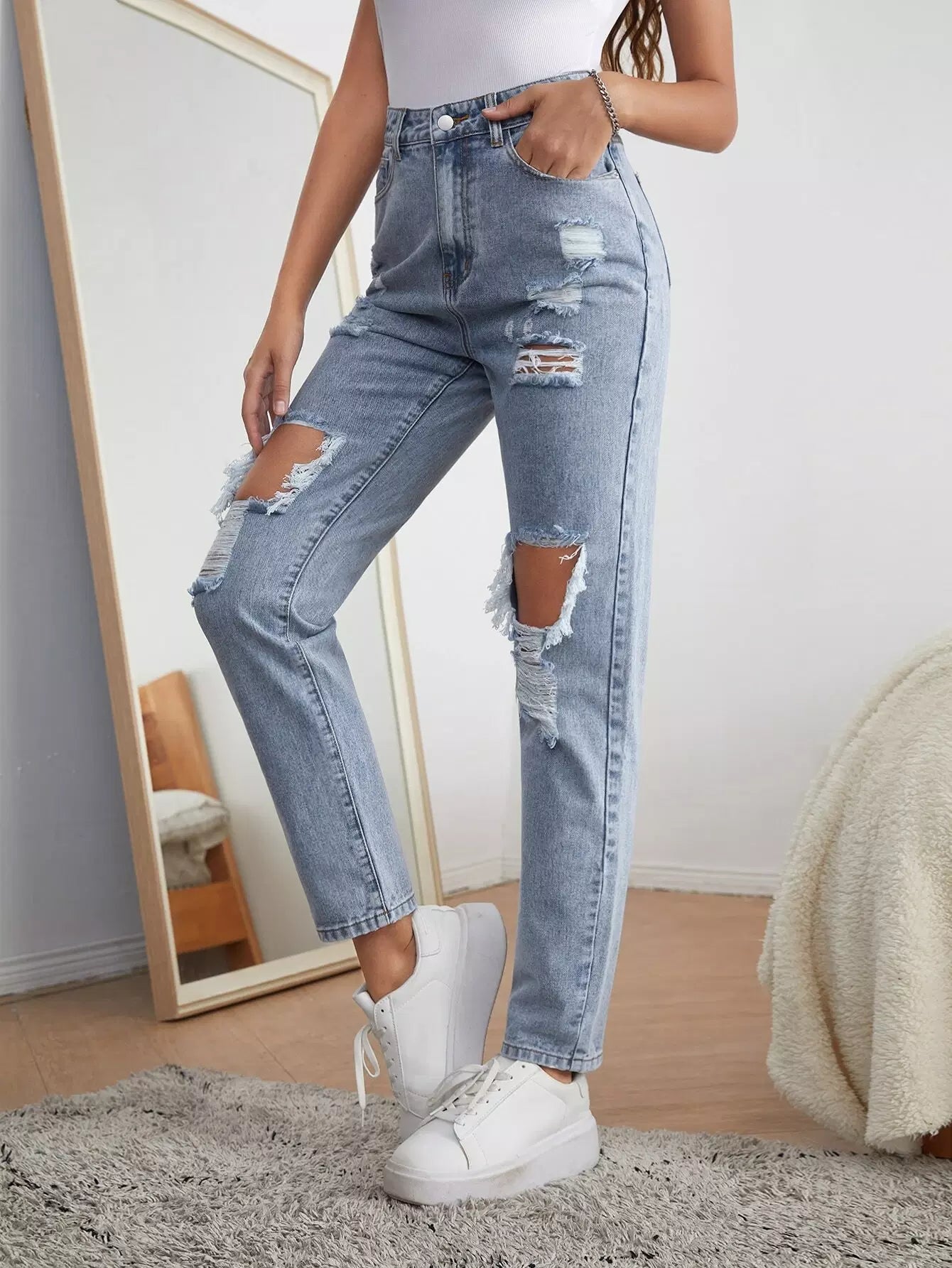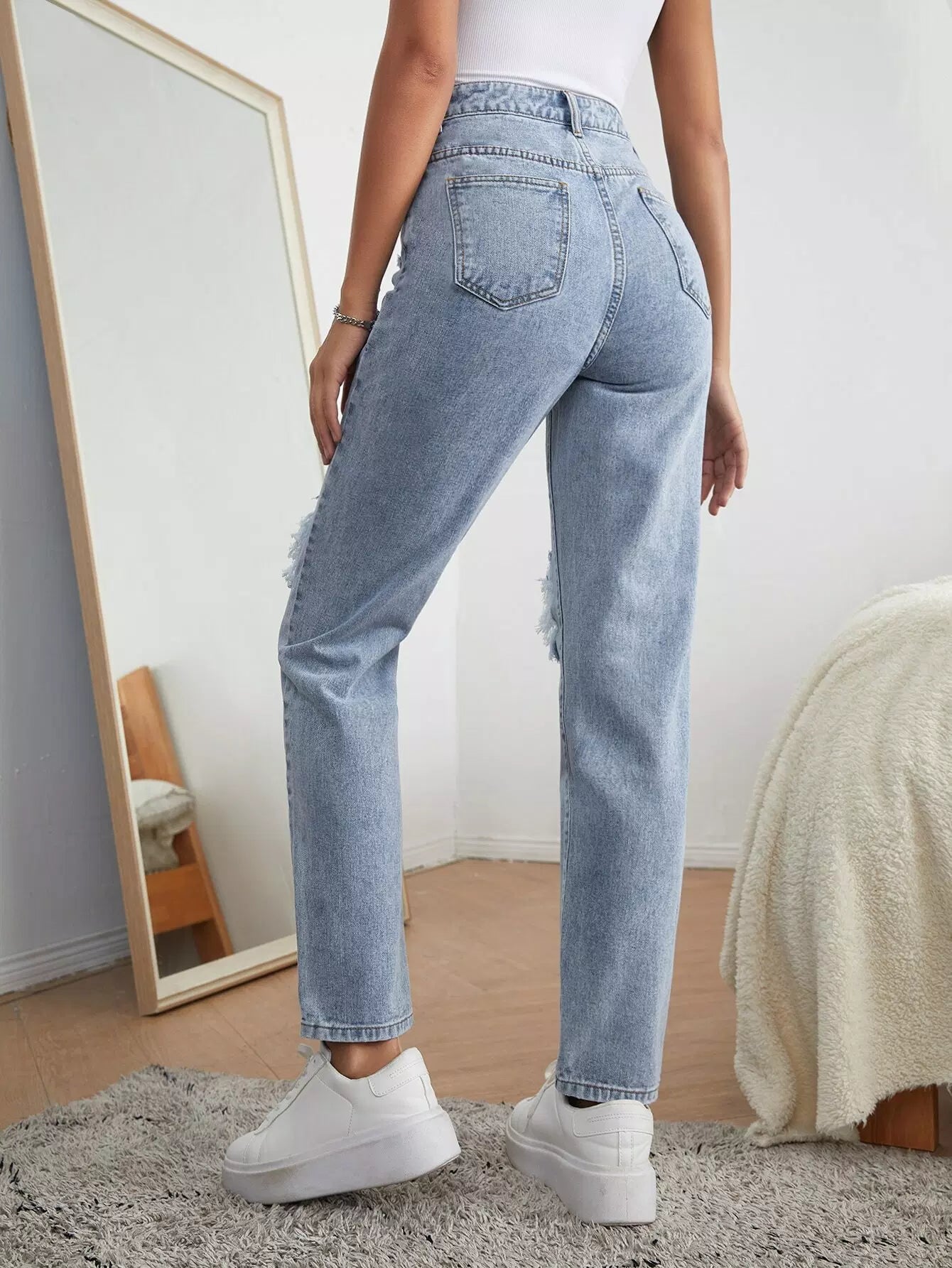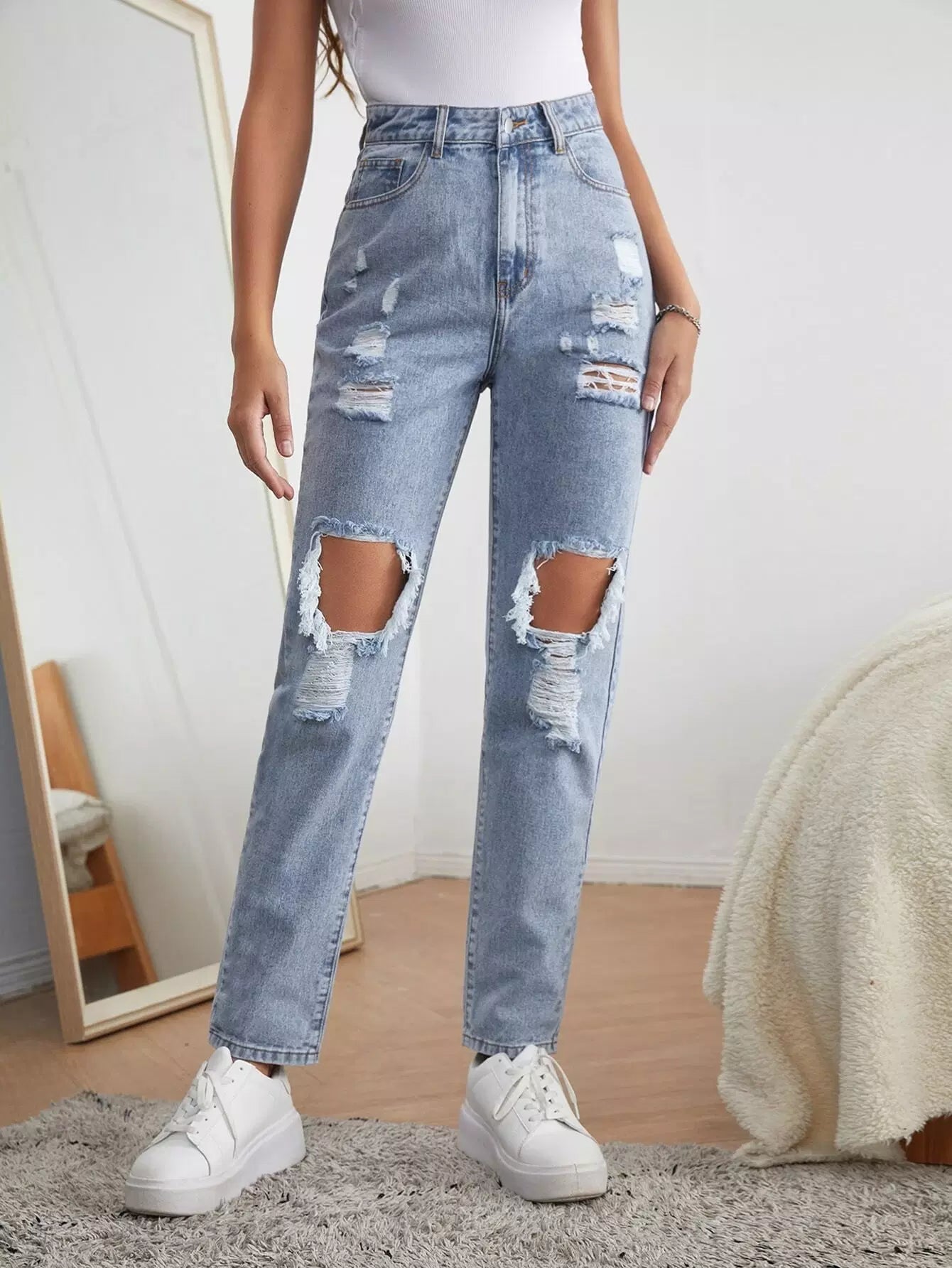 بنطلون جينز أم ممزق عالي الخصر عالي الخصر