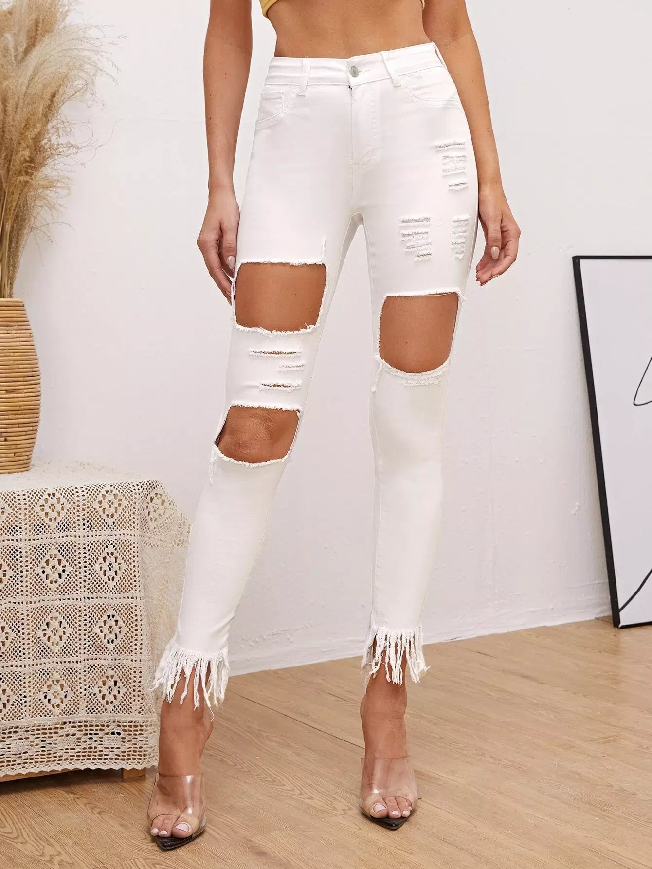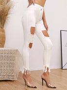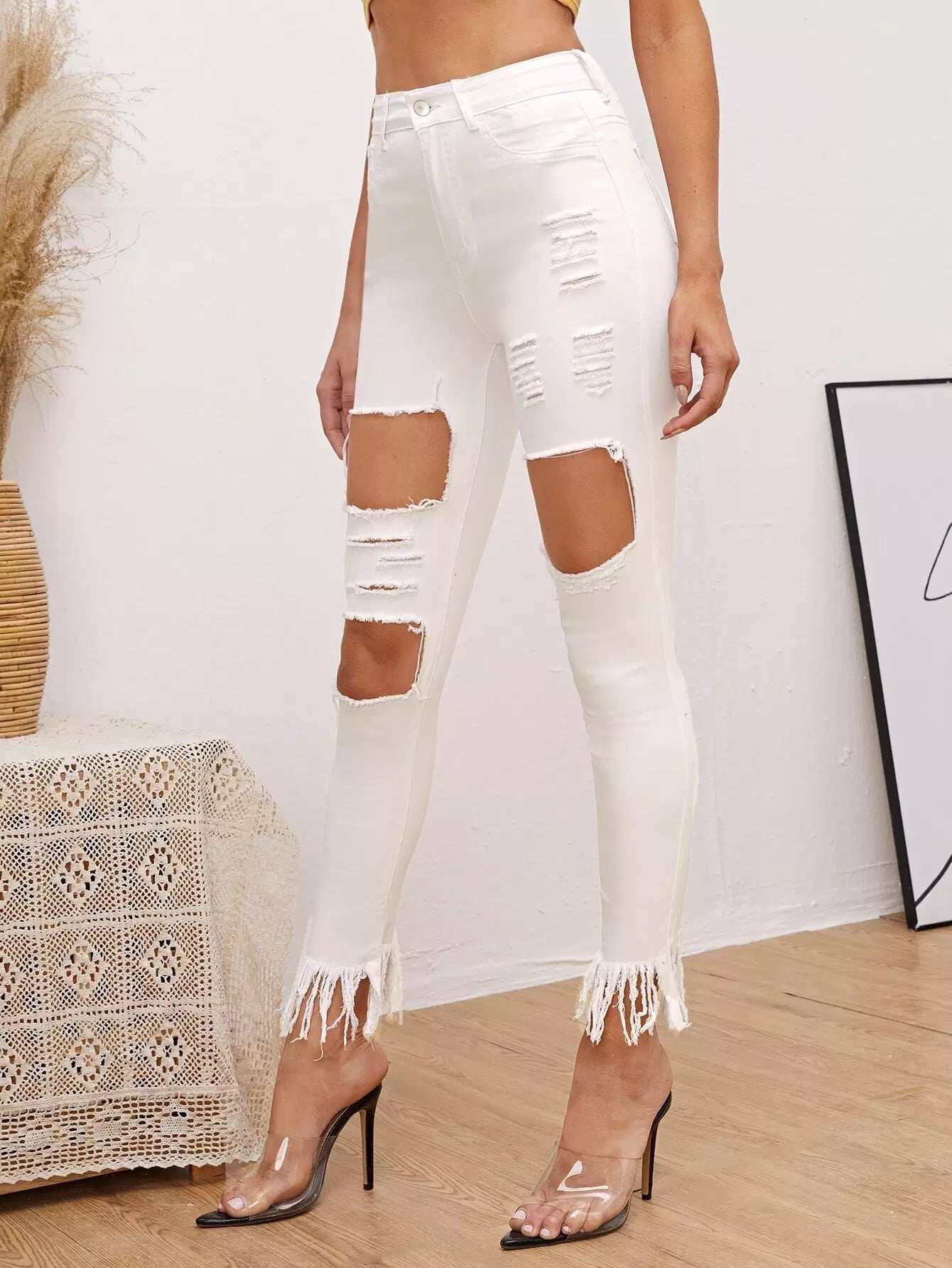 بنطلون جينز بحواف ممزق عالي الخصر بحافة خام