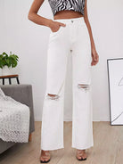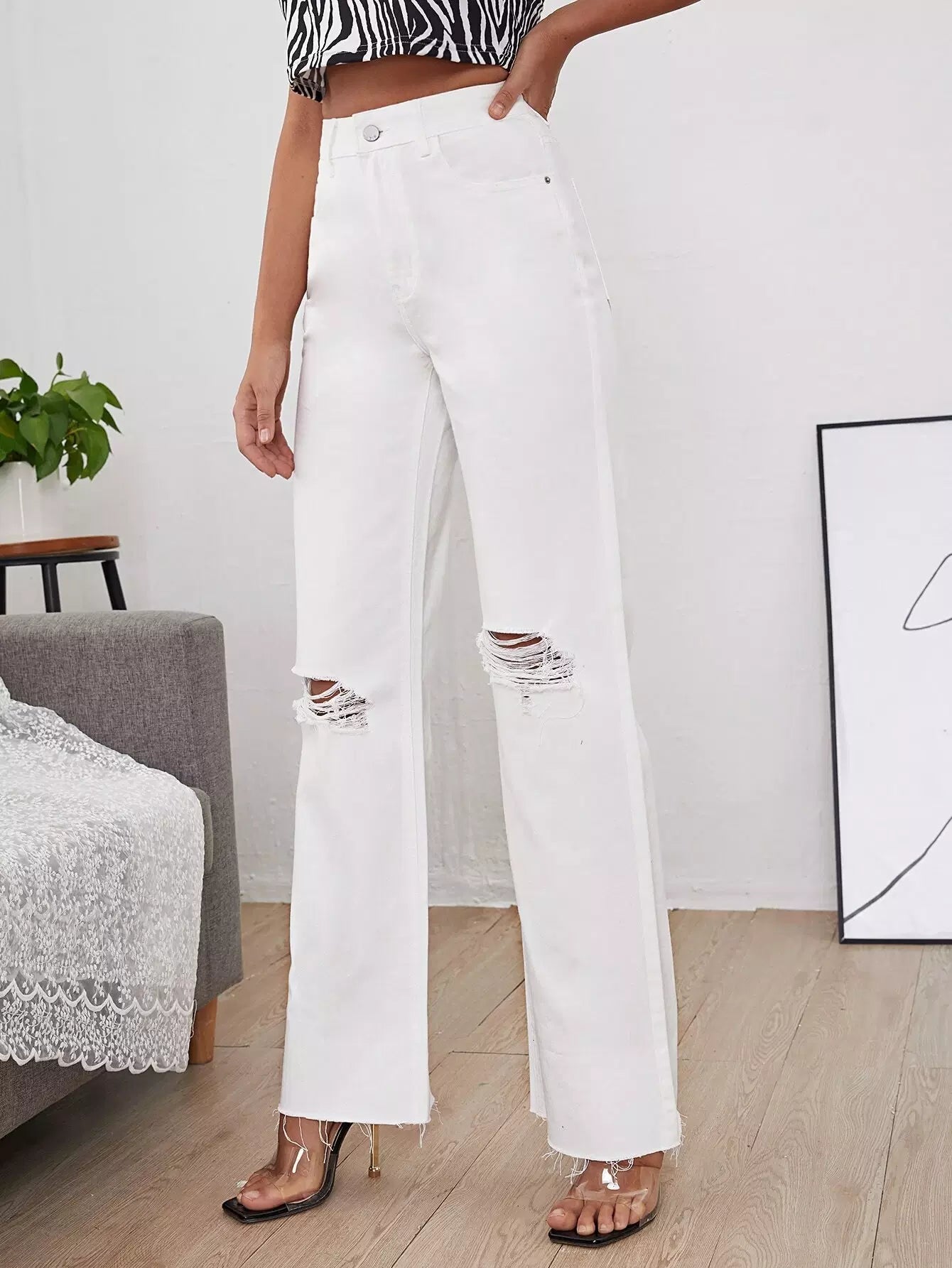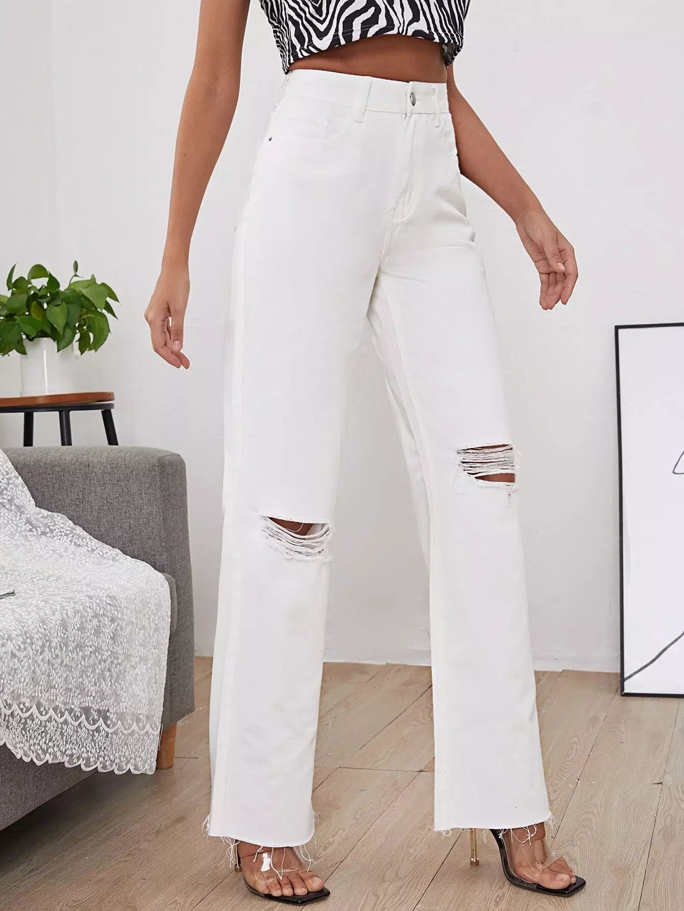 بنطلون جينز بخصر عالٍ ممزق وعريض الساقين