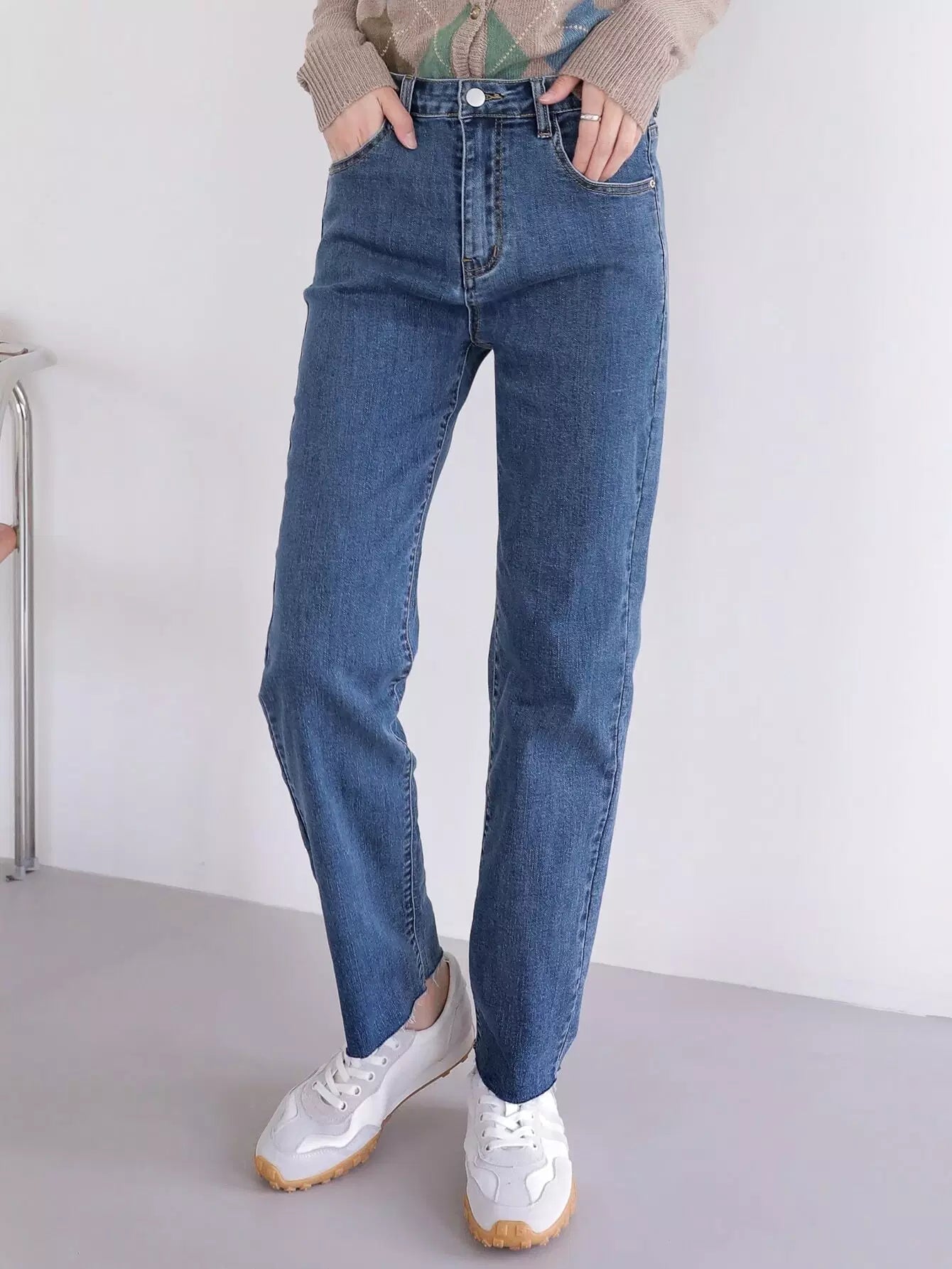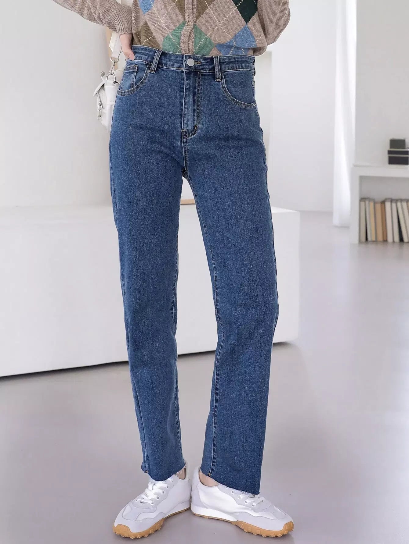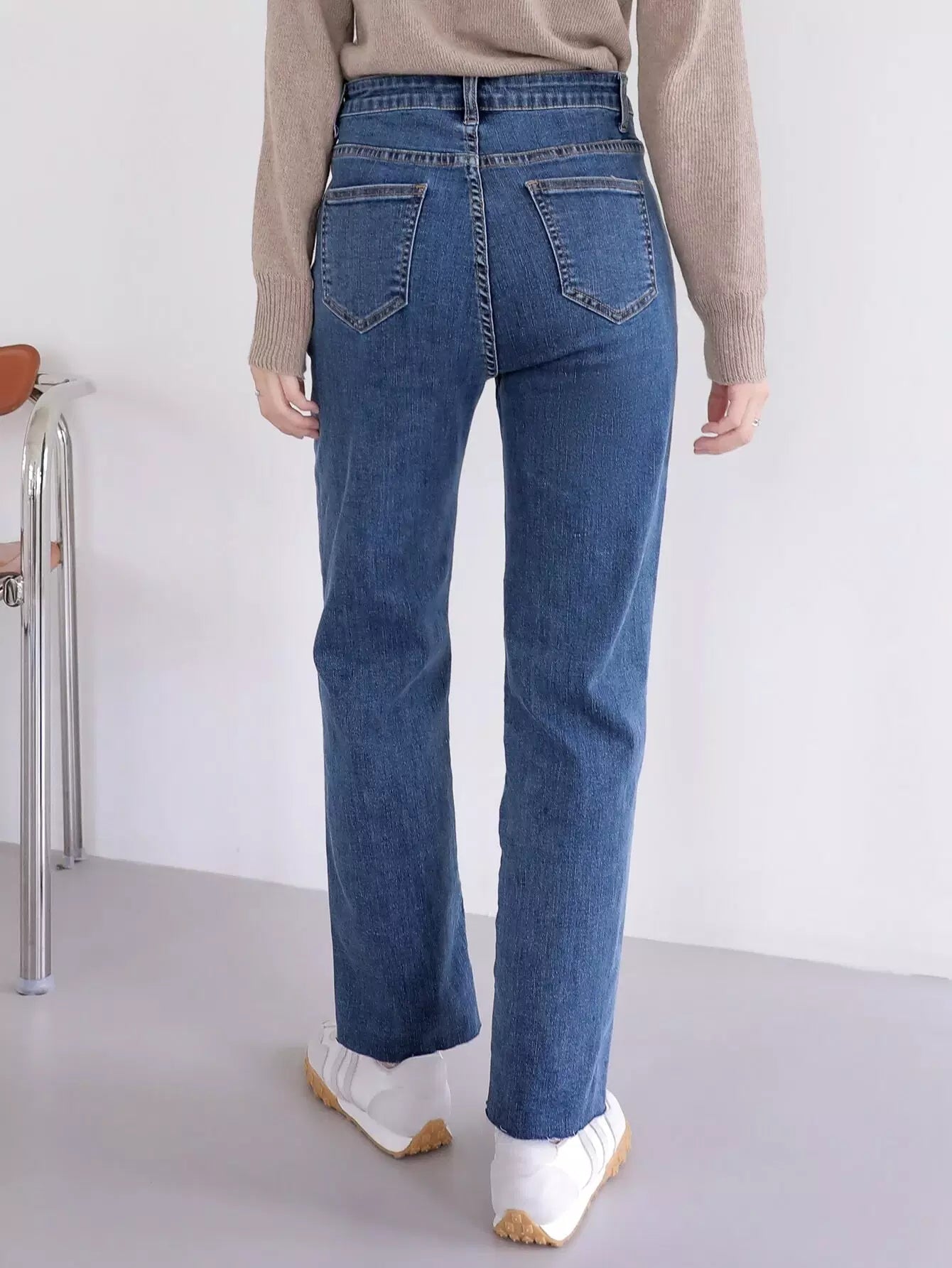 بنطلون جينز بخصر عالٍ مائل بجيب مائل بساق مستقيمة