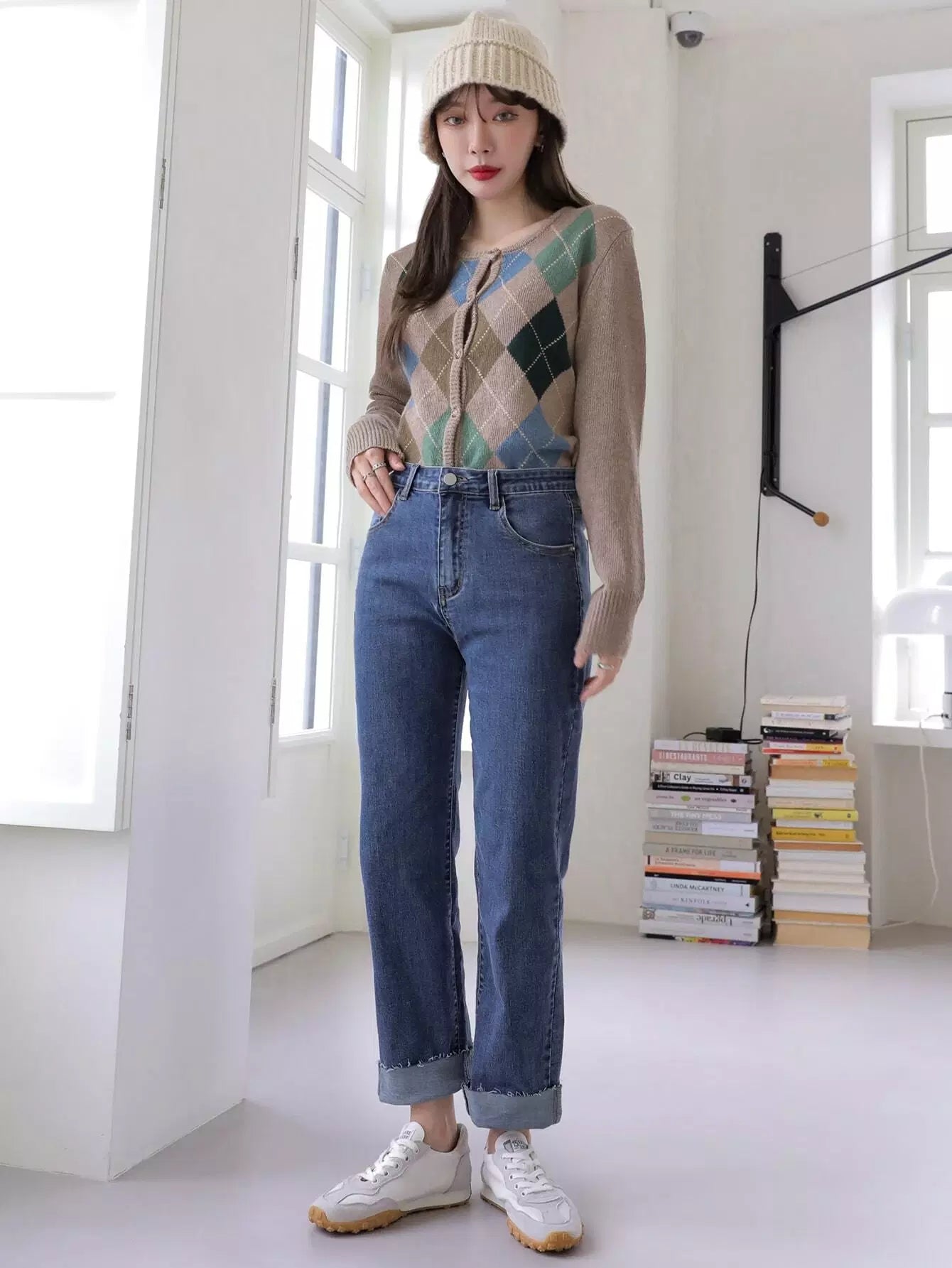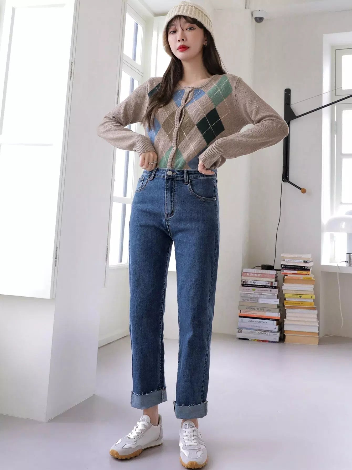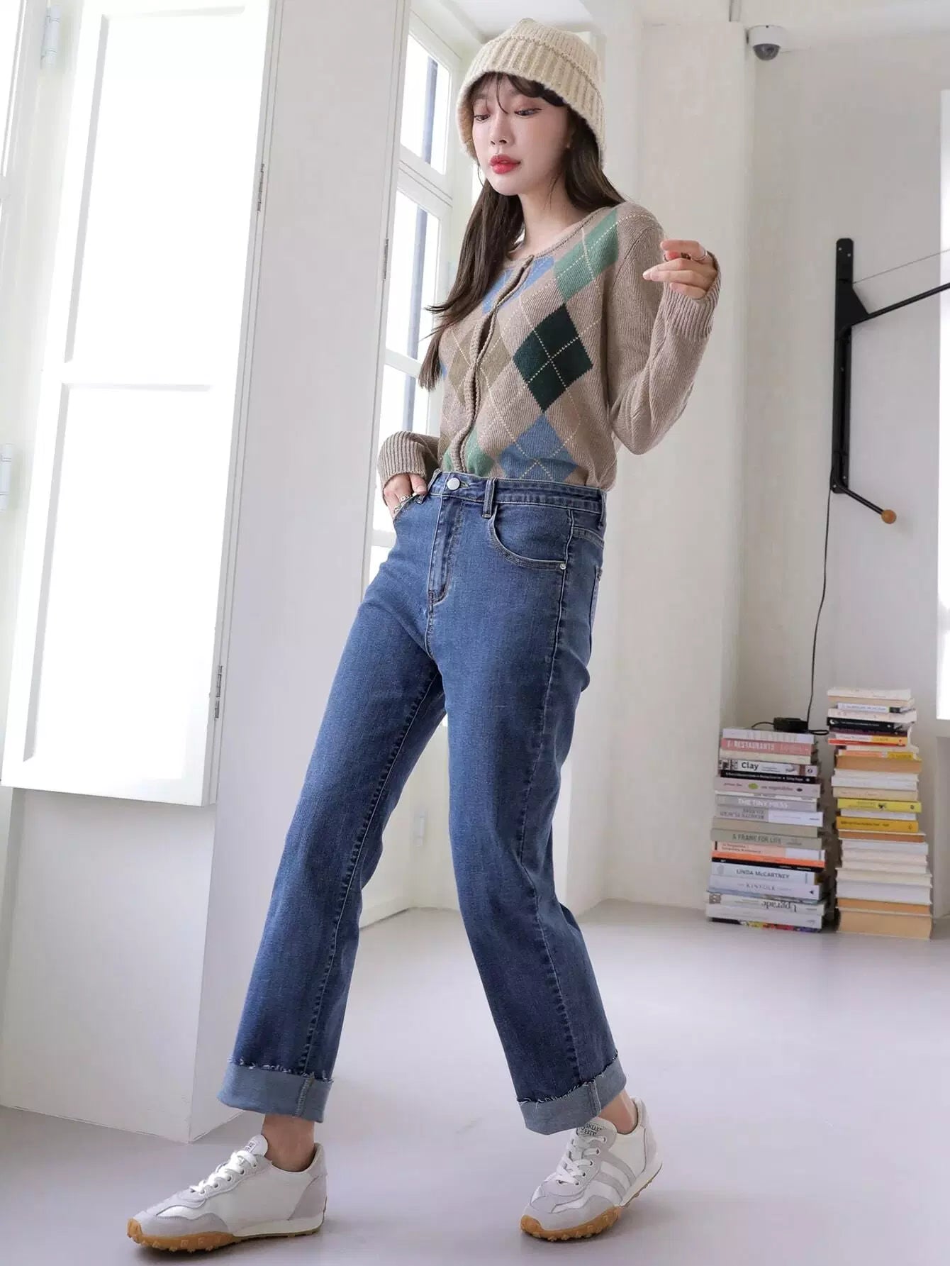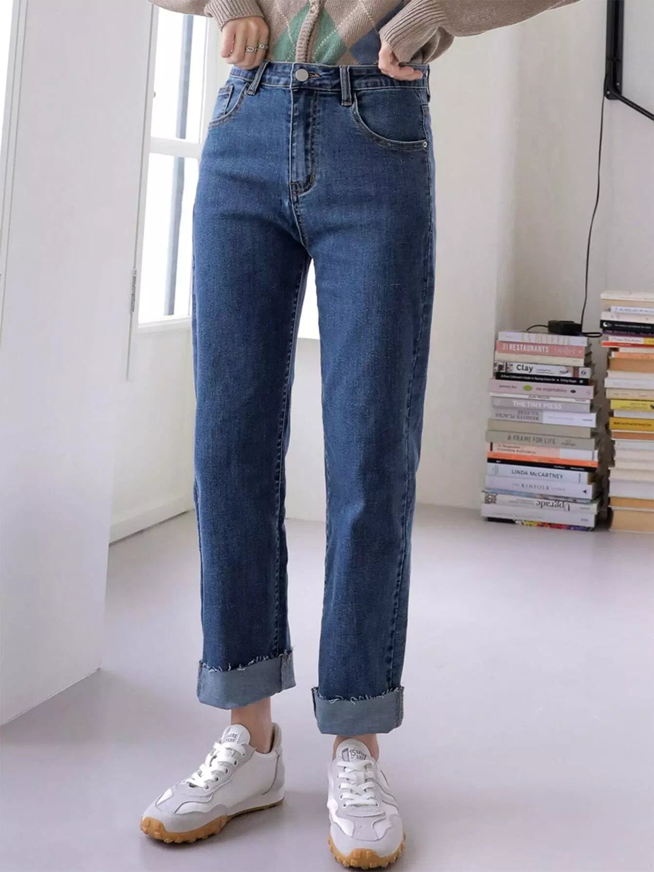 بنطلون جينز بخصر عالٍ مائل بجيب مائل بساق مستقيمة