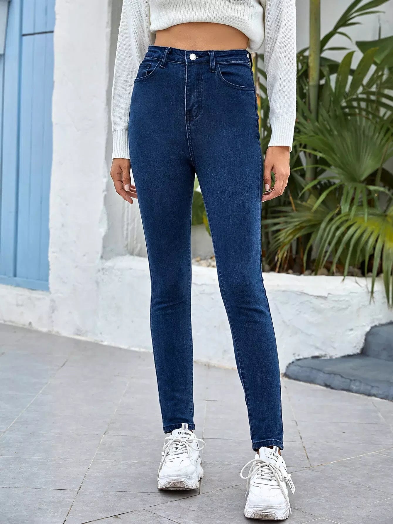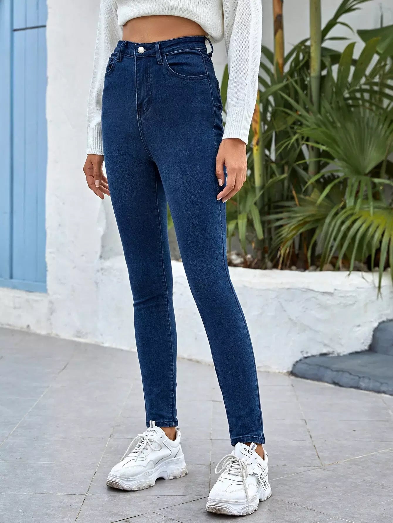 النساء - بنطال جينز ضيق سادة بخصر عالٍ