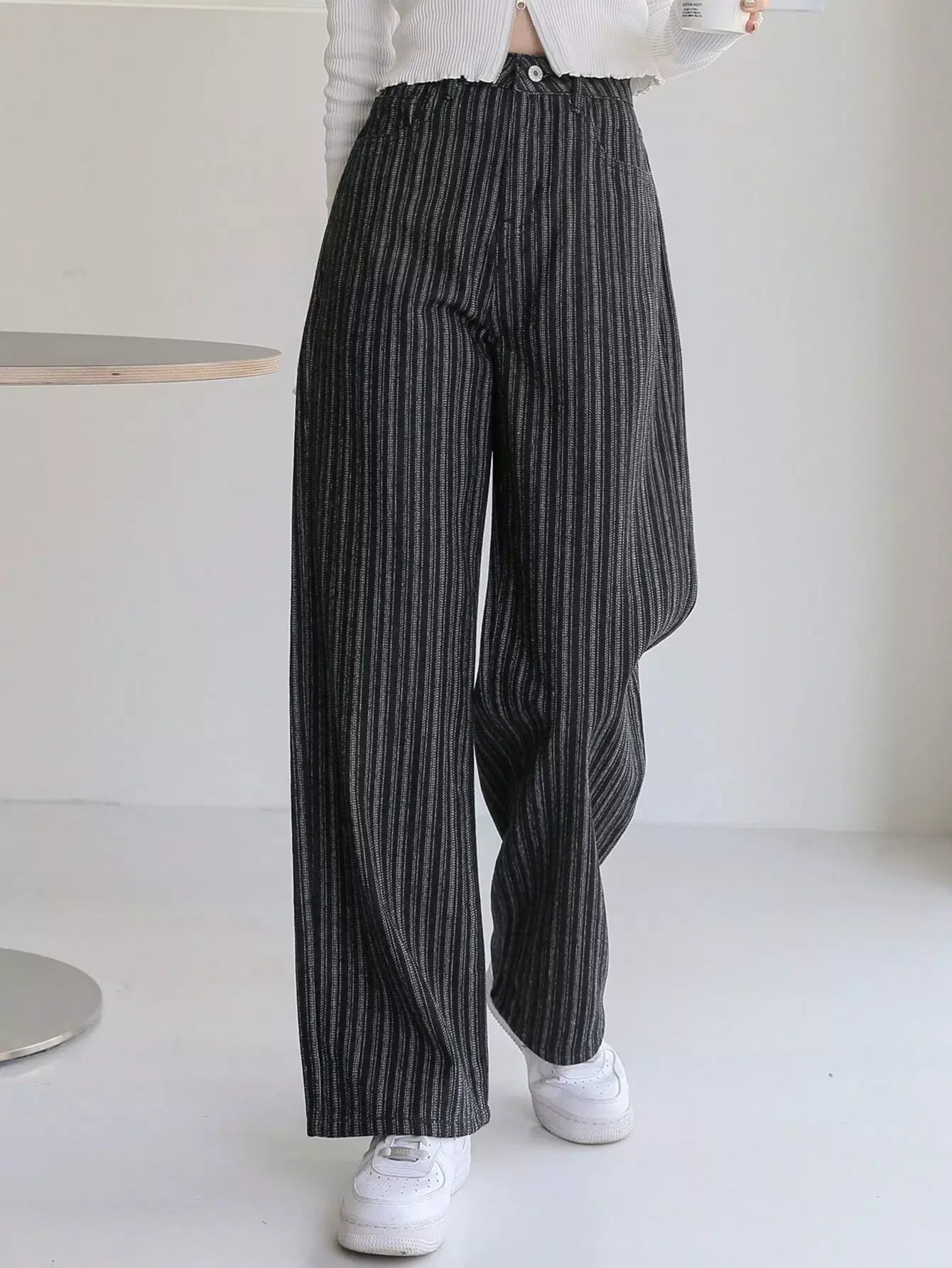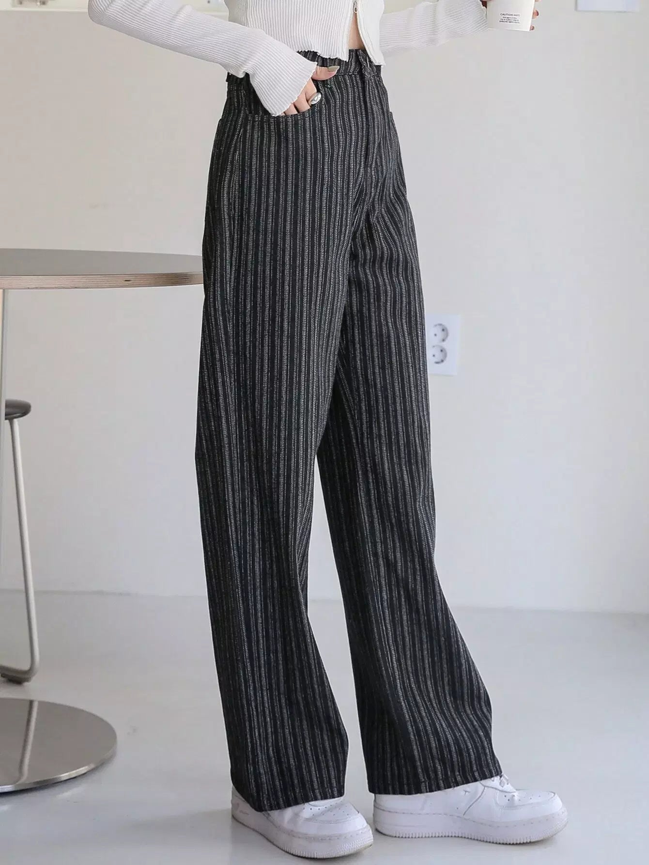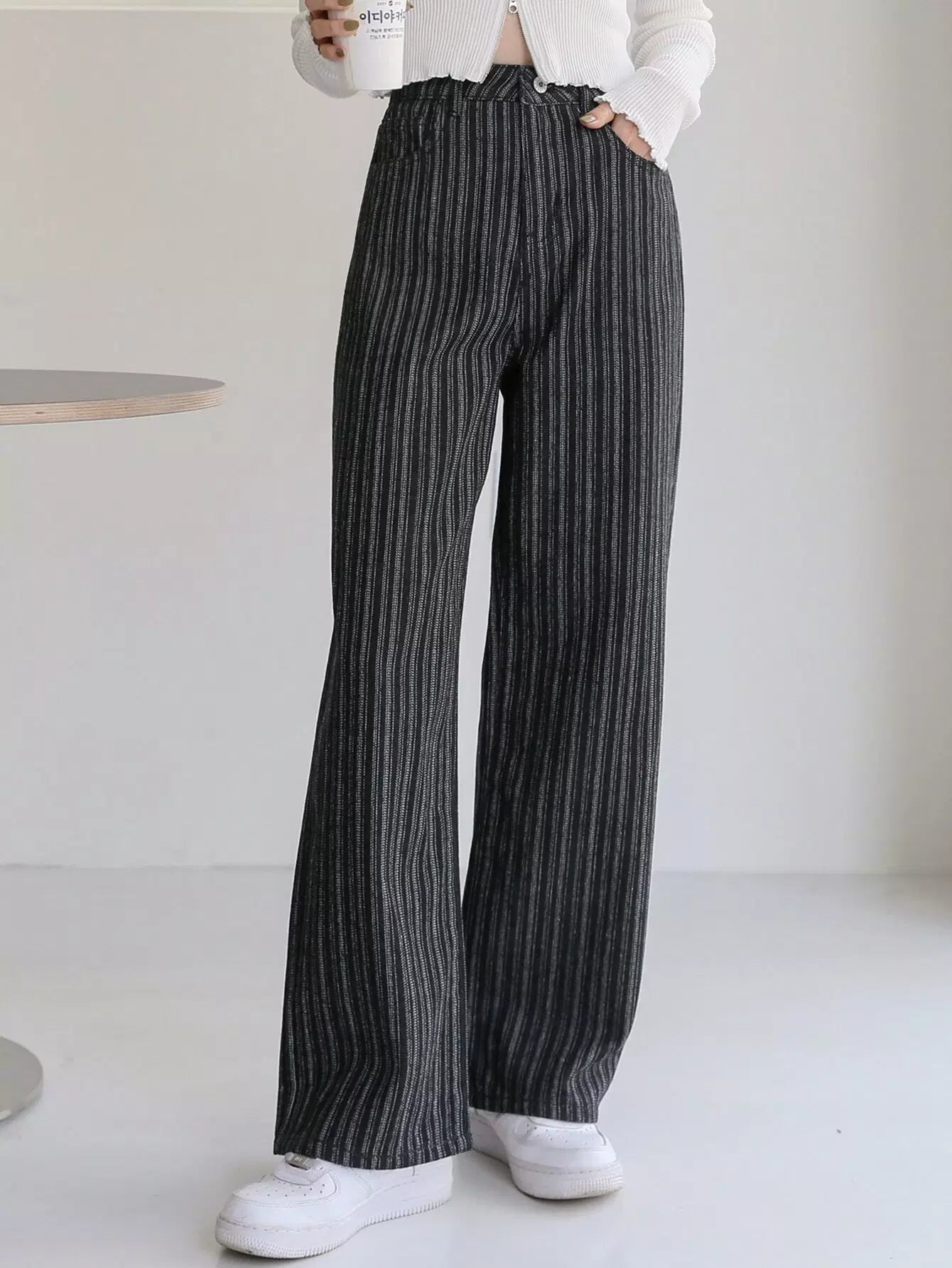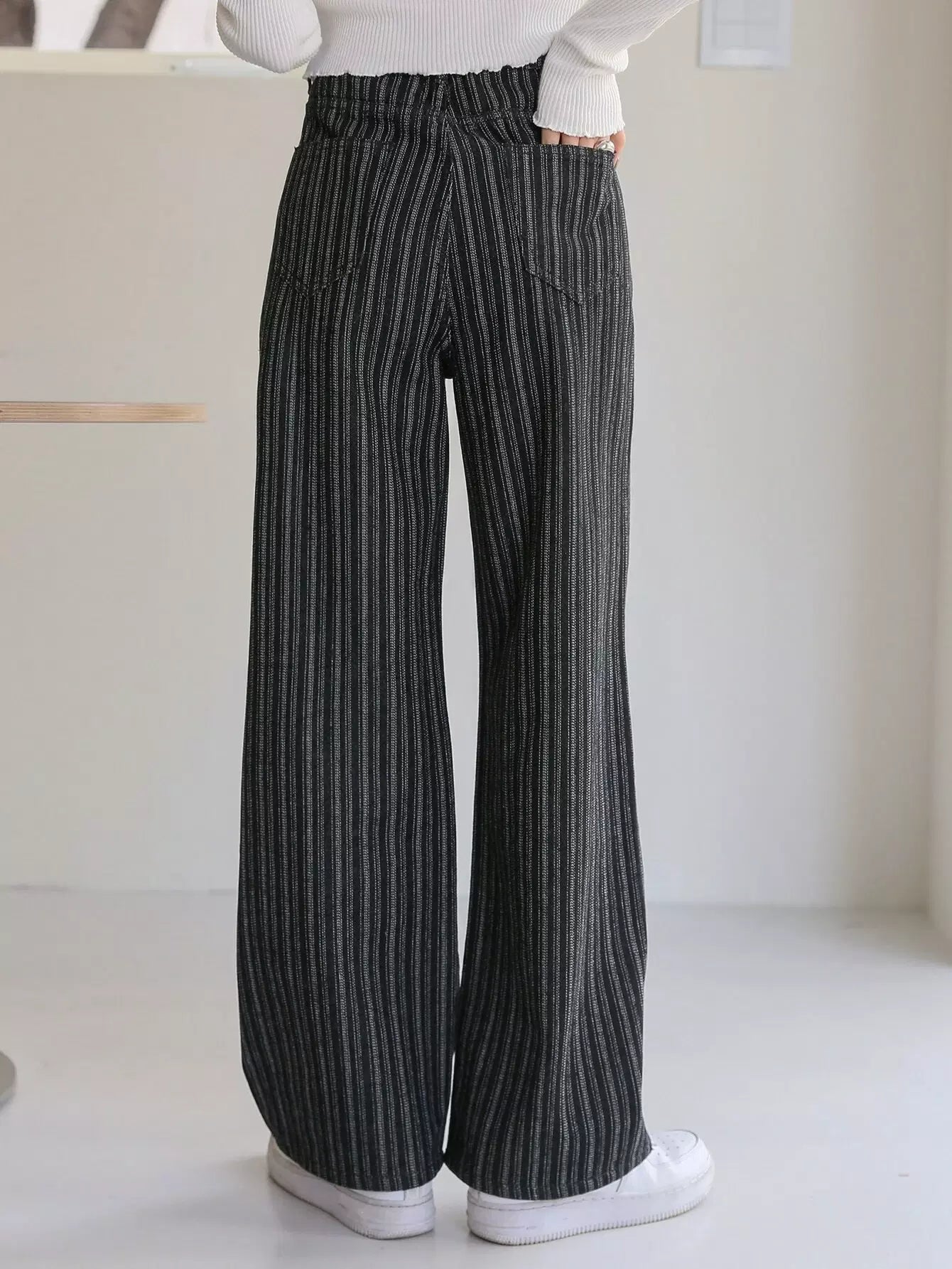 بنطال جينز مخطط بخصر مرتفع وساق واسعة