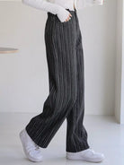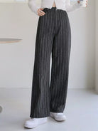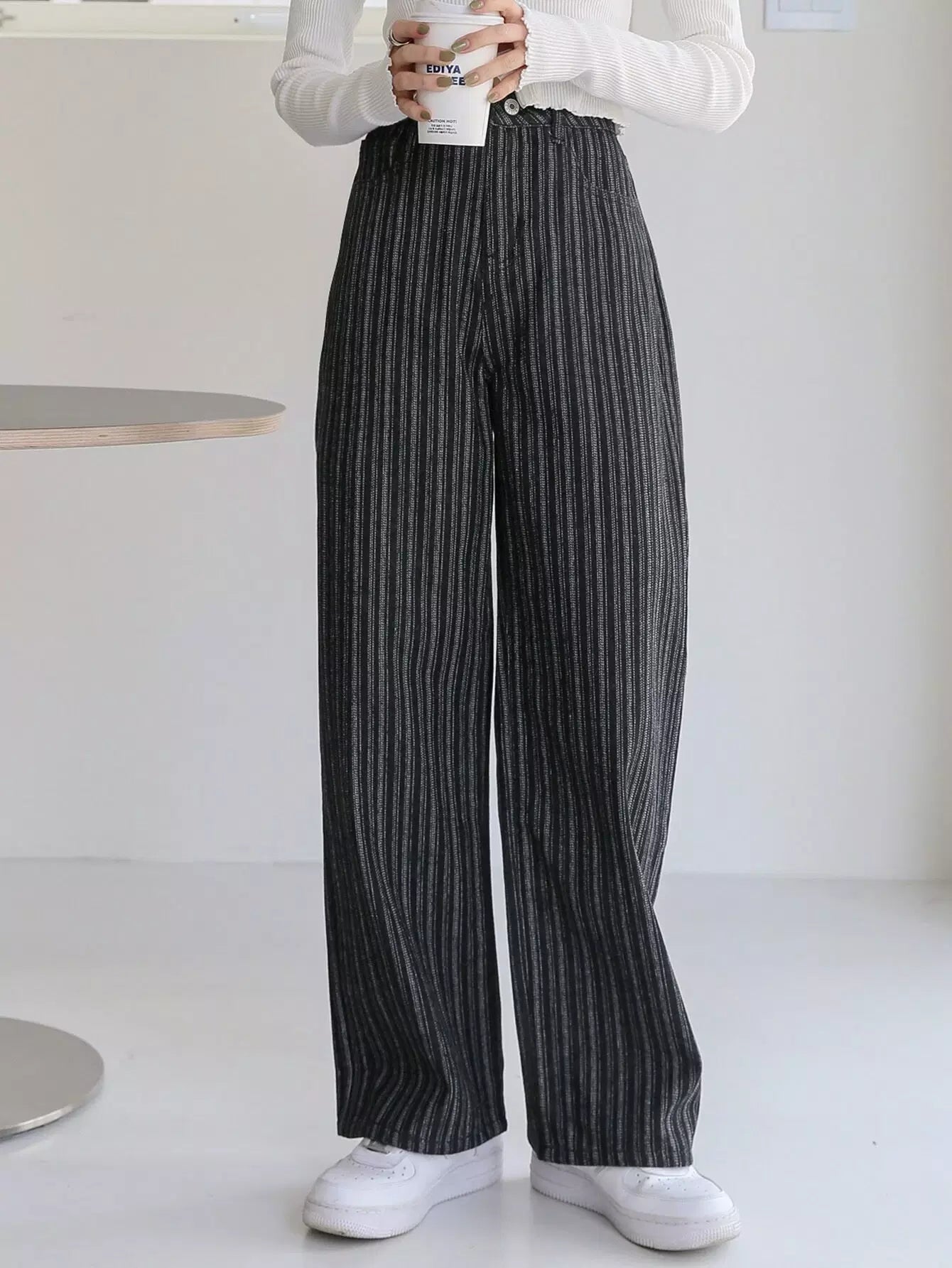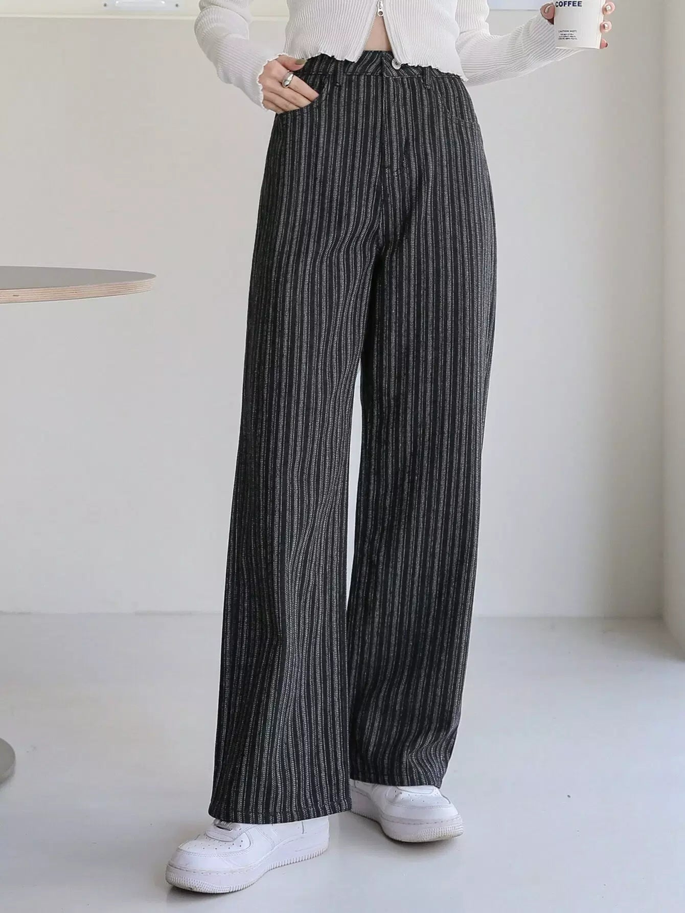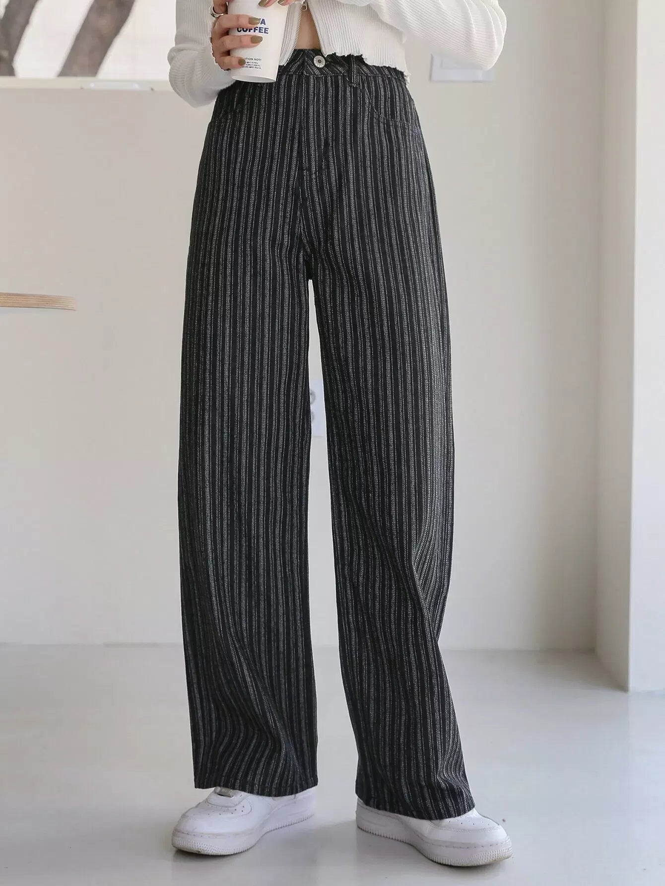 بنطال جينز مخطط بخصر مرتفع وساق واسعة