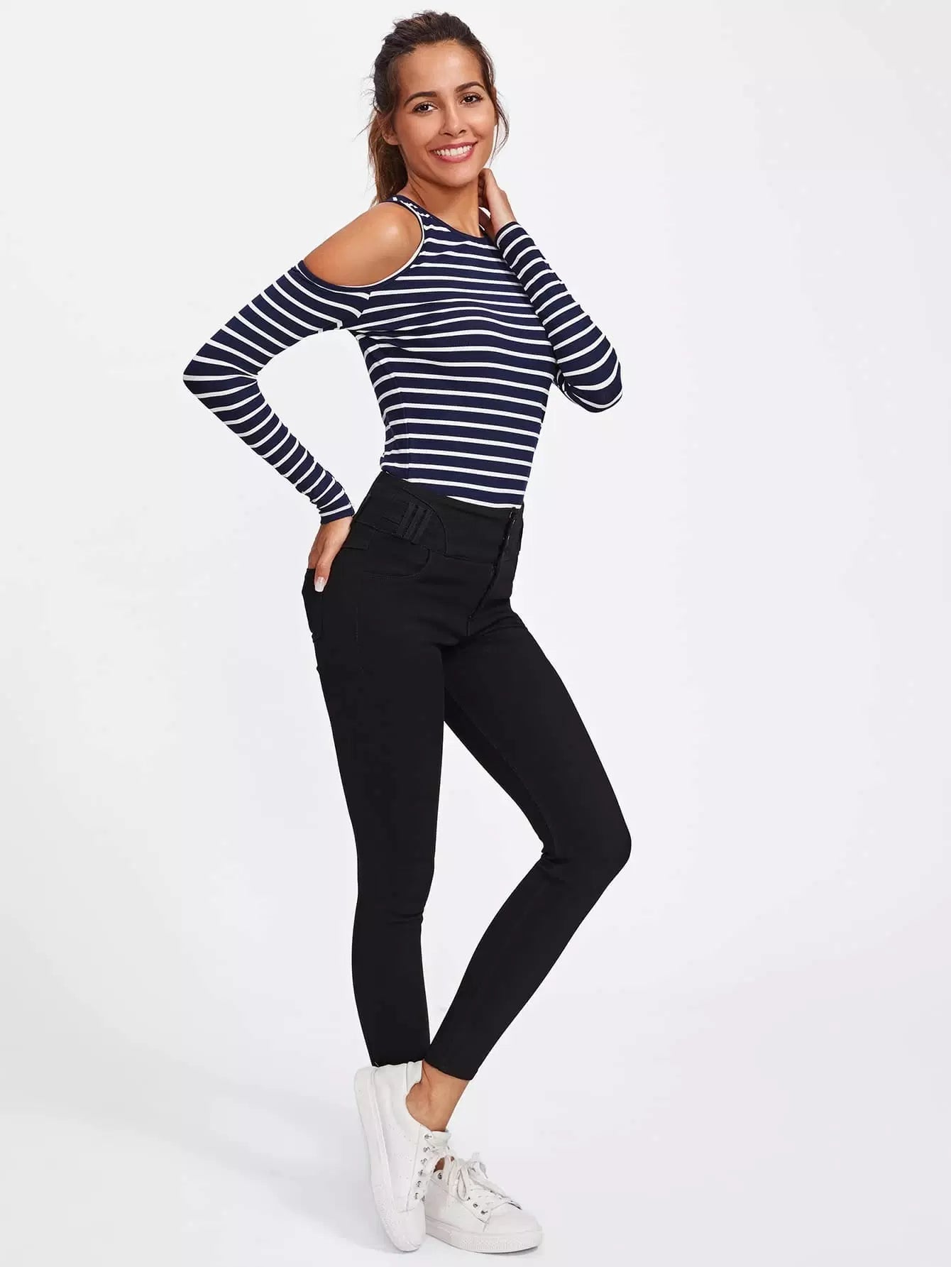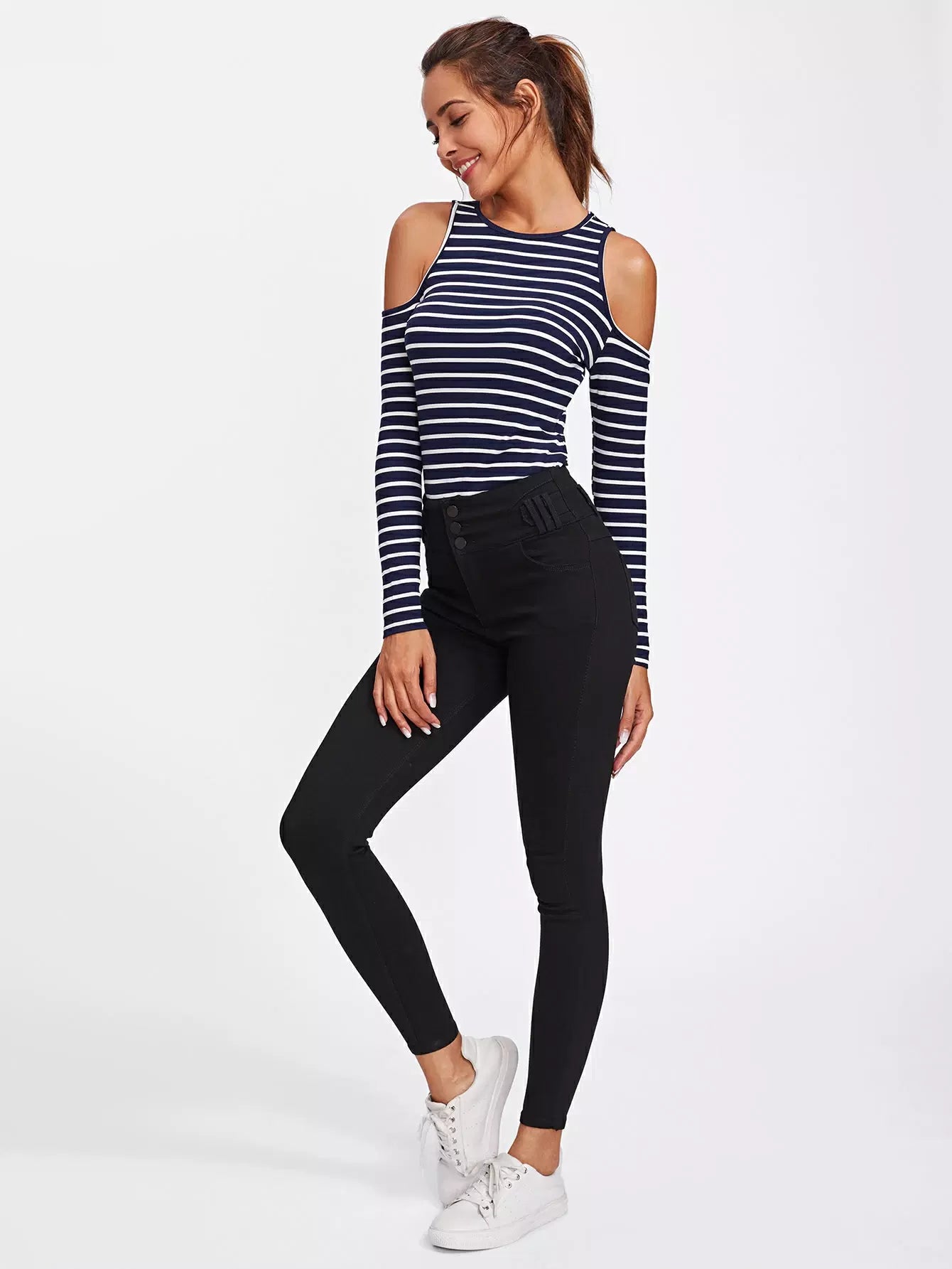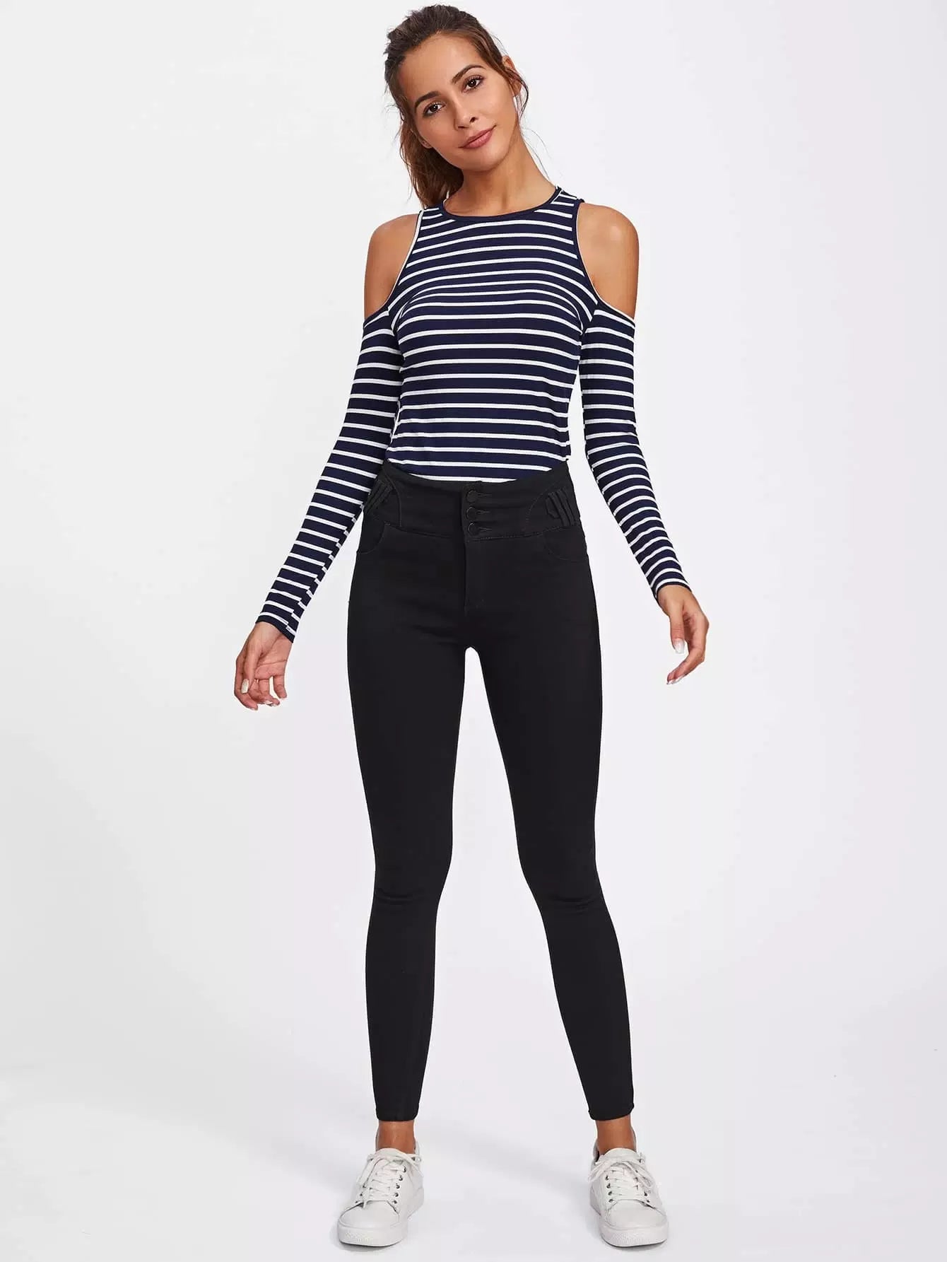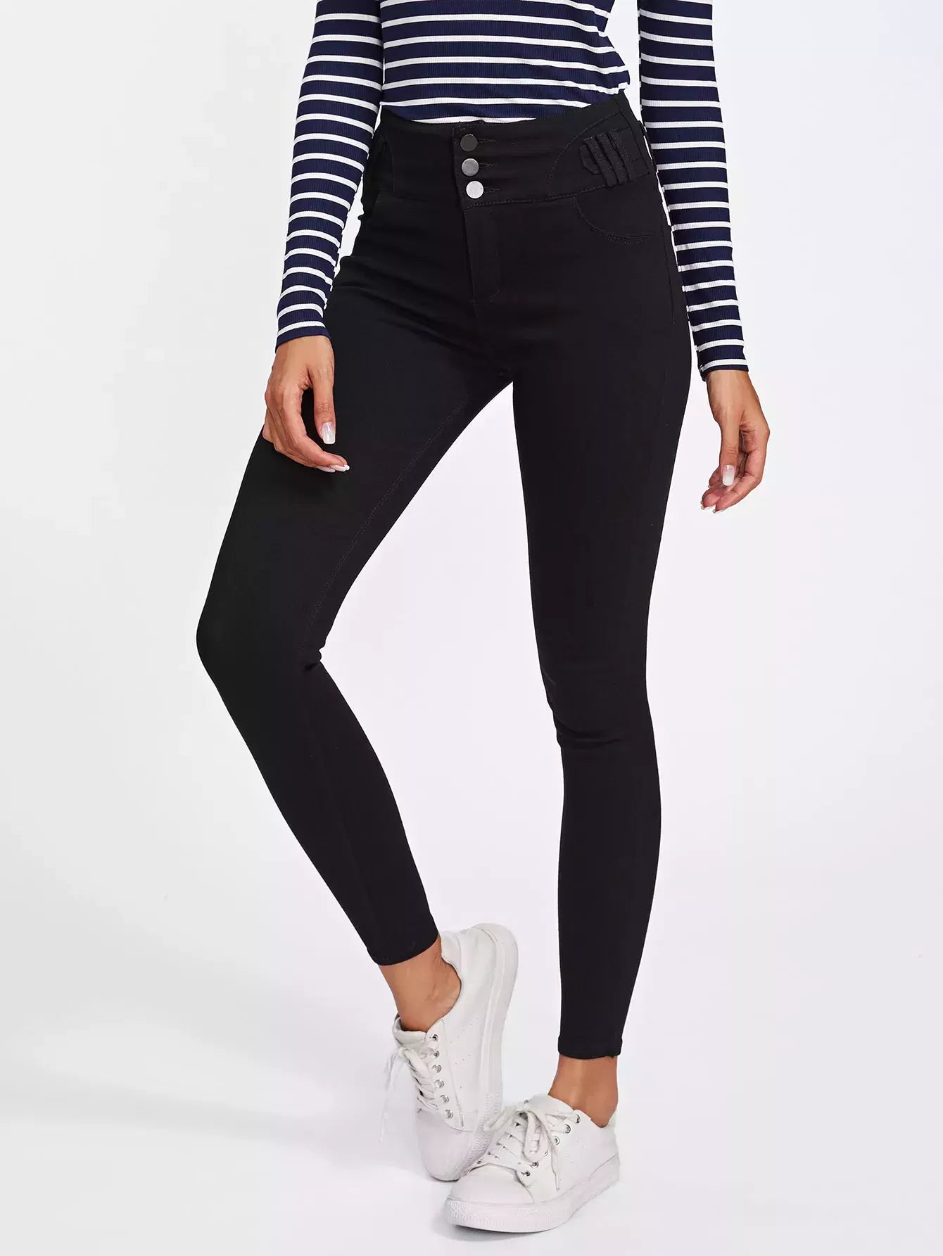 بنطال جينز بخصر عالٍ وثلاثة أزرار مطاطي قابل للتمدد