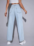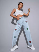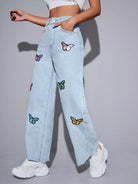 بنطلون جينز واسع الساقين مطرز بتطريز فراشة عالية الخصر