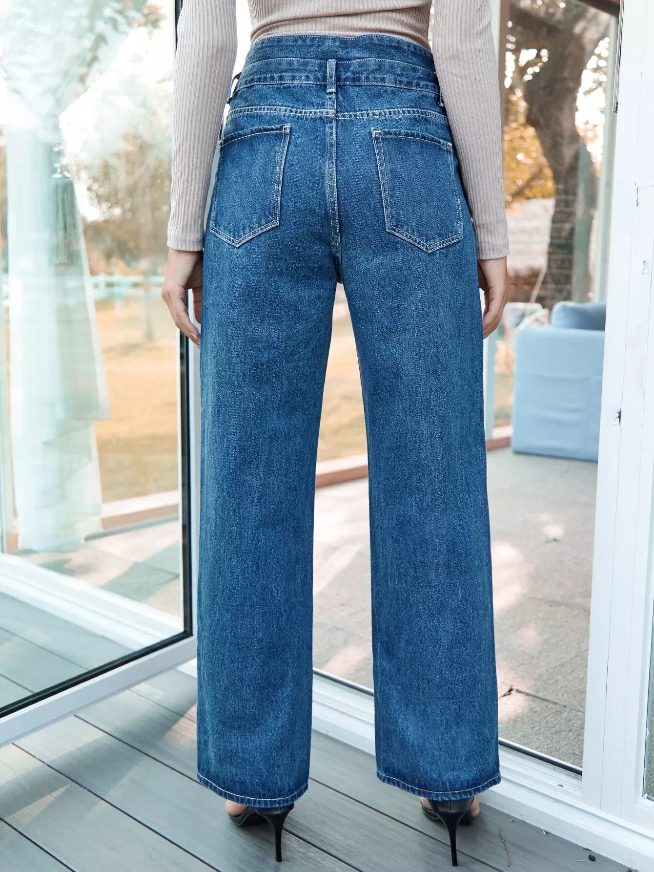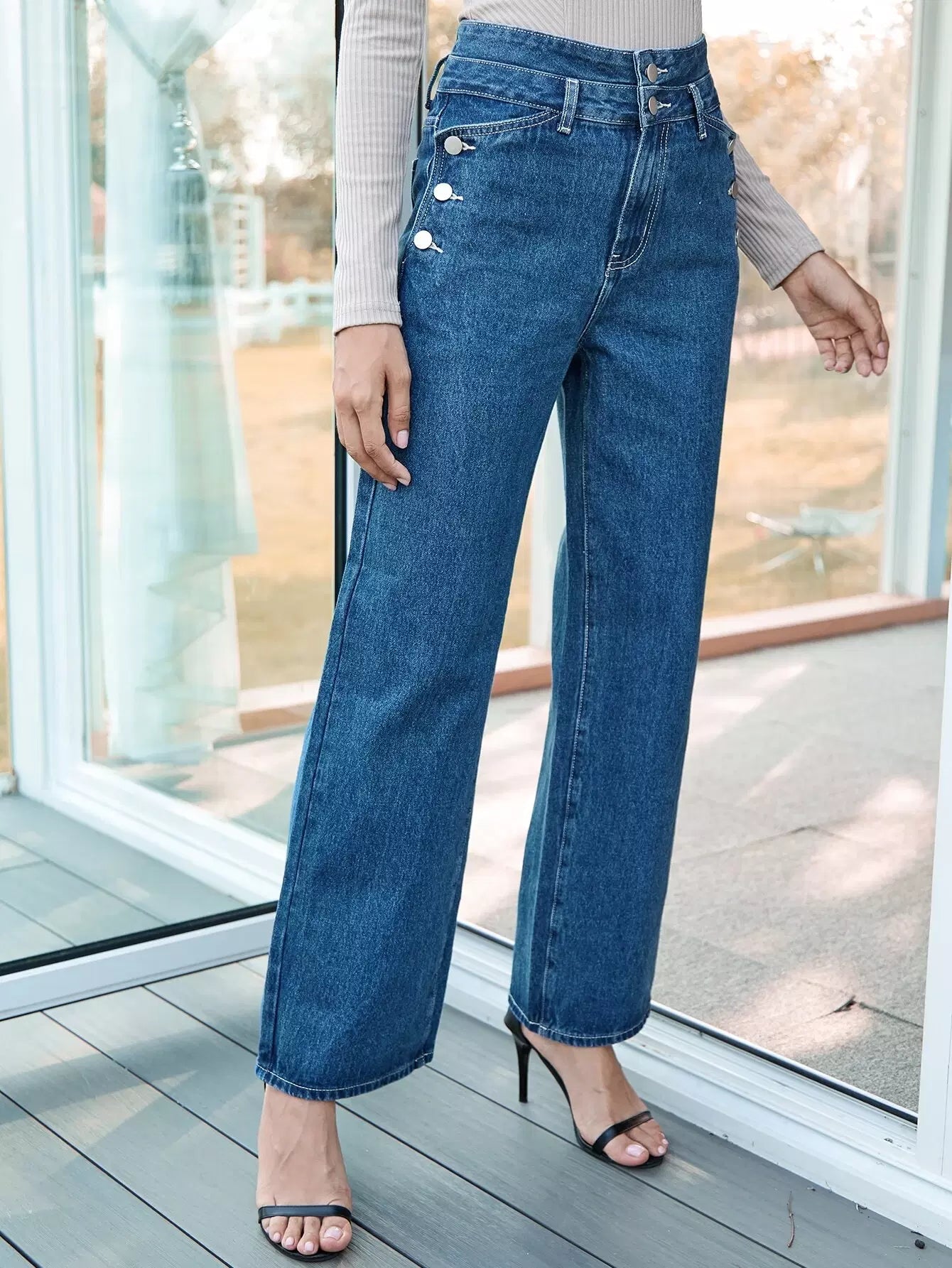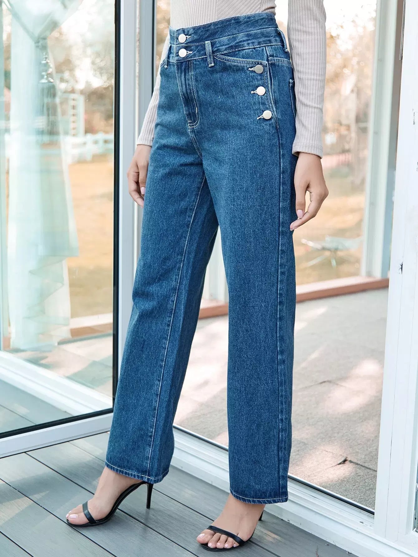 بنطال جينز بخصر عالٍ بأزرار أمامية عريضة الساقين