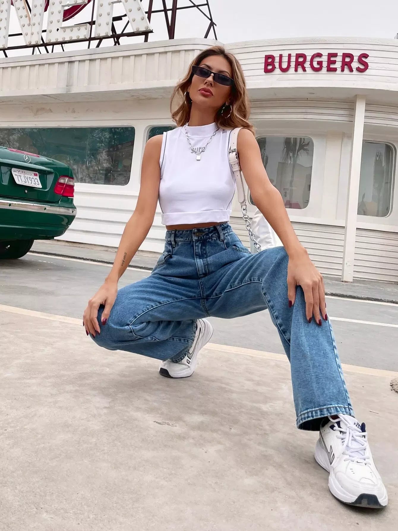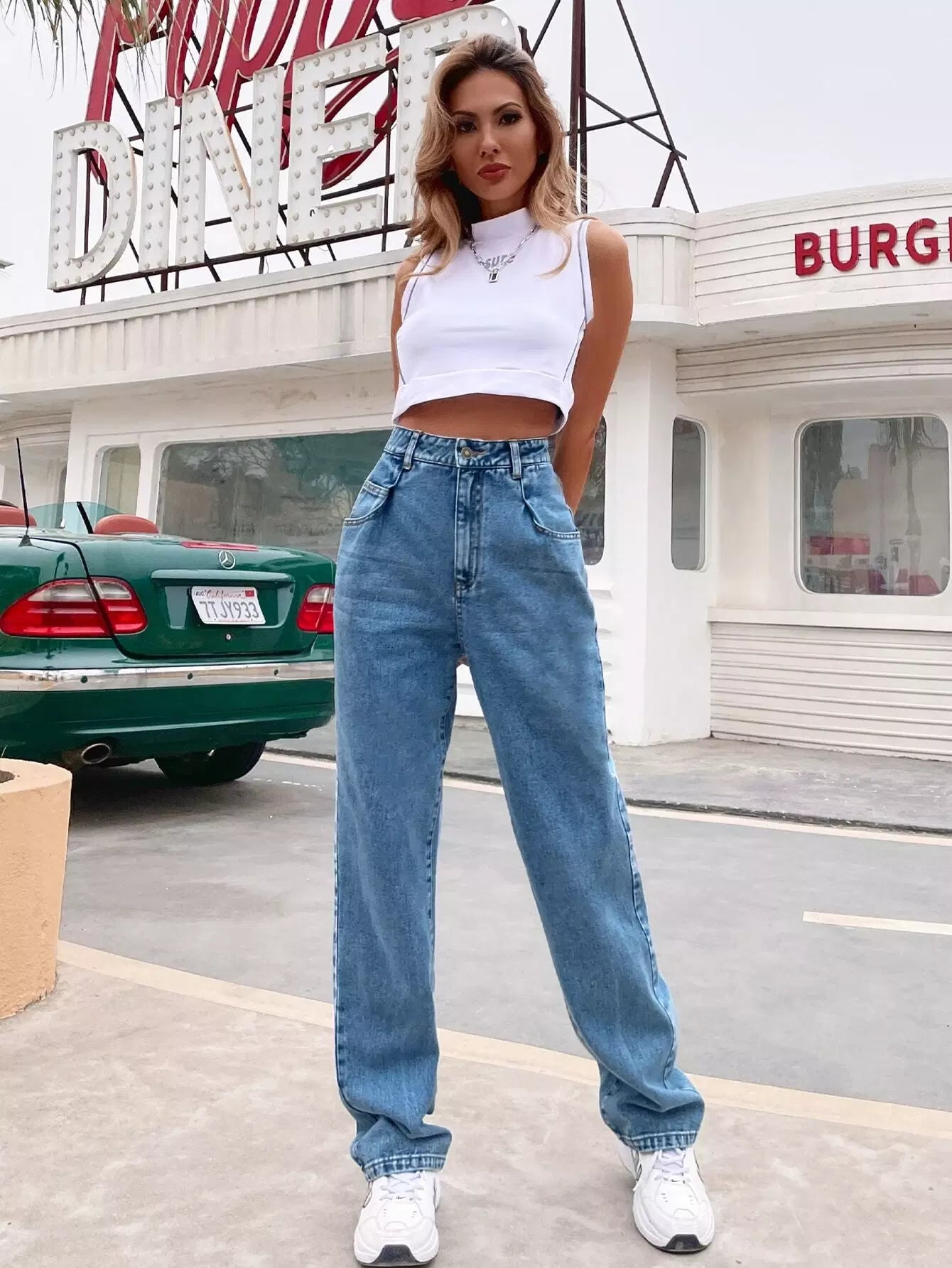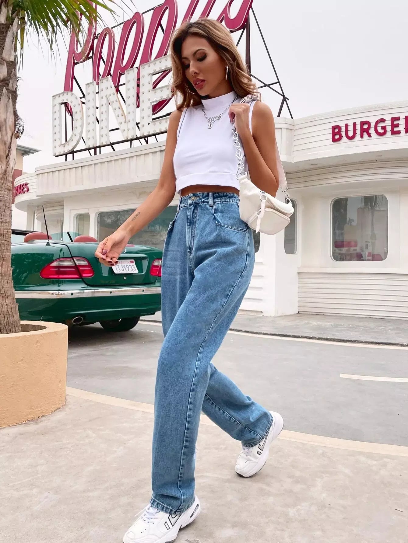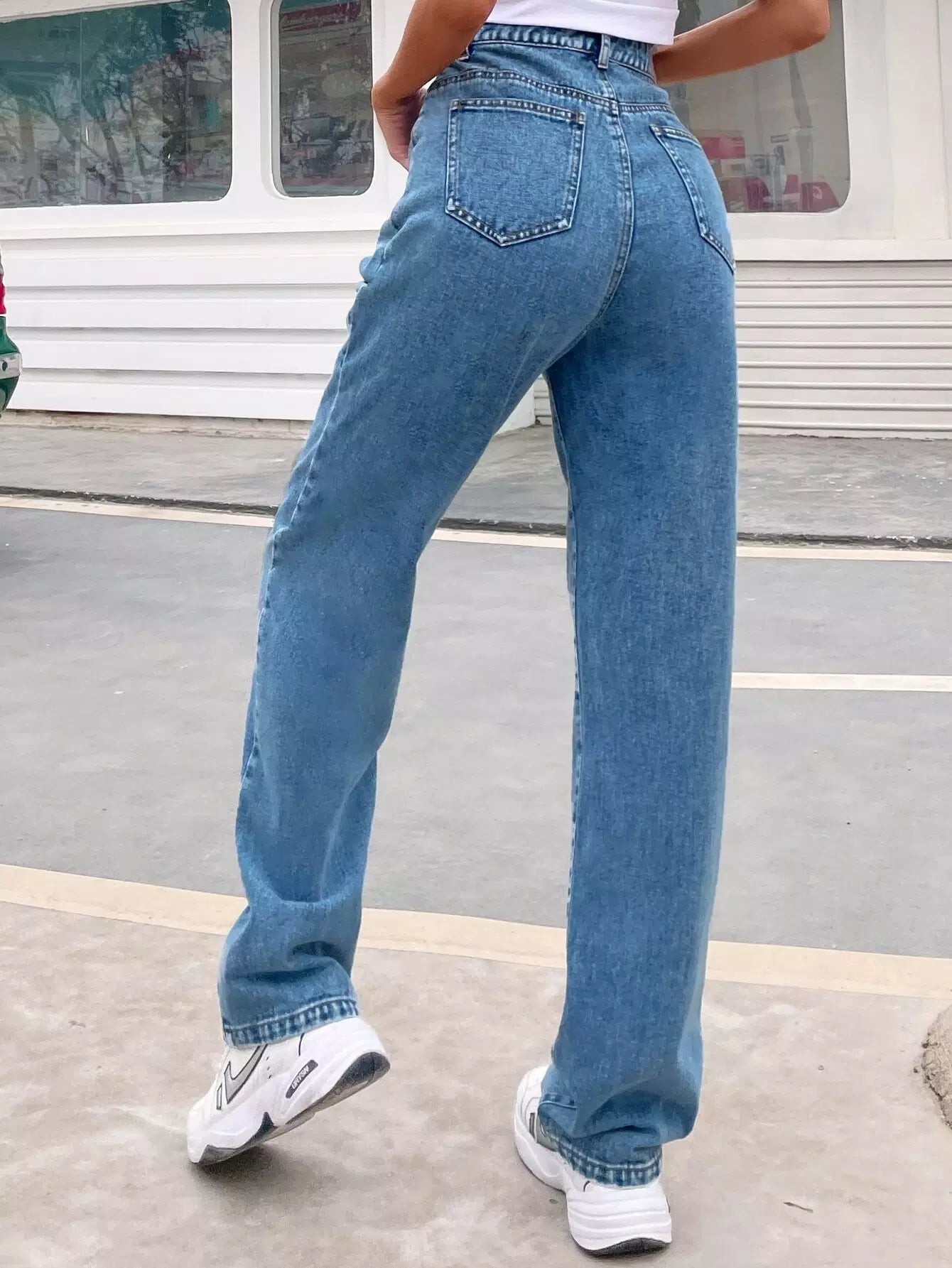بنطلون جينز بخصر عالٍ مغسول بالثلج ومغسول بالثلج