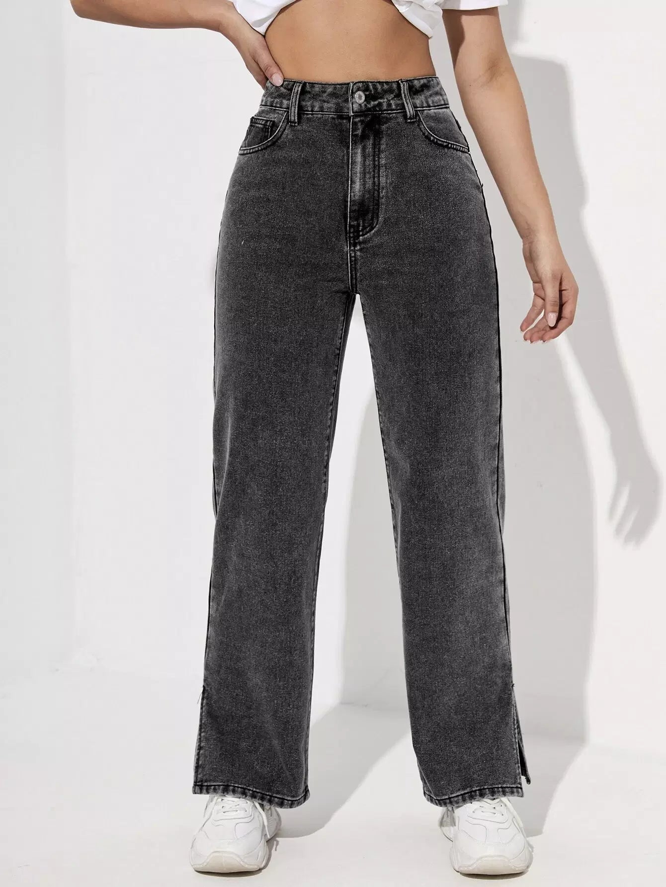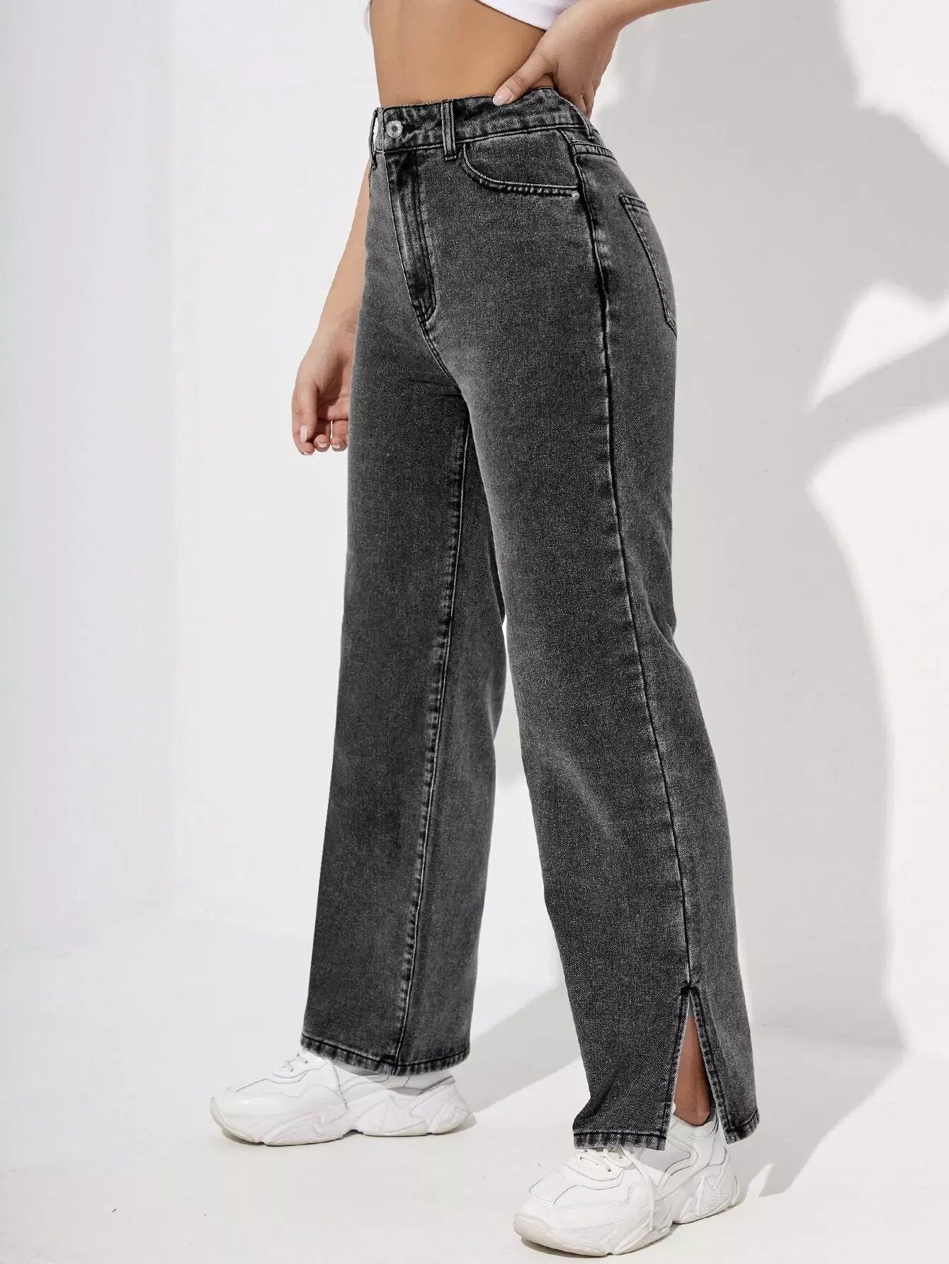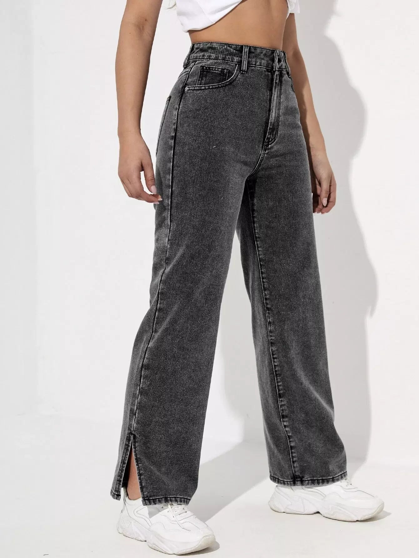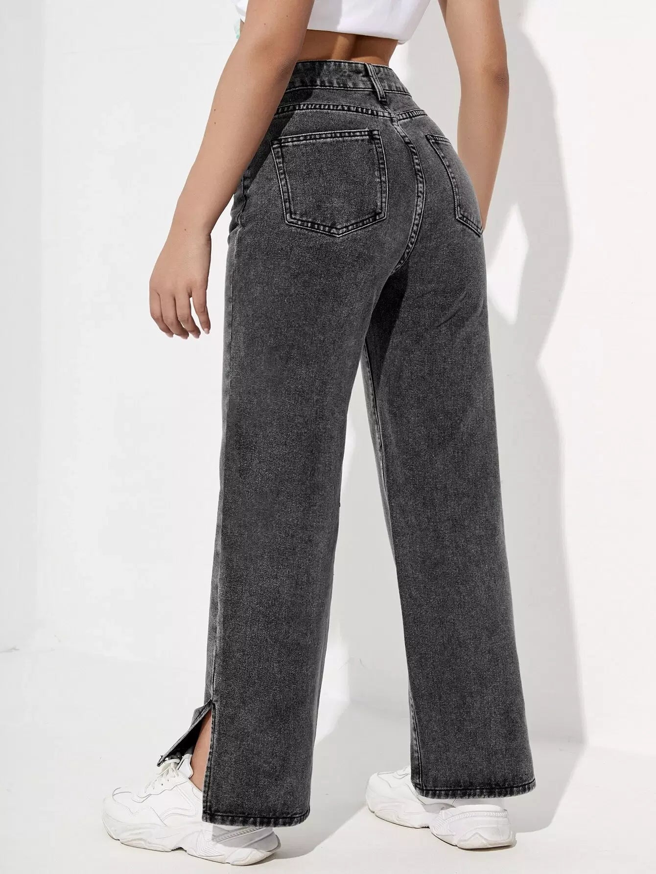 بنطلون جينز عالي الخصر مشقوق الحاشية مستقيم الساقين