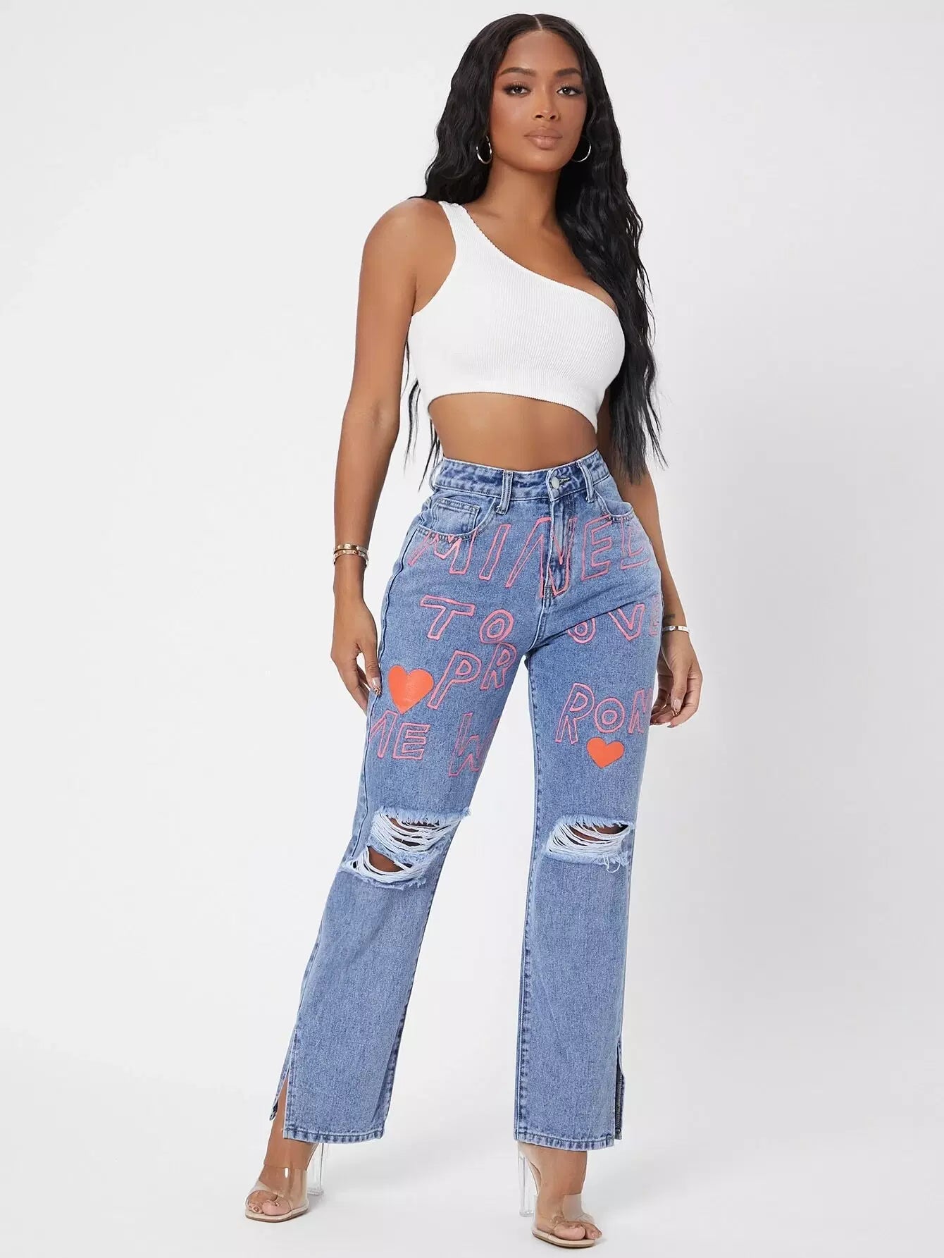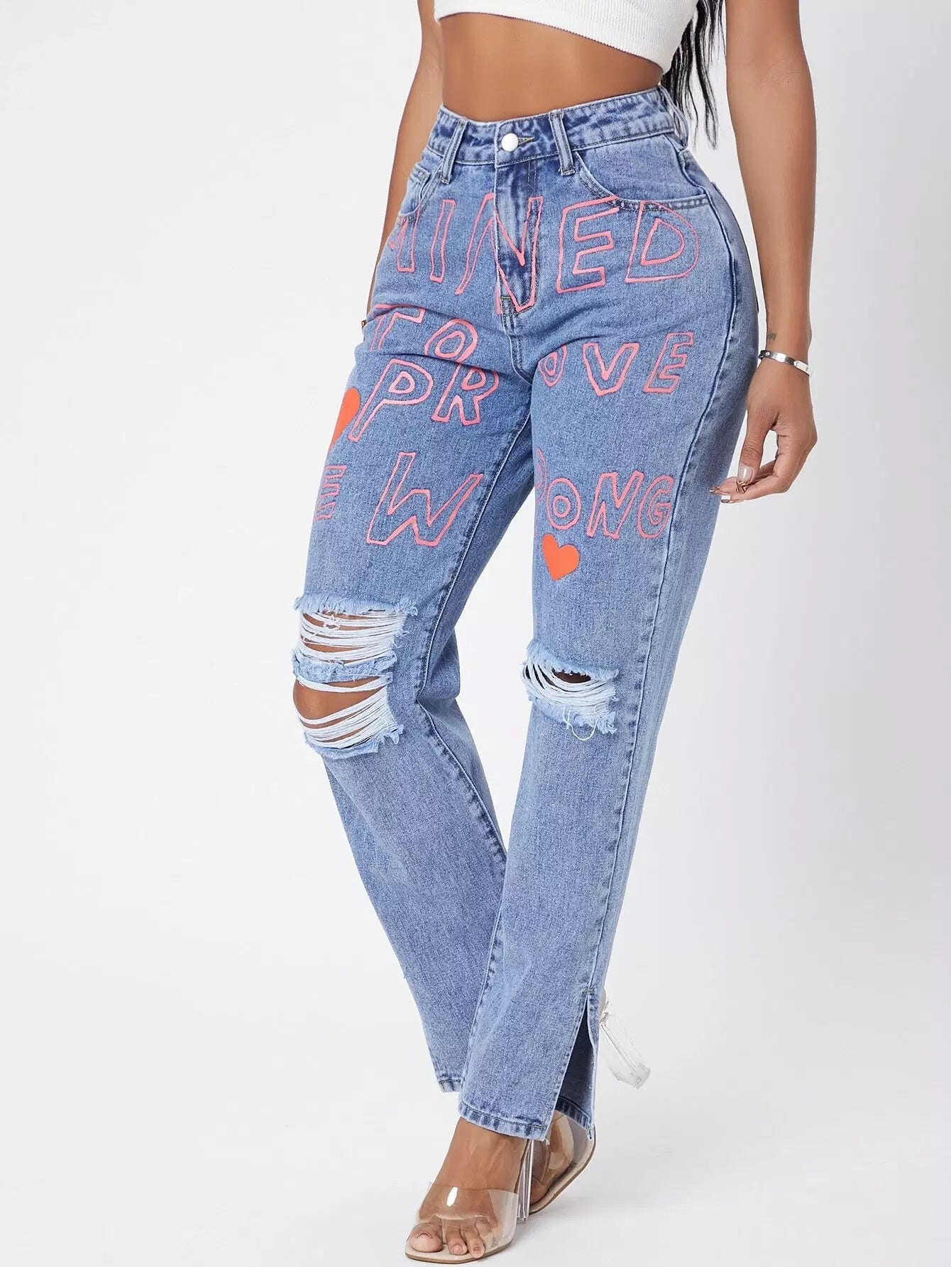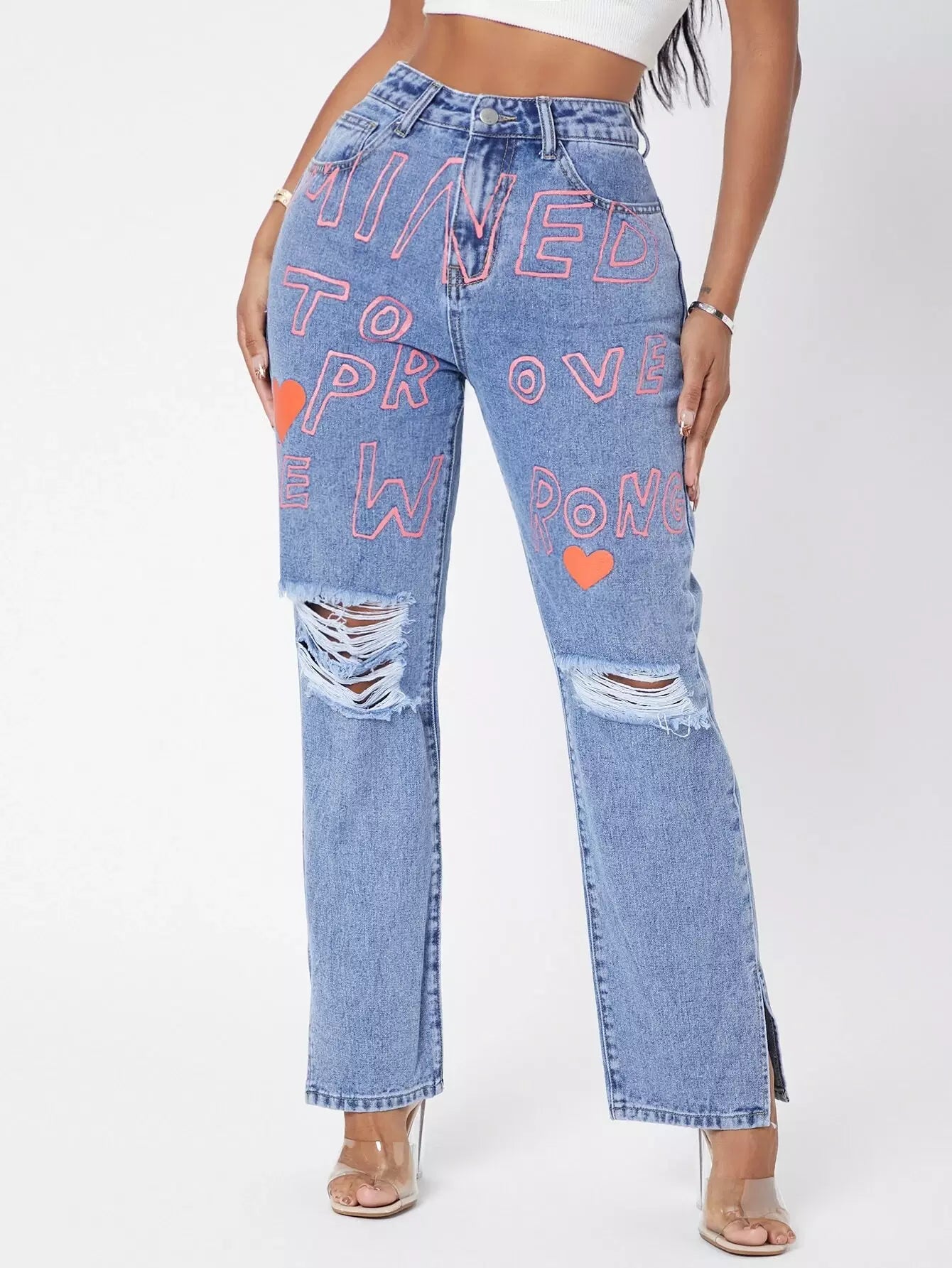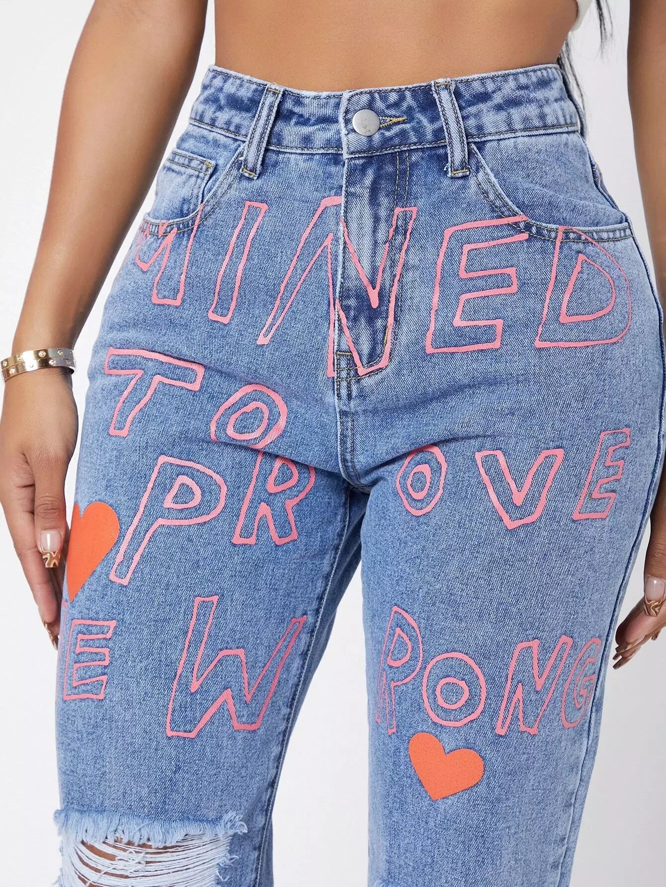 للنساء - بنطال جينز بأرجل مستقيمة وبحواف ممزقة ورسومات عليها أحرف