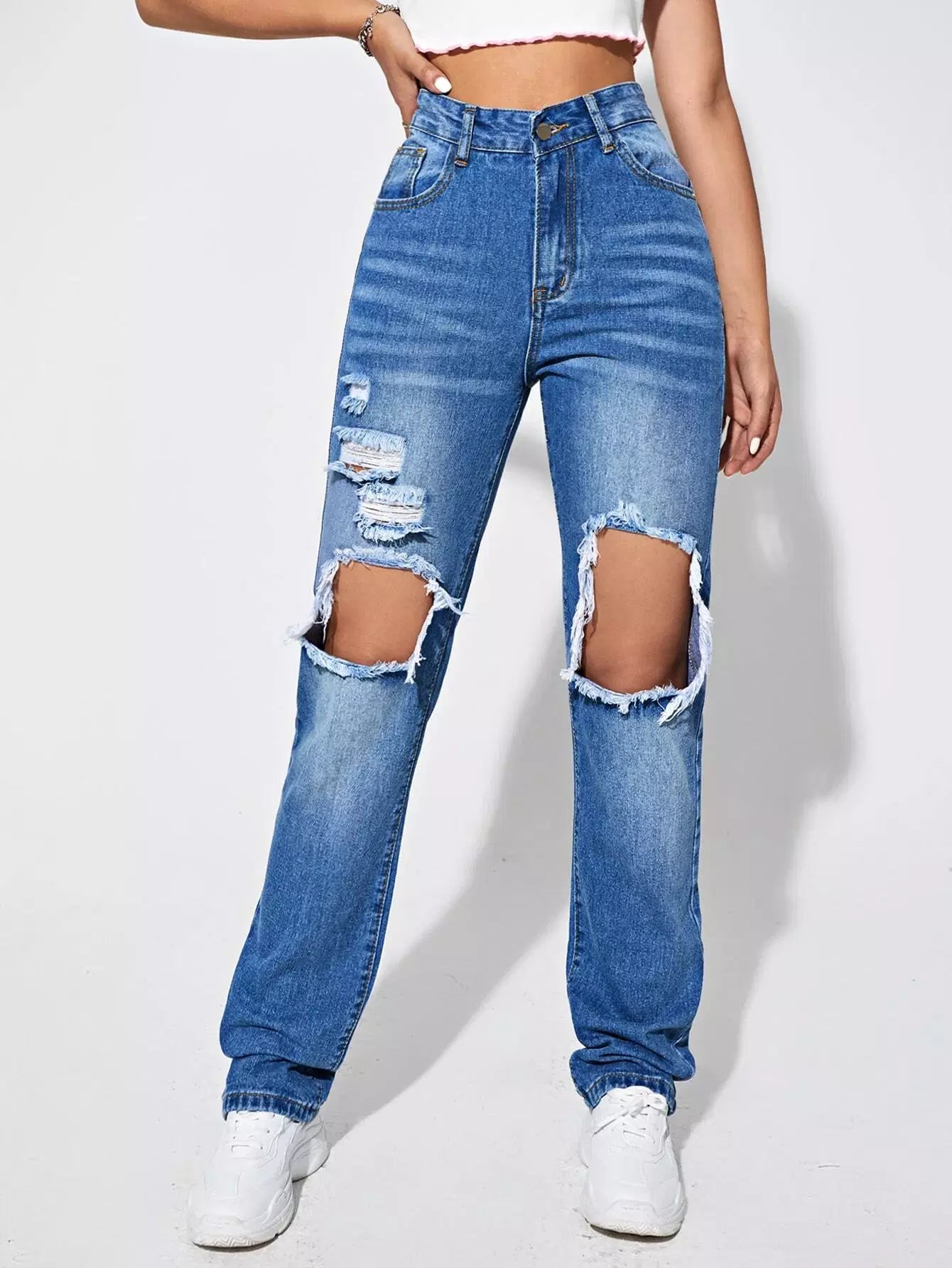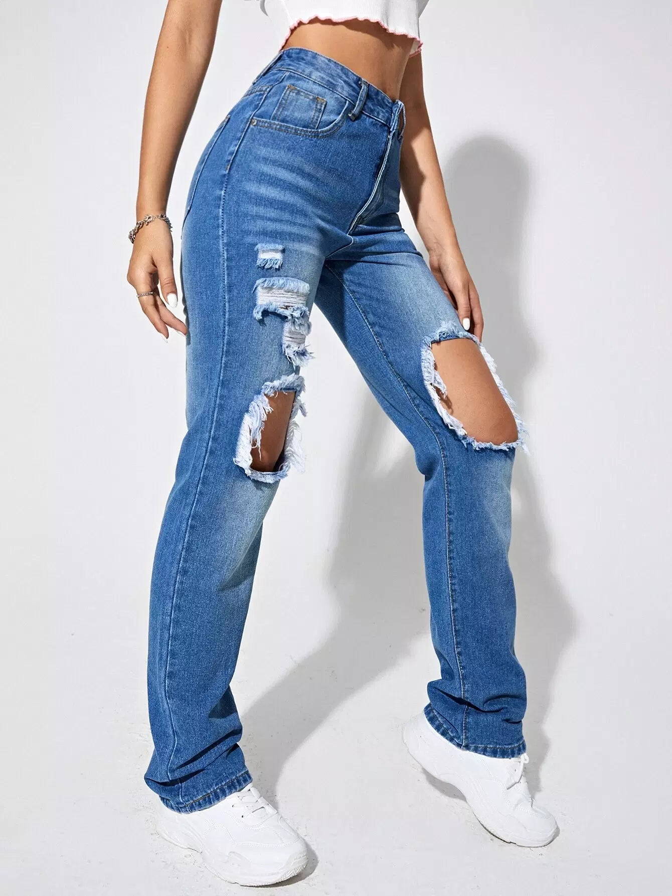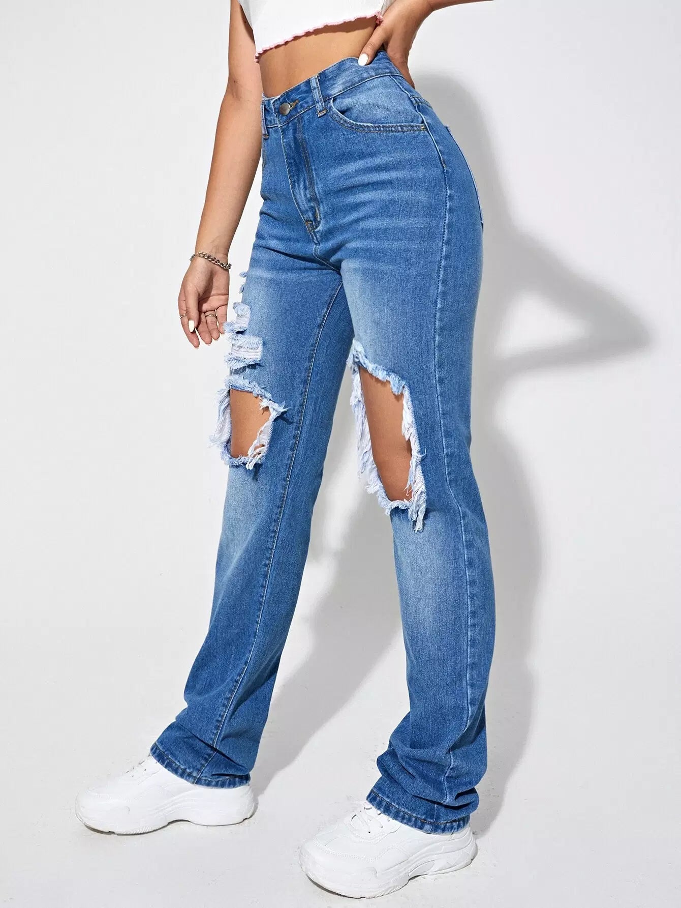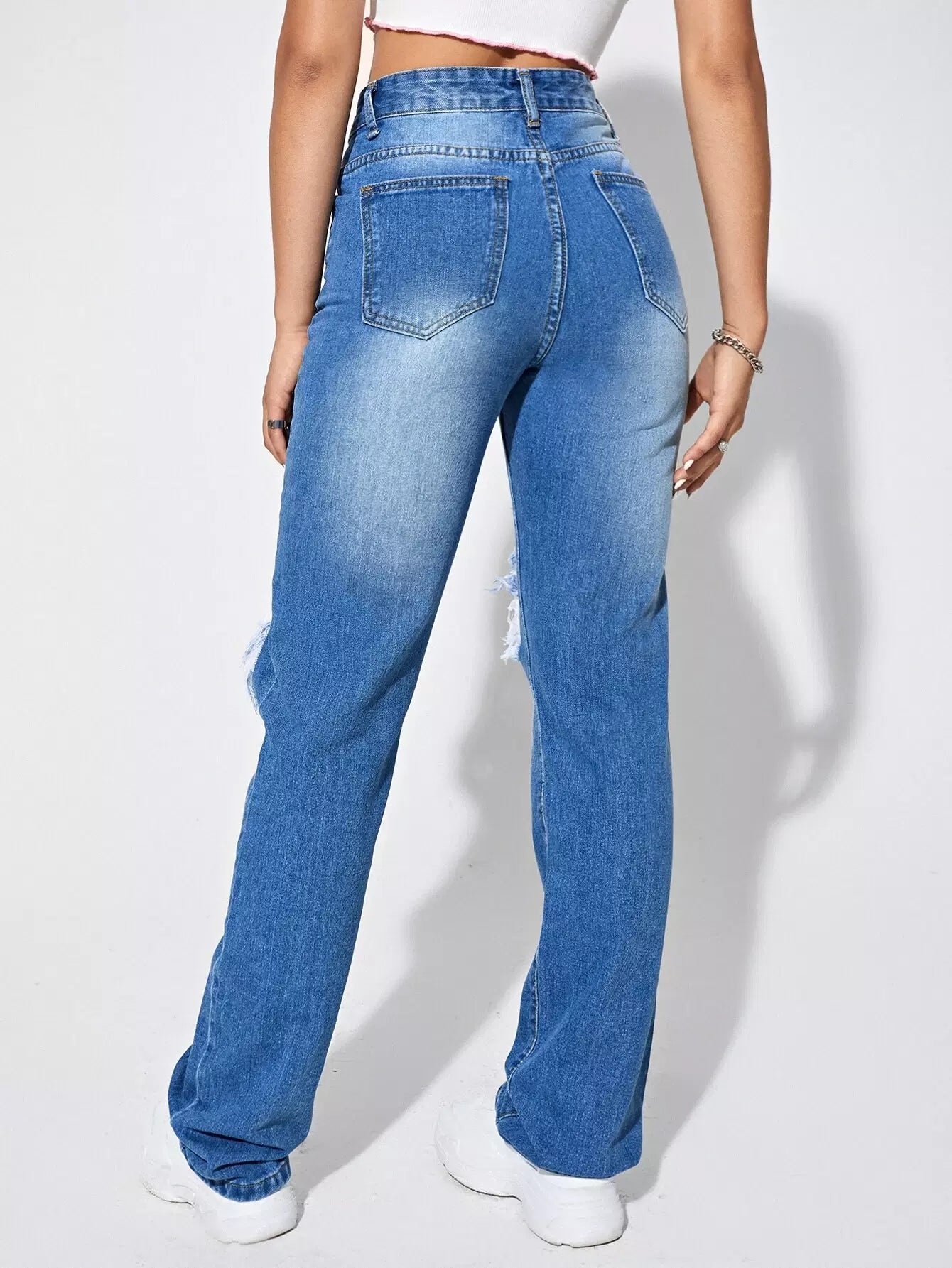 بنطلون جينز جينز ممزق ممزق بغسل خفيف ومغسول فاتح
