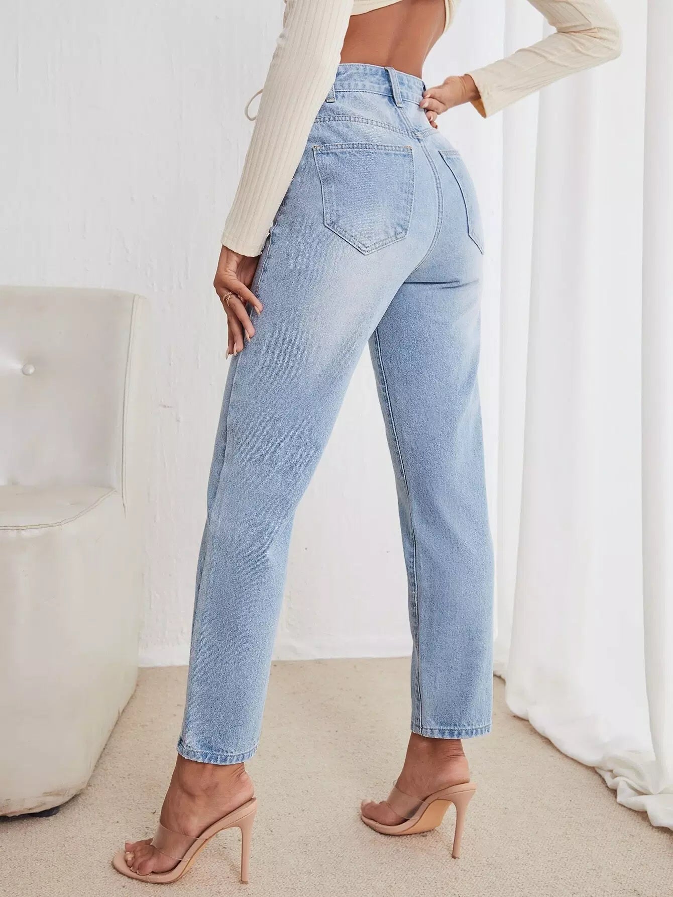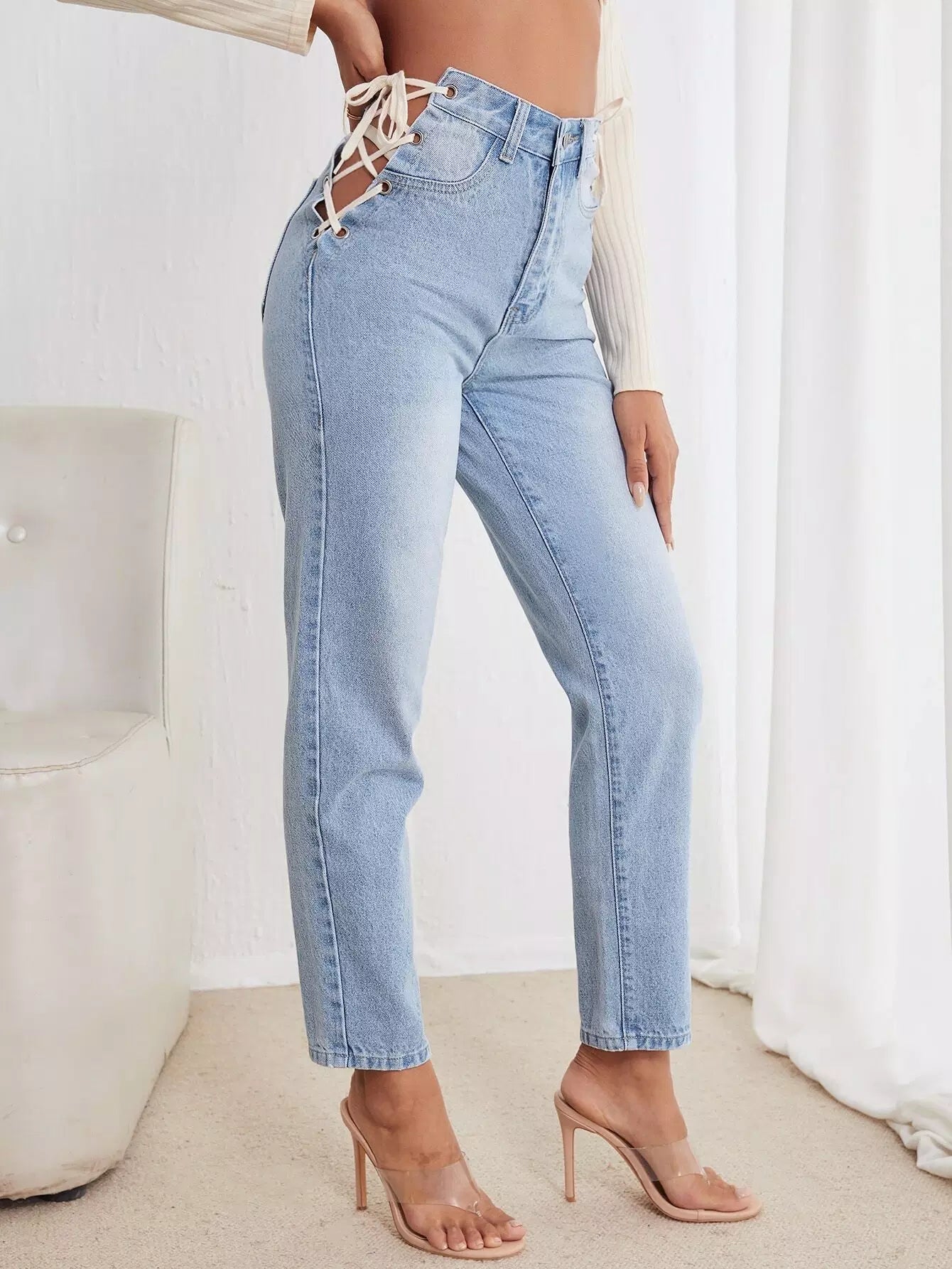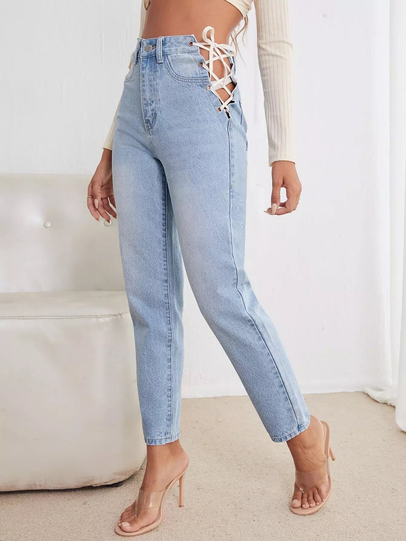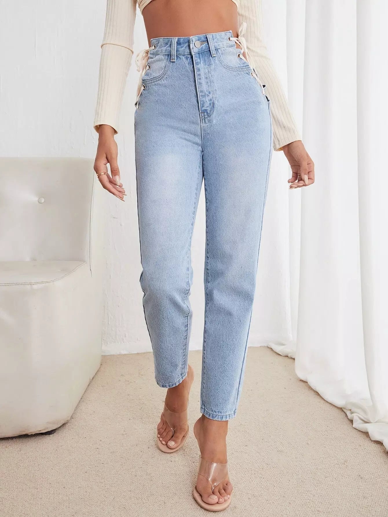 بنطلون جينز جينز الأمهات بأربطة جانبية فاتح اللون فاتح