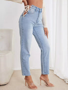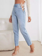 للنساء - بنطال جينز أمي مغسول فاتح اللون ورباط جانبي