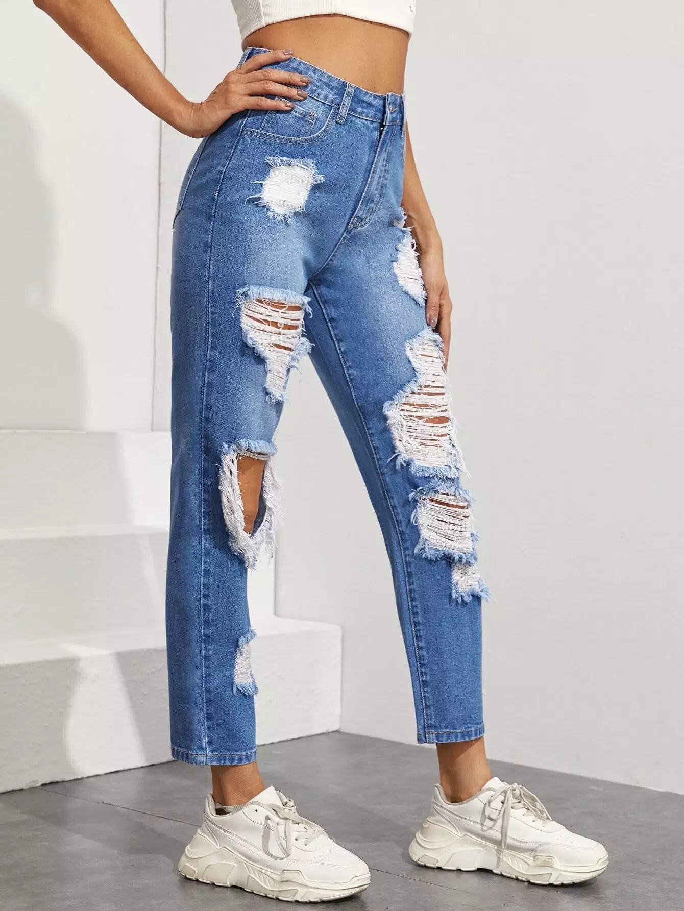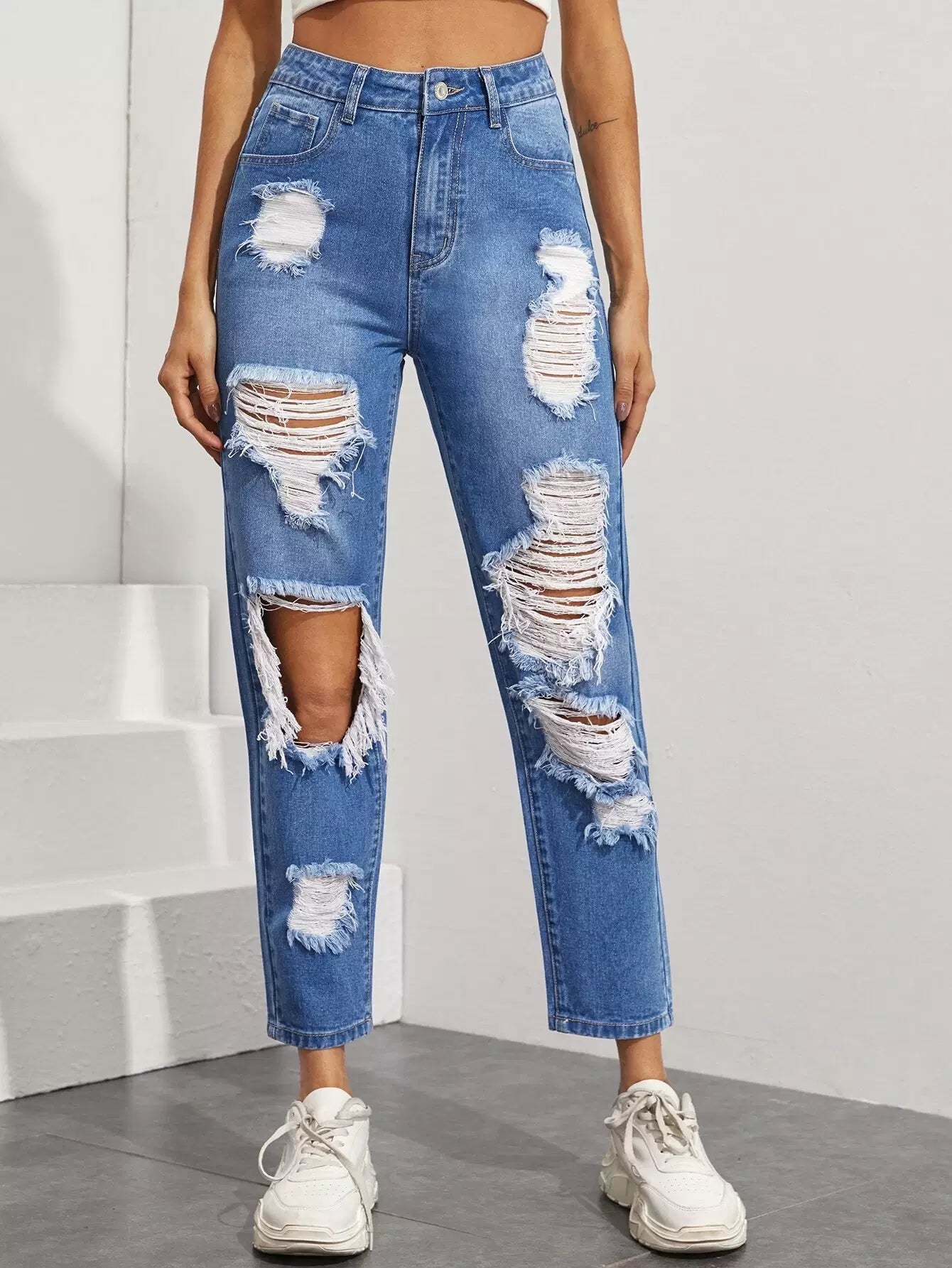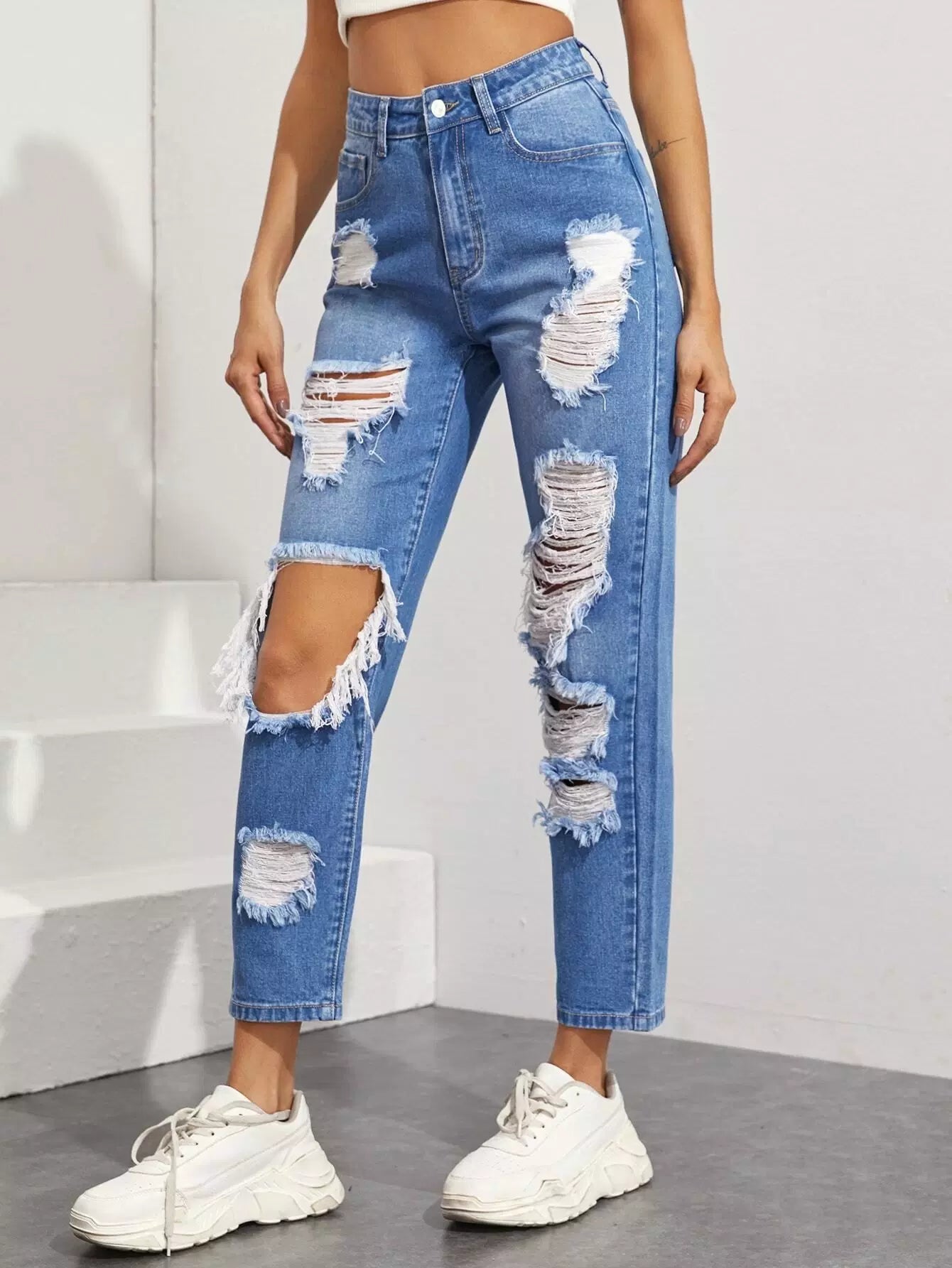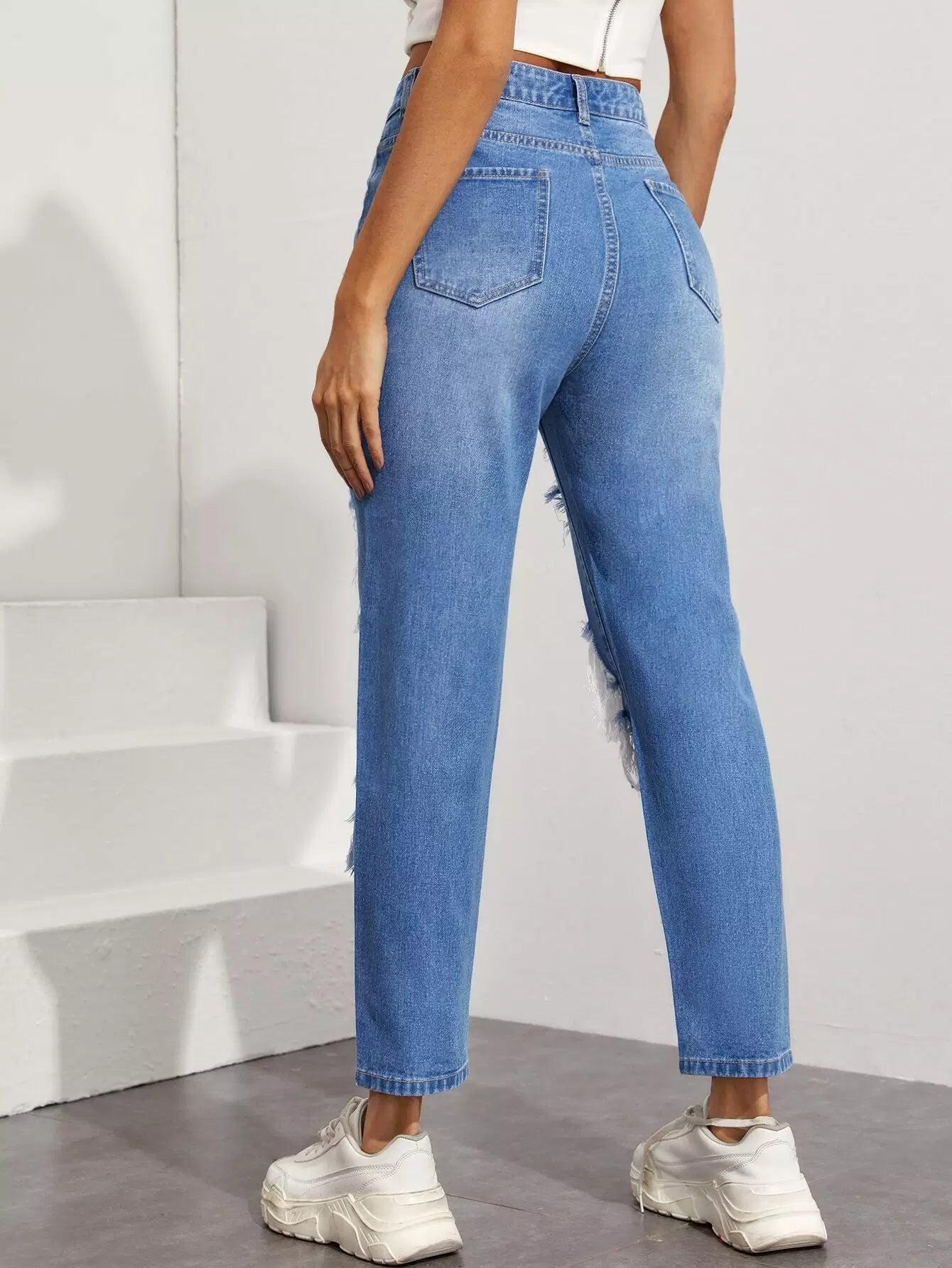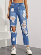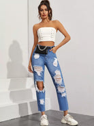 بنطلون جينز ممزق مستقيم الساقين بدون حقيبة